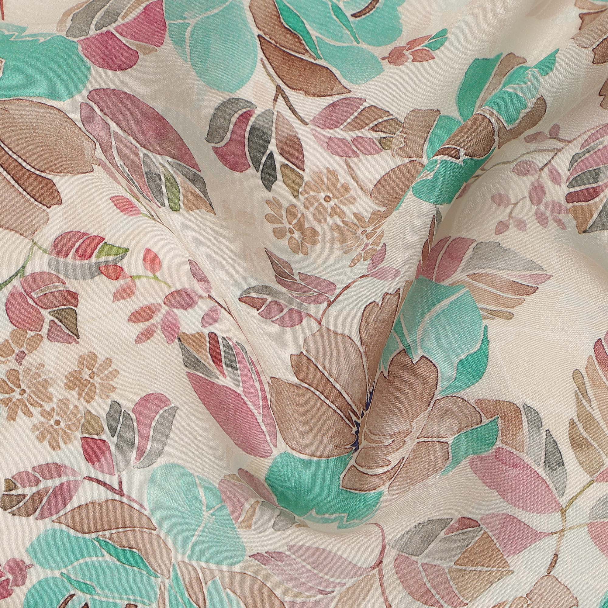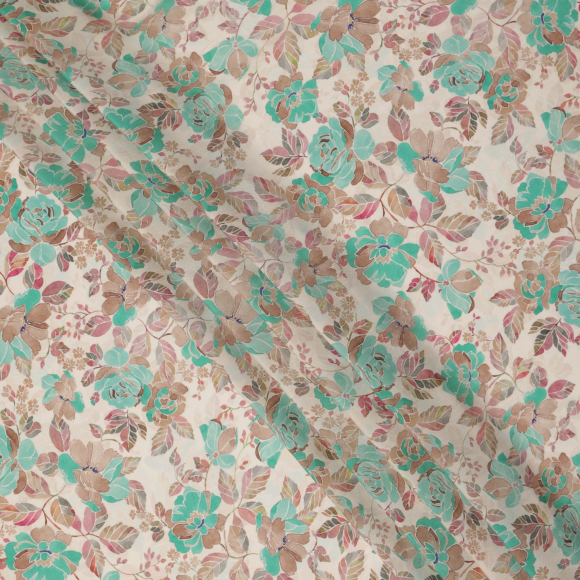 Cream Teal Floral Printed Viscose Crepe Fabric 110 Cms Width India-D27740
