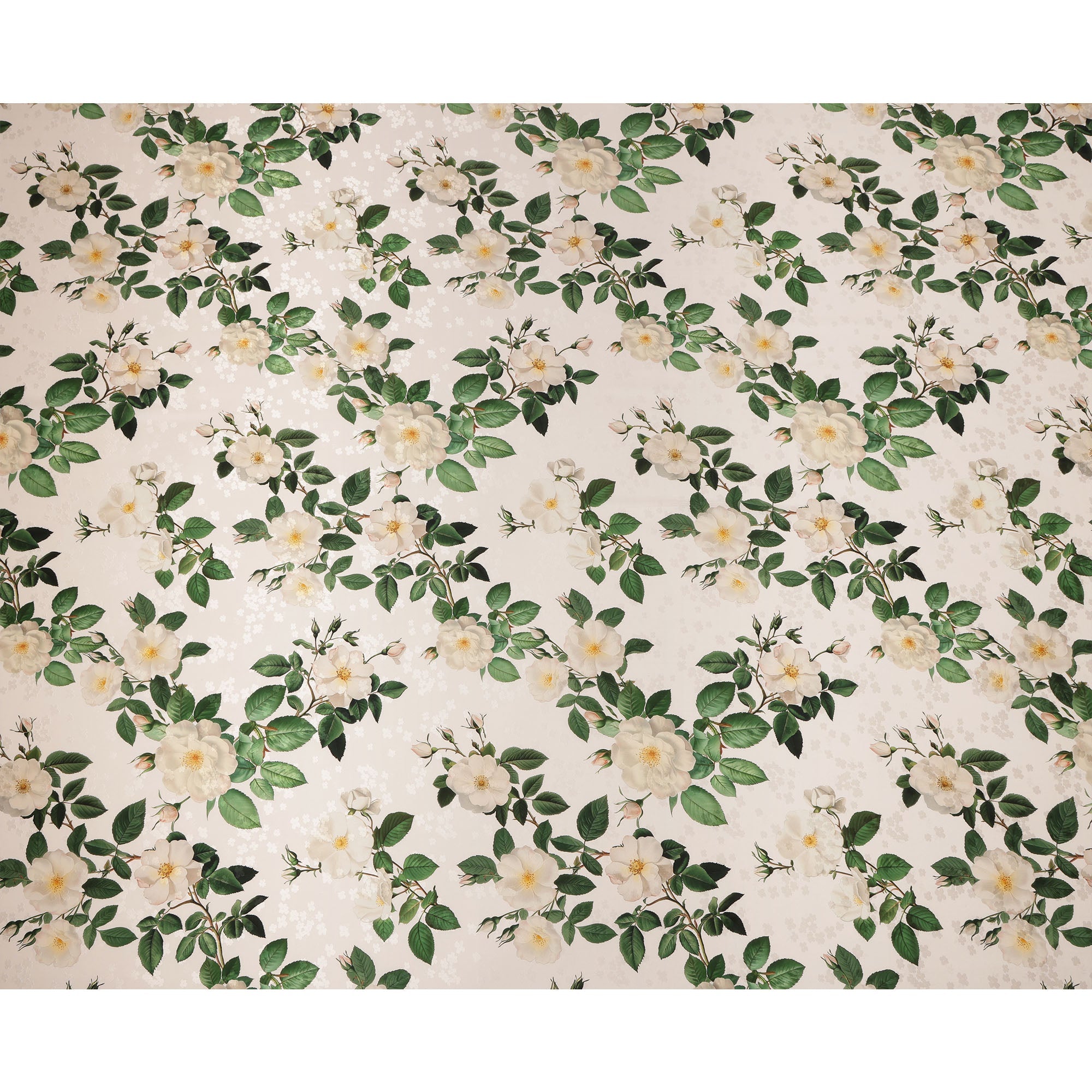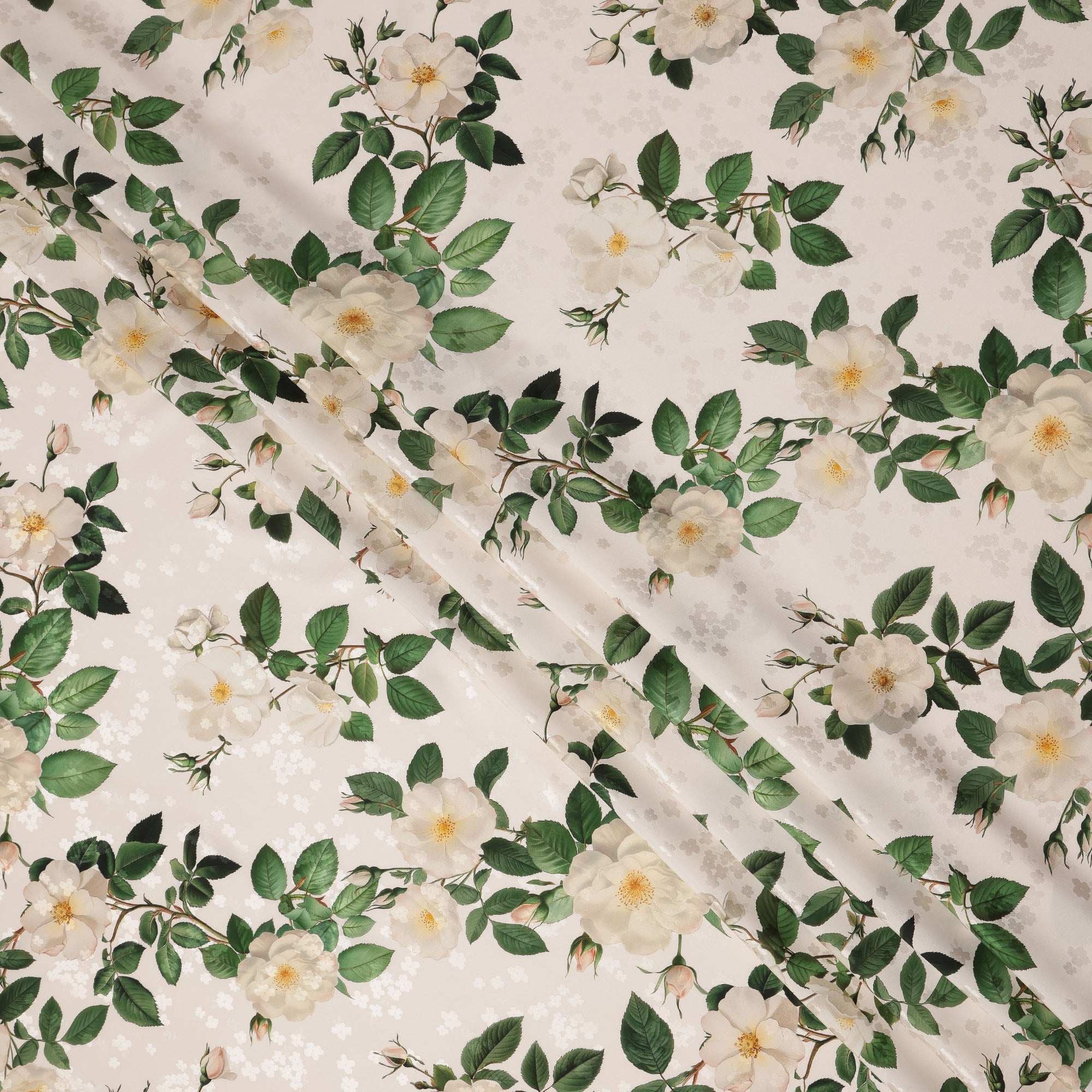 Cream with White and Green Floral Print on Premium Pure Italian Silk Satin Fabric, 140 Cms Width, Italy-D24788