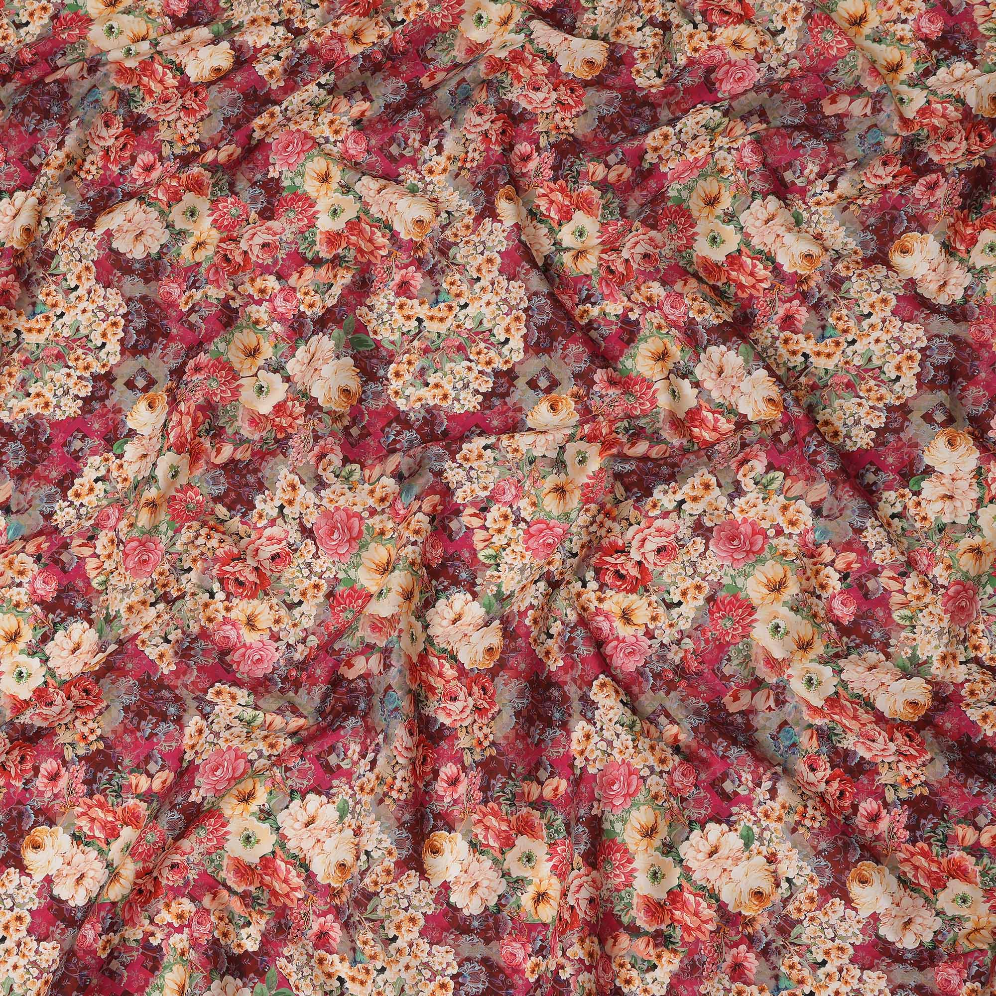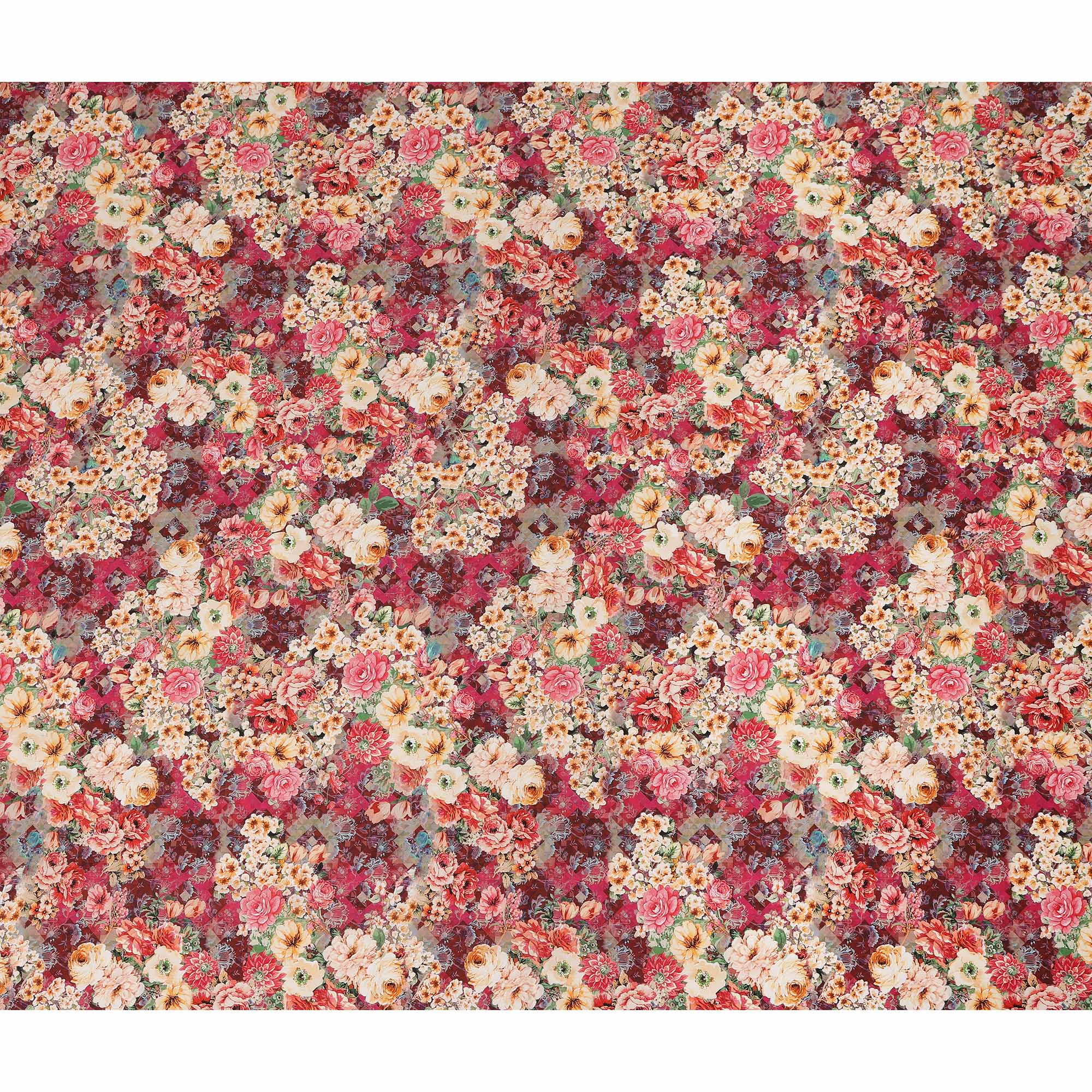 This crimson red multicolor floral bouquet printed cotton satin fabric features a rich and vibrant red base beautifully adorned with abundant blooming florals in shades of peach, ivory, coral, yellow, and soft green foliage layered over a subtle patterned backdrop. The dense floral arrangement creates a luxurious and eye catching aesthetic that blends vintage charm with festive elegance. Crafted from premium cotton satin, the fabric offers a smooth and silky surface with a gentle natural sheen that enhances the depth and vibrancy of the print. With a width of 110 cms, it provides excellent versatility for dresses, kurtis, skirts, blouses, festive wear, and statement ethnic ensembles. The breathable cotton composition ensures comfort for extended wear, while the satin weave delivers a graceful drape and refined finish, making it an ideal choice for designers and sewing enthusiasts seeking high quality fabric from India.