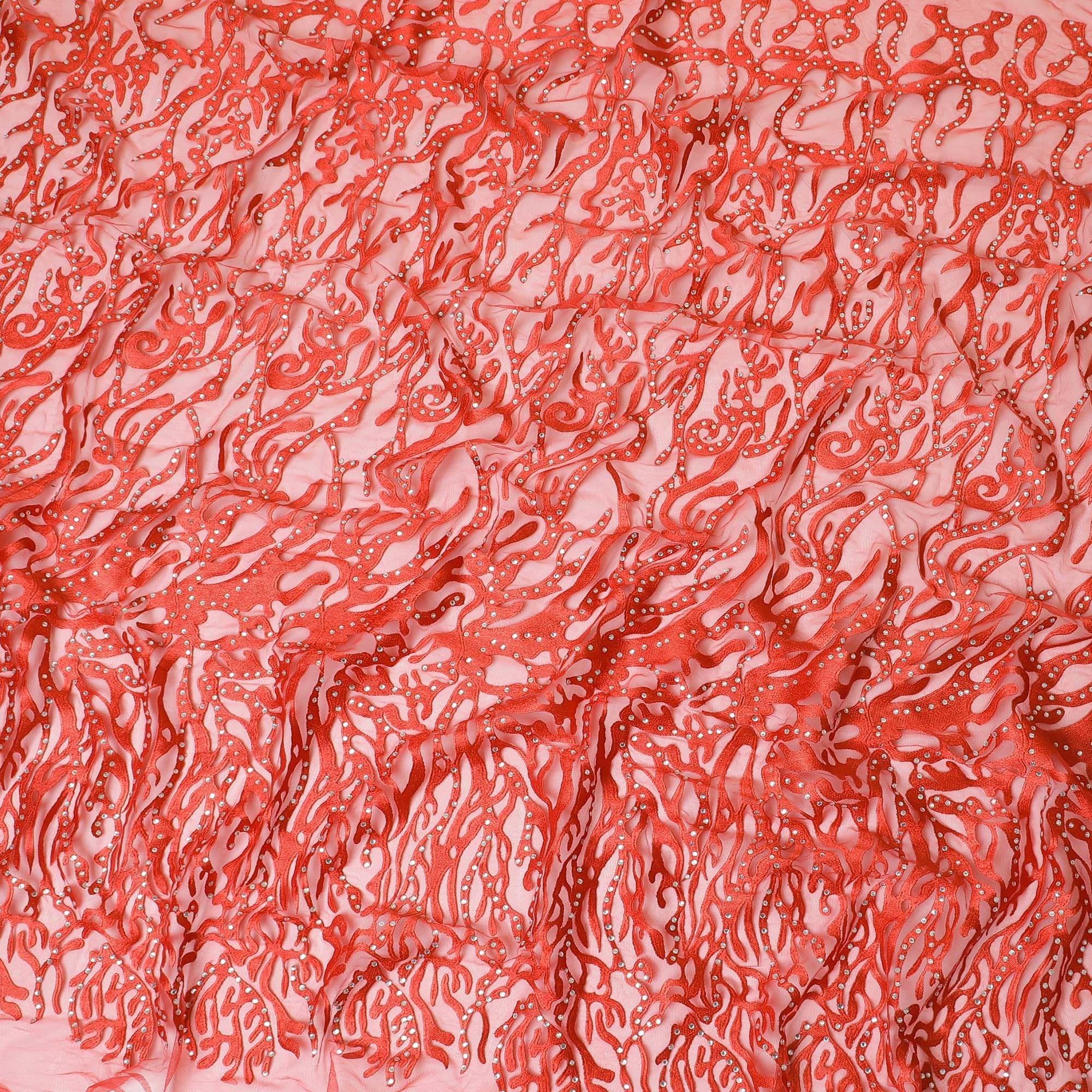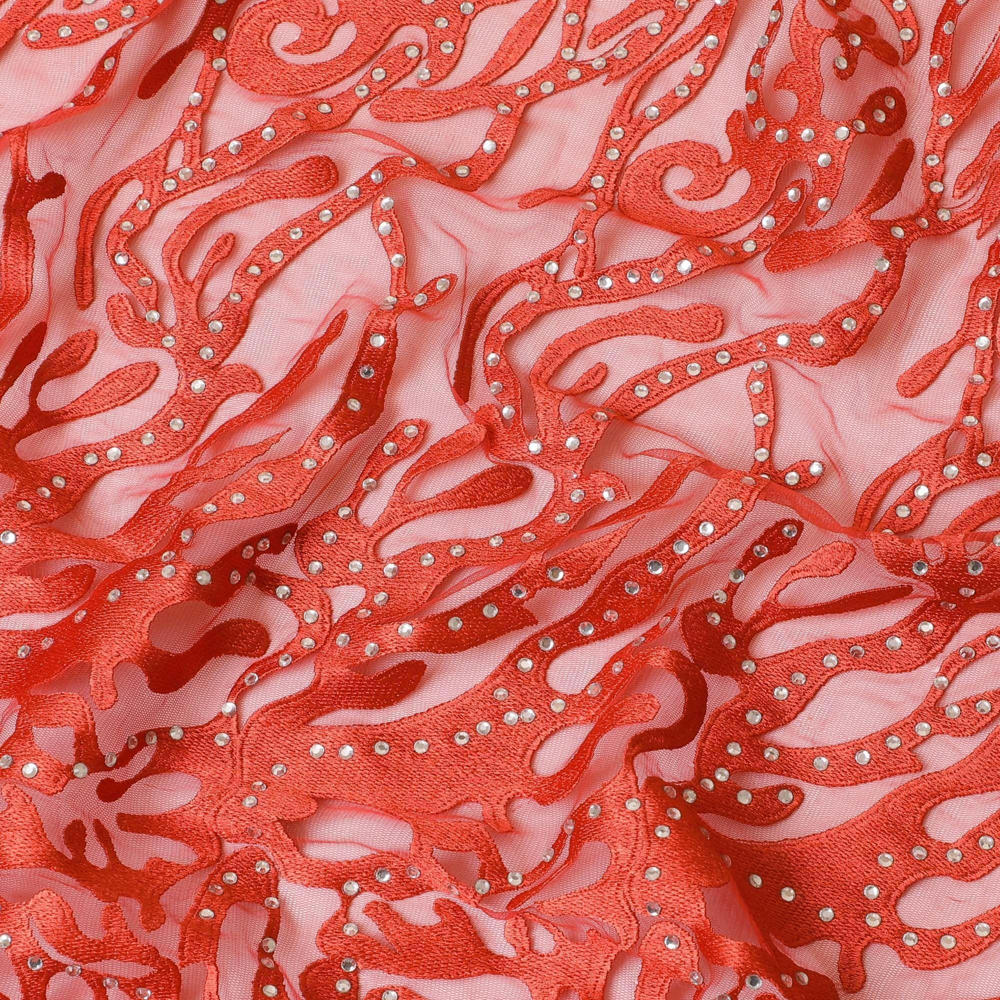 Crimson red nylon tulle fabric with same tone embroidery having stone work in fancy design-D7734