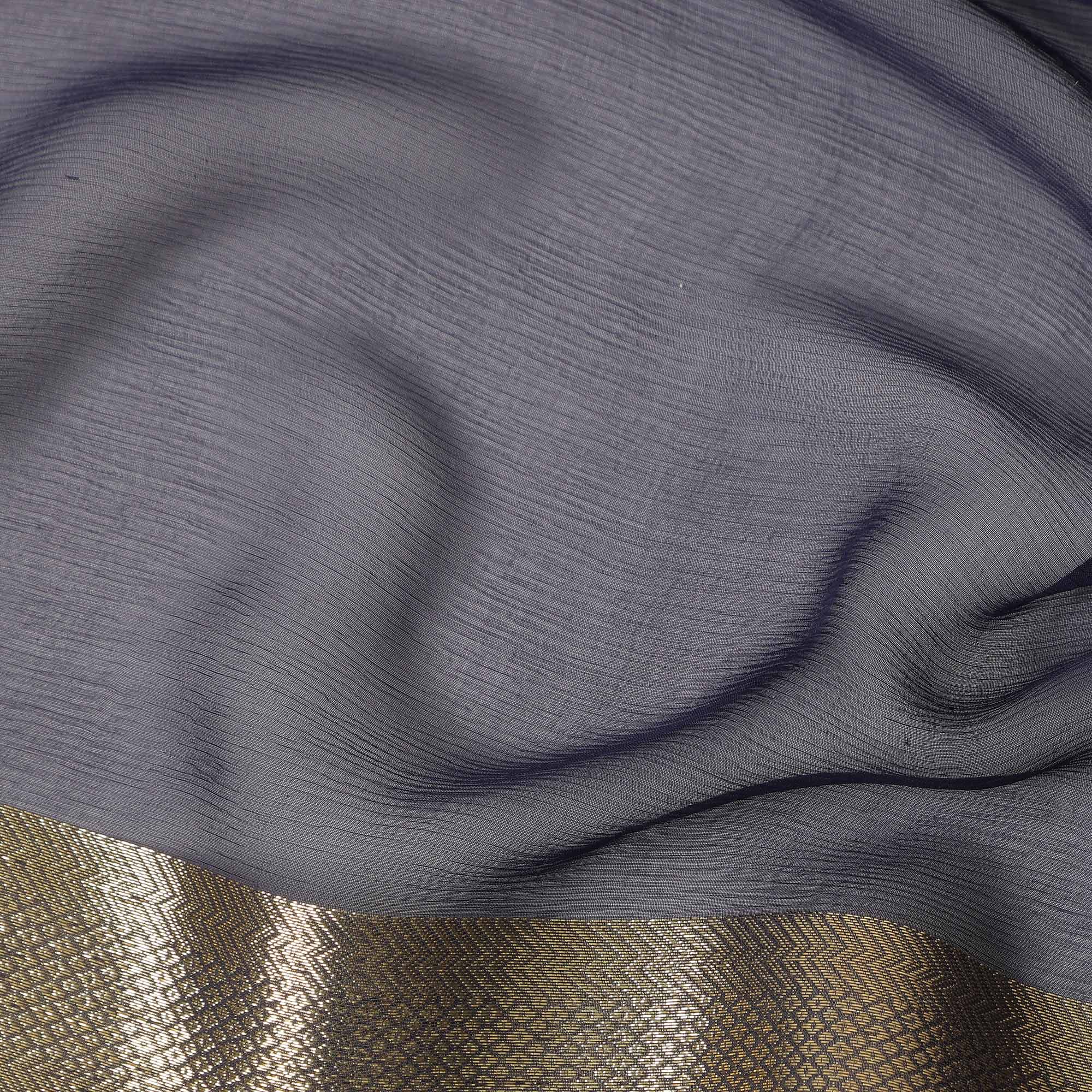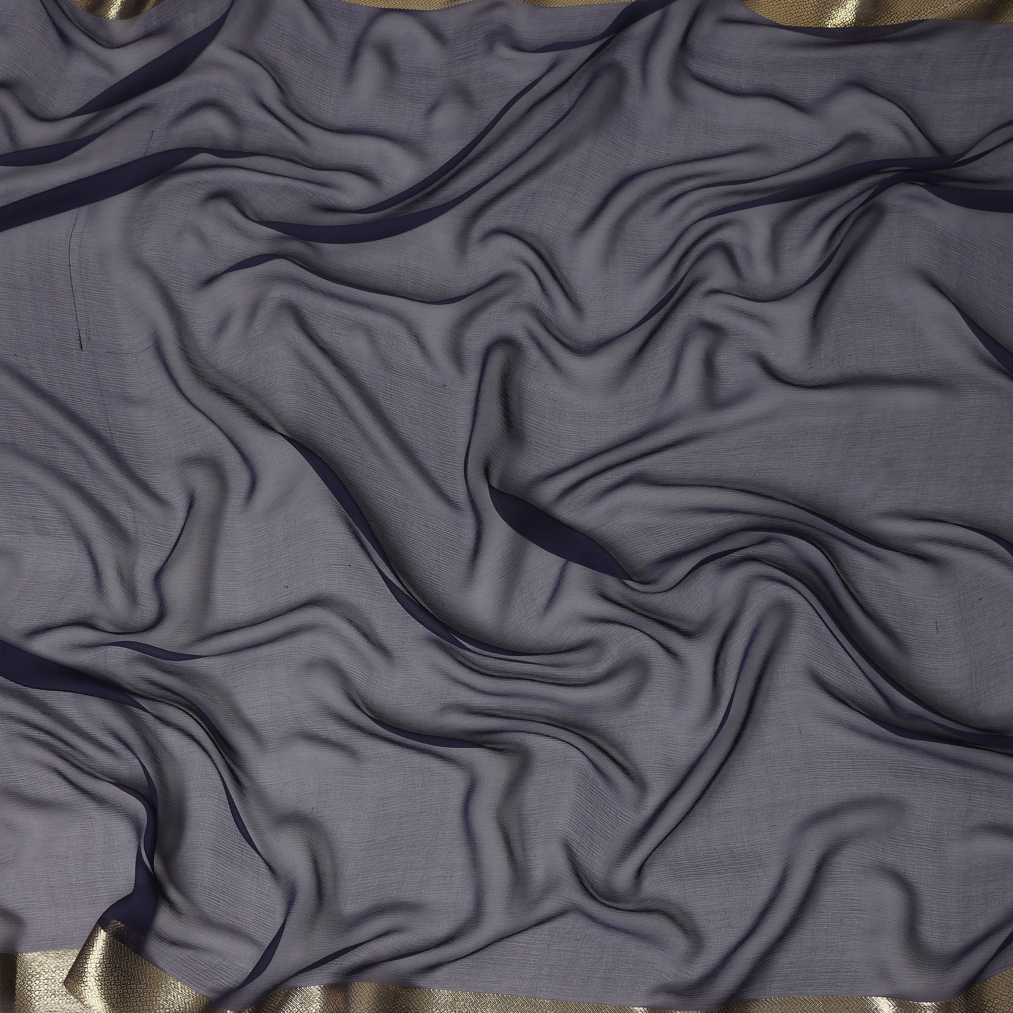 Dark Blue Wrinkle Silk Chiffon Fabric with Golden Border Stripe Lightweight Sheer Textured Fabric for Sarees Dresses Dupattas and Crafts 110 Cms Wide South Korea Origin-D27664