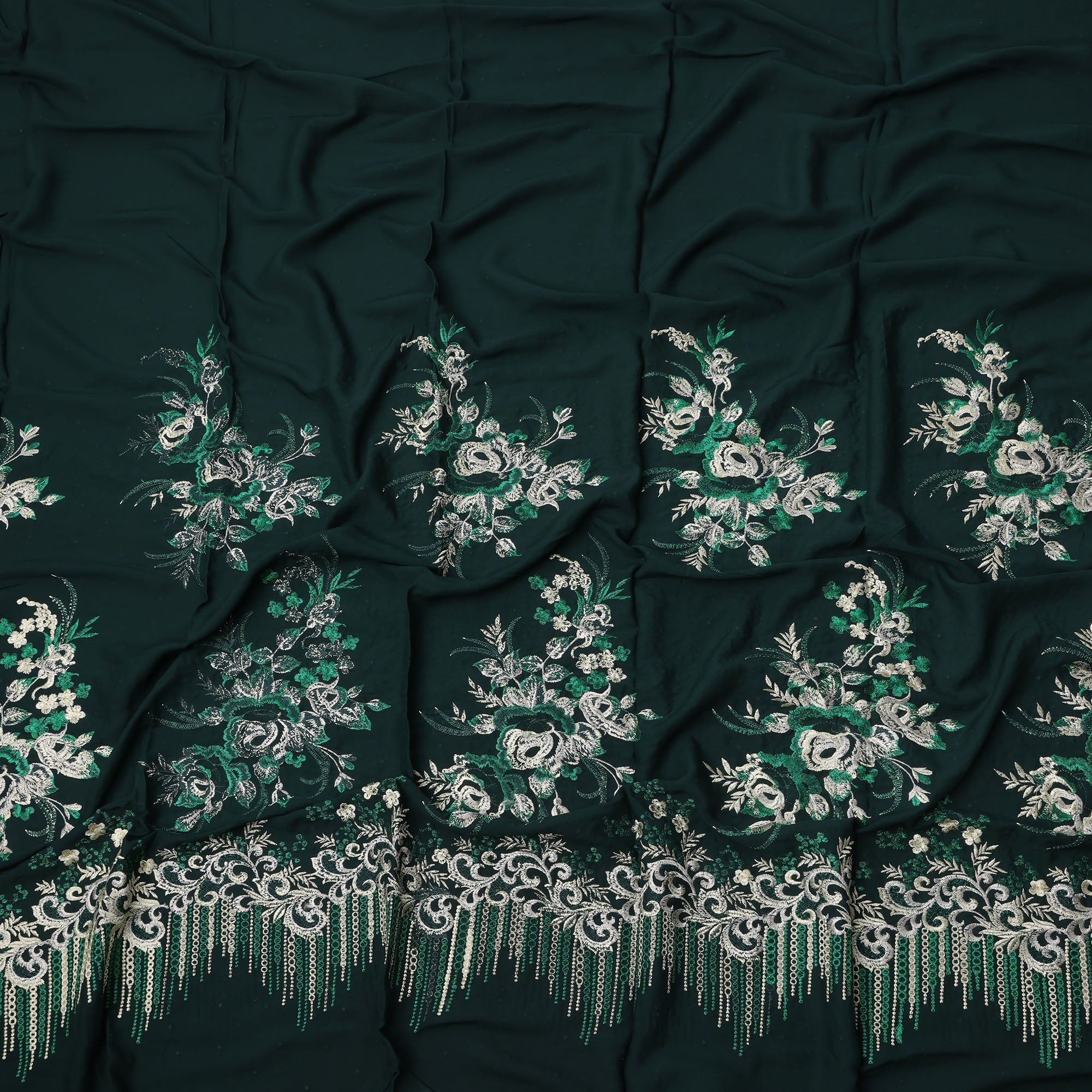 Dark Green Cotton Fabric with Floral Thread & Sequin Embroidery Design, 140 Cms Width, 3 Meters Piece, Made in India-D23672