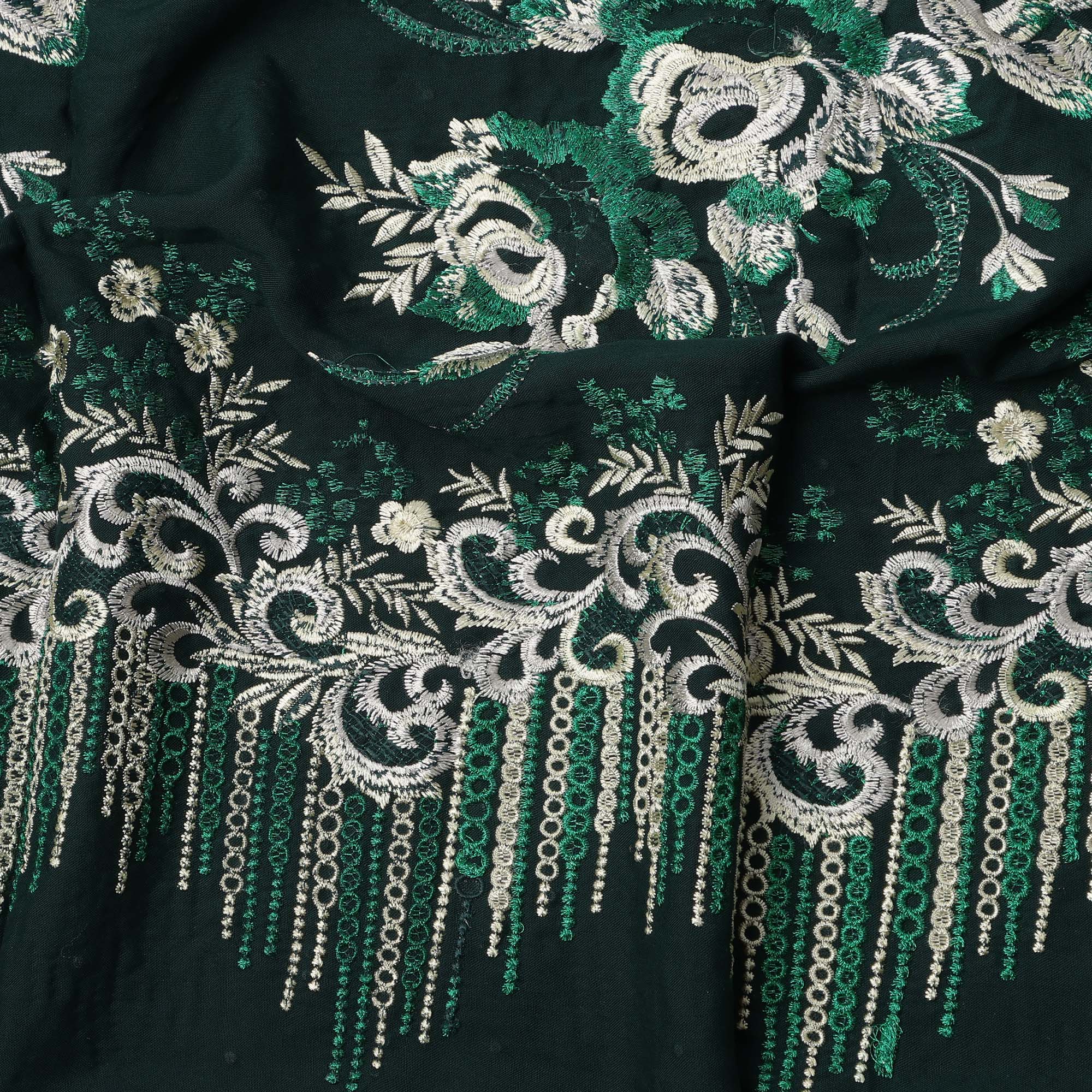• Dark Green Cotton Fabric with Floral Thread & Sequin Embroidery Design, 140 Cms Width, 3 Meters Piece, Made in India-D23672