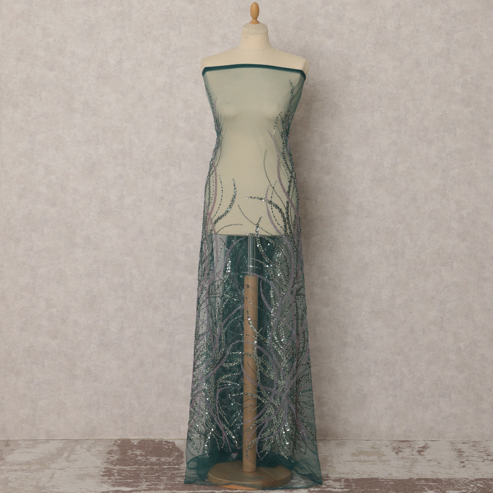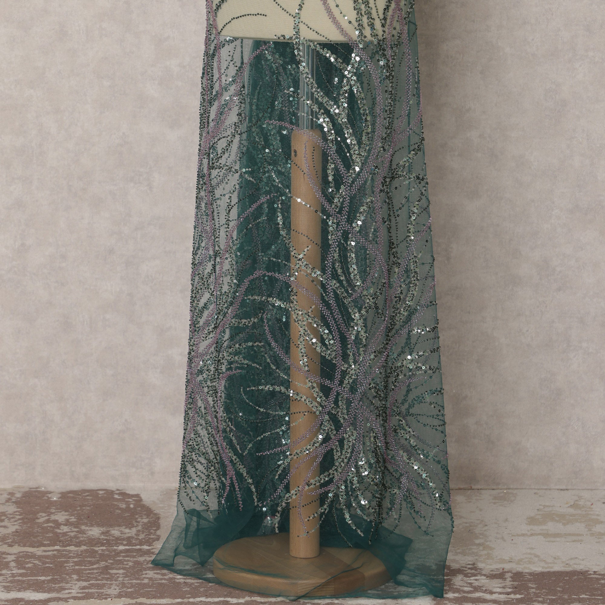 This exquisite dark green embroidered nylon tulle fabric is a masterpiece of elegance and craftsmanship. Adorned with shimmering sequins and intricate embroidery, this sheer and lightweight fabric adds a regal touch to any outfit. The delicate embellishments create a mesmerizing flowy effect, making it ideal for high-fashion couture, bridal wear, evening gowns, lehengas, and designer outfits. With a width of 135 cm and a generous length of 3.5 meters, it provides ample material for stunning creations. The rich dark green hue enhances the luxurious appeal, making it perfect for special occasions. Whether designing a statement dress or elegant overlays, this fabric ensures a refined and sophisticated look. Handle with care and dry clean only to preserve its intricate details and shimmering finish.