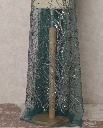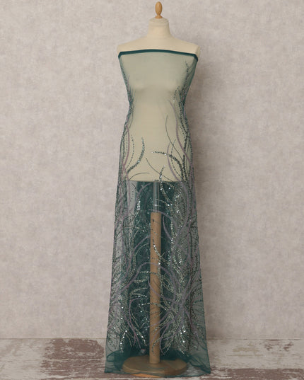 Dark Green Embroidered Nylon Tulle Fabric with Sequin Work, 3.5 Mtrs, 135 Cms, China-D22358