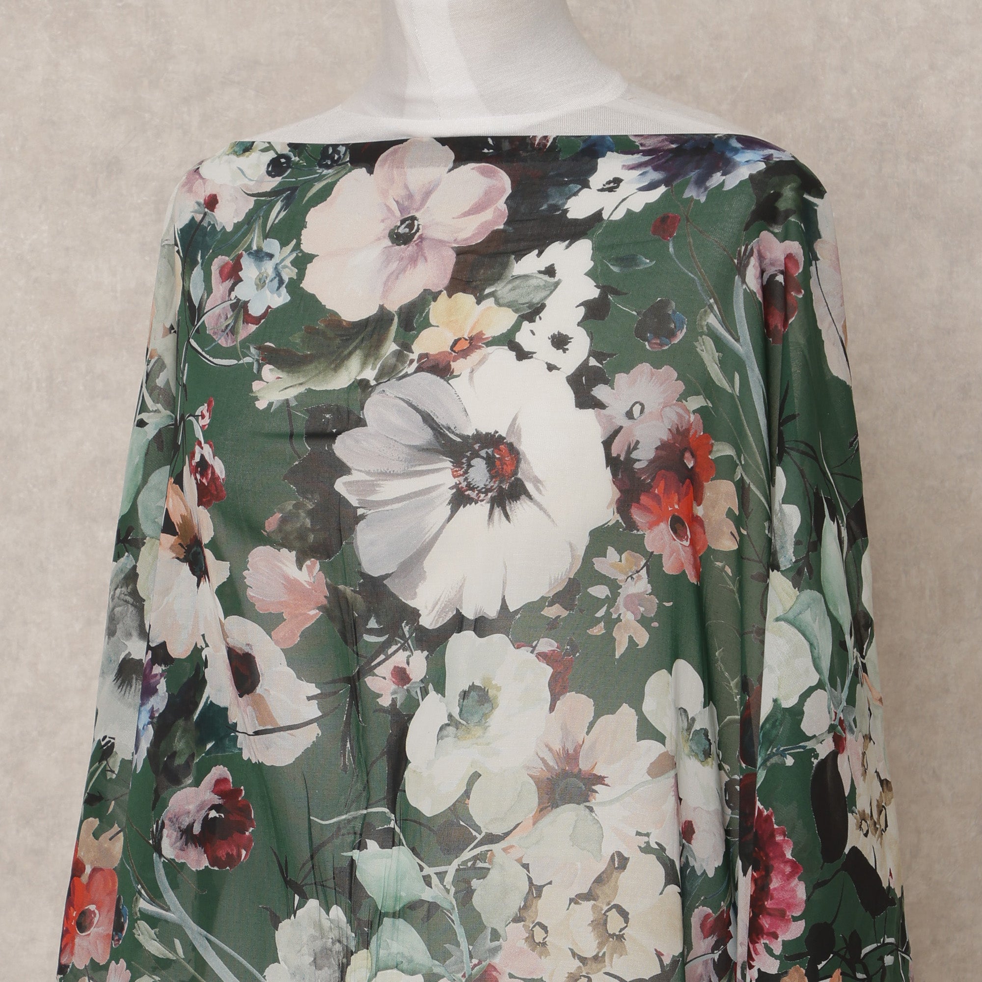 Dark Green & White Floral Traditional Somali Cotton Voile Dirac Fabric, 3.5 Mtrs, Width 140 Cms, Made in Italy-D24724