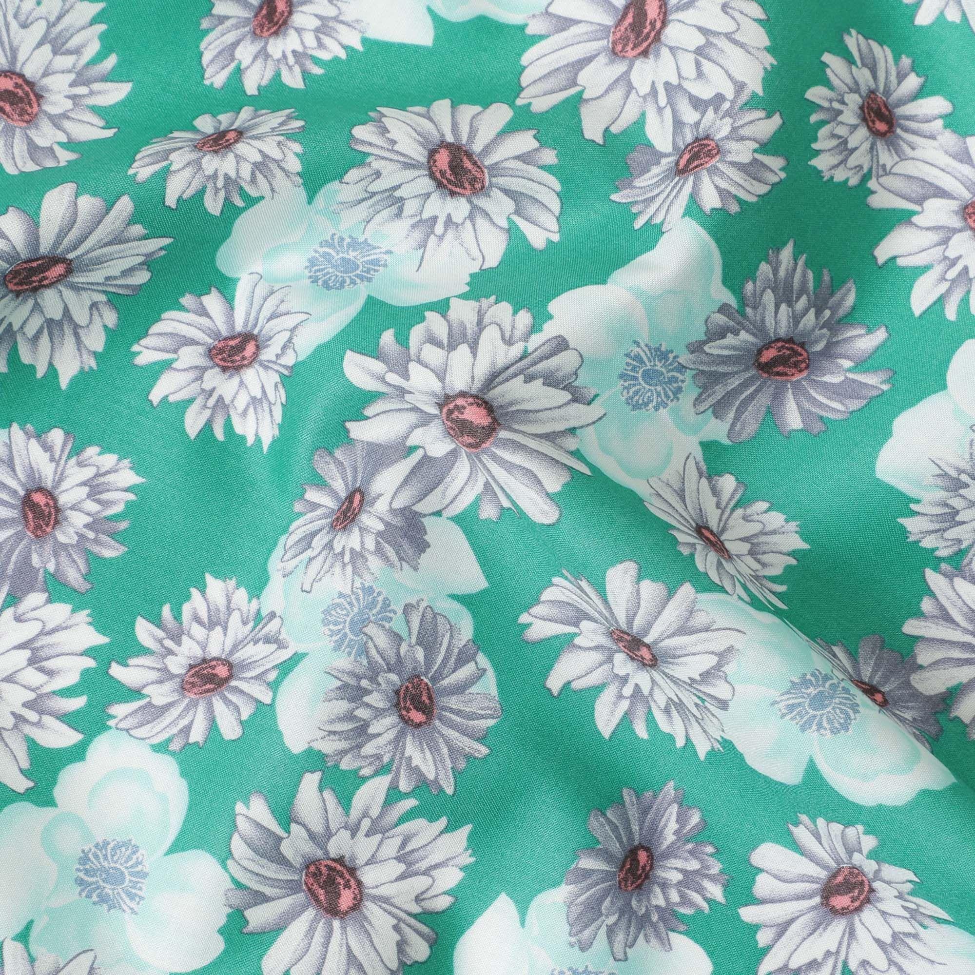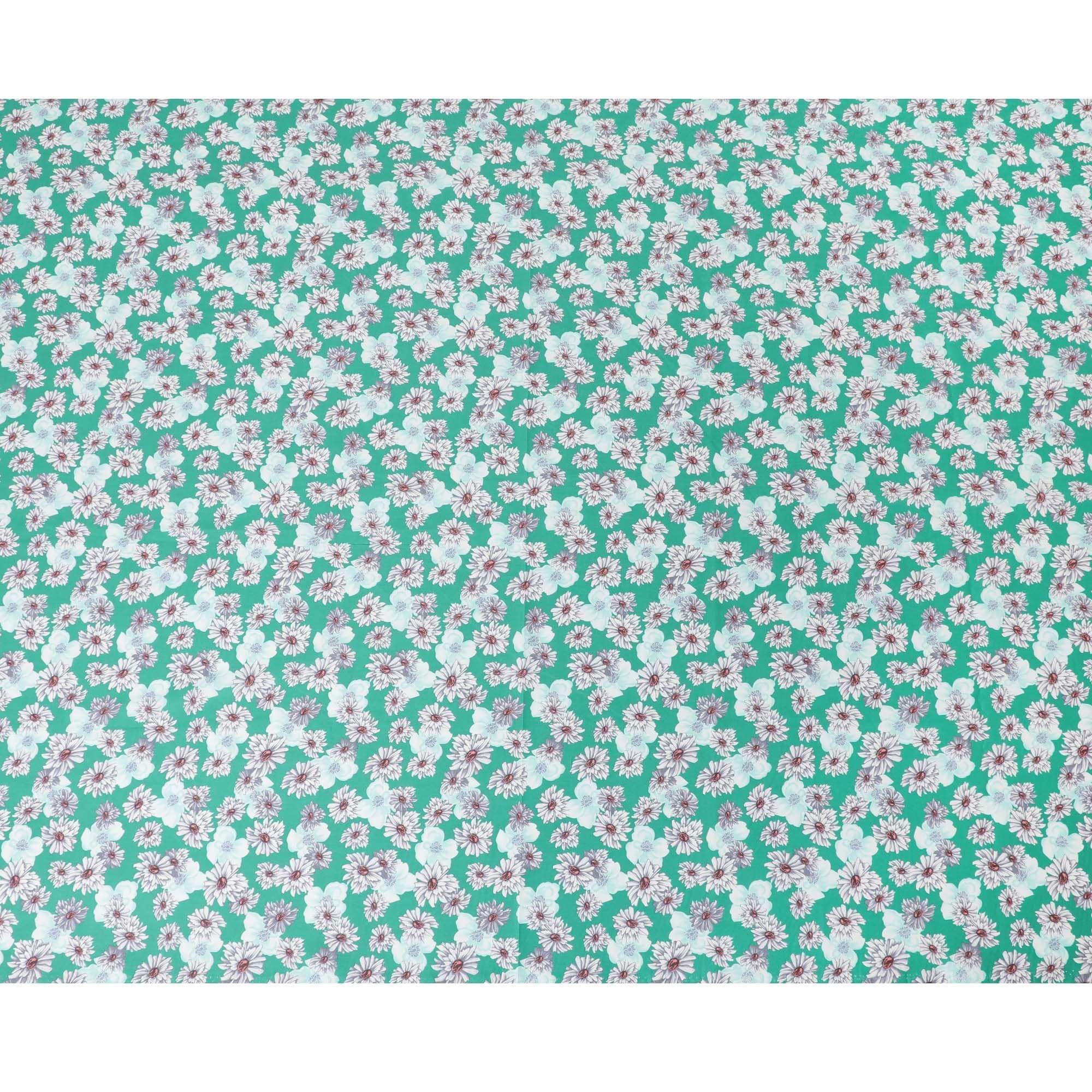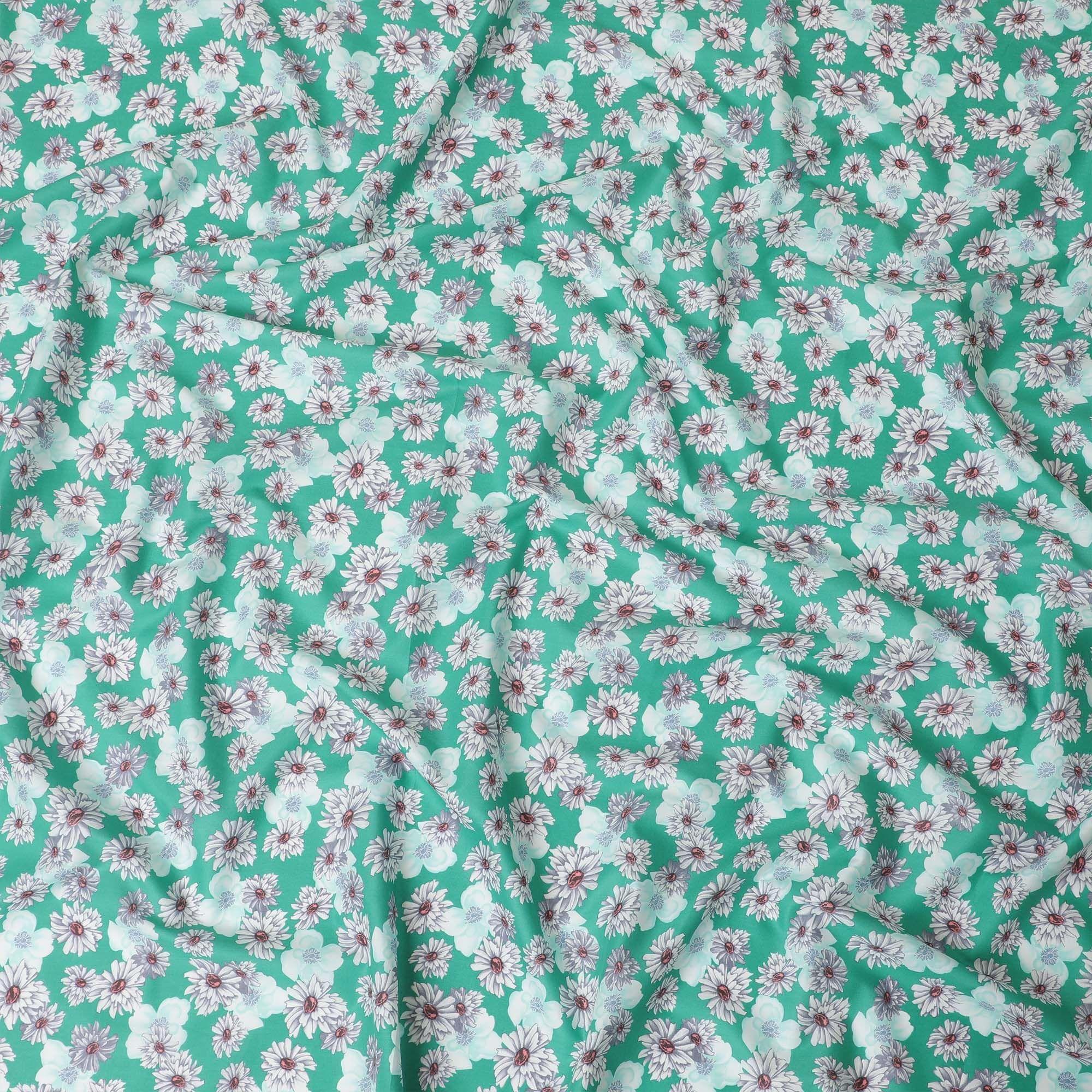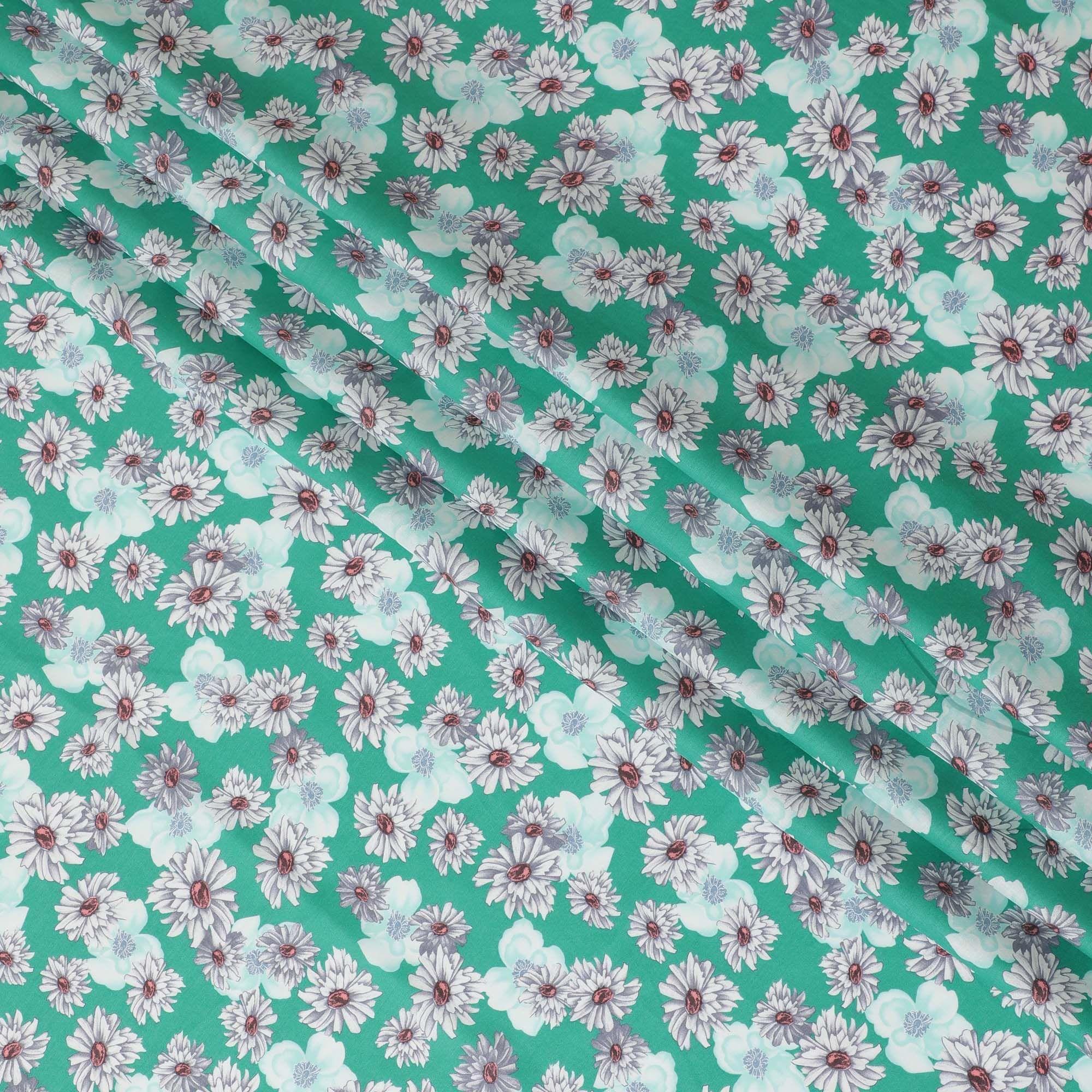 Dark Jade green cotton lawn fabric with off white, silver grey and turquoise blue print in floral design-D10847