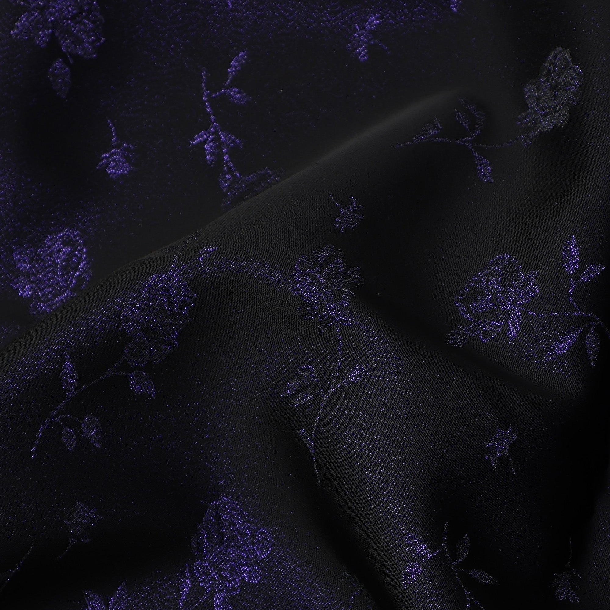 Dark purple pure silk satin fabric with intricate floral jacquard design