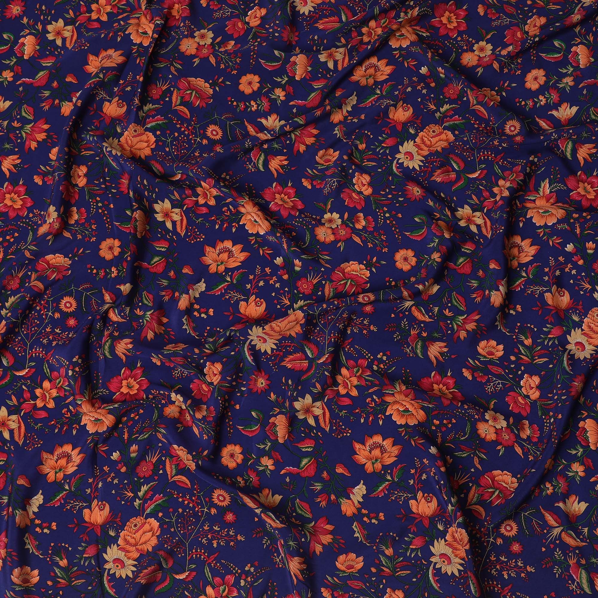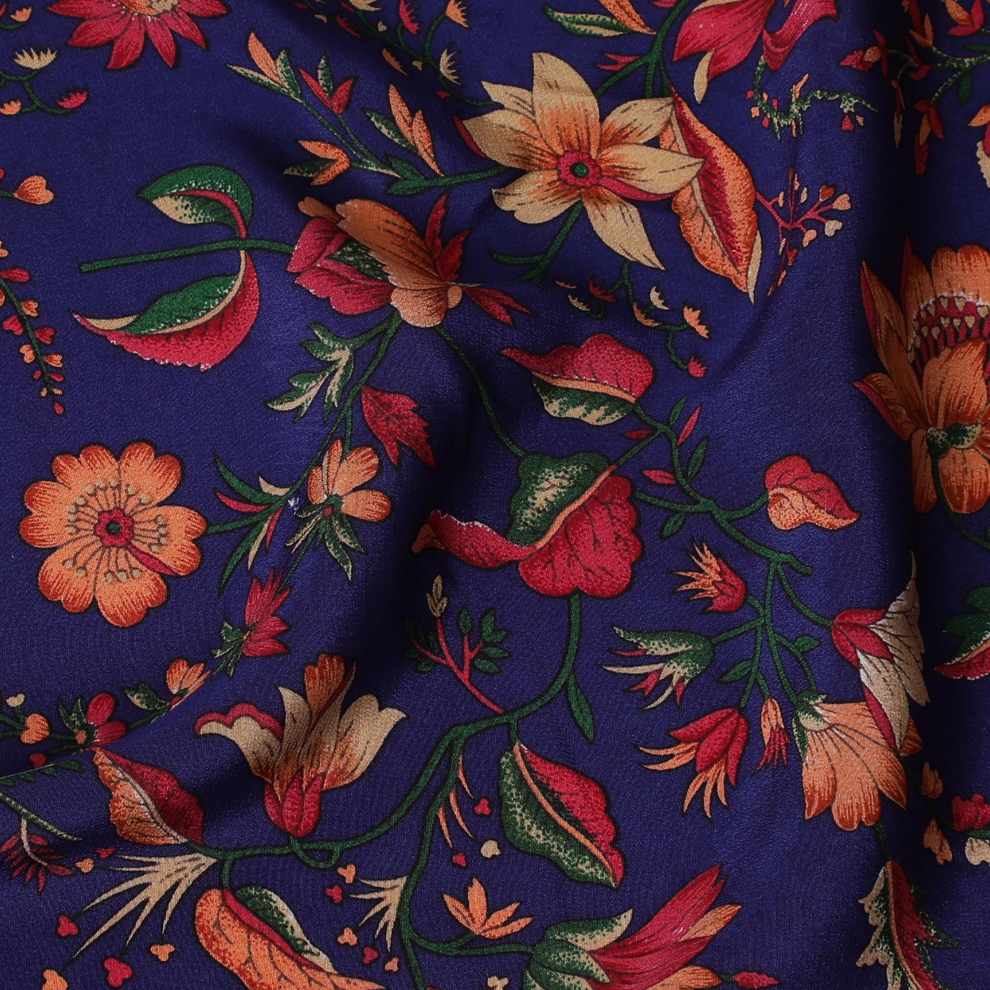 Dark royal blue Premium pure silk crepe fabric with multicolor print in floral design-D17192