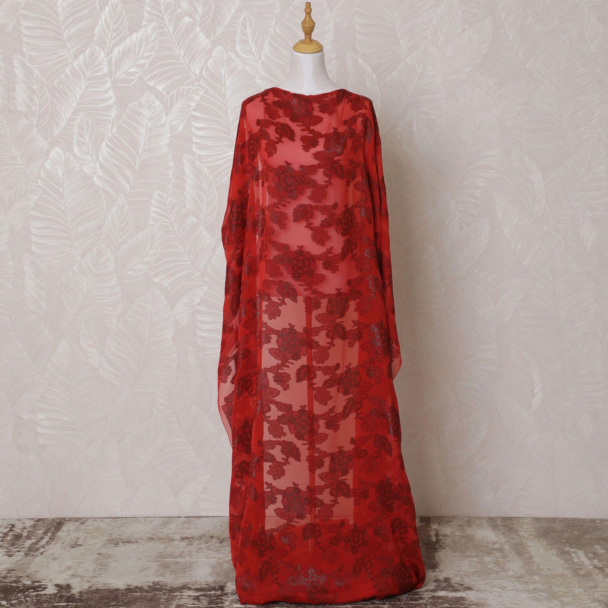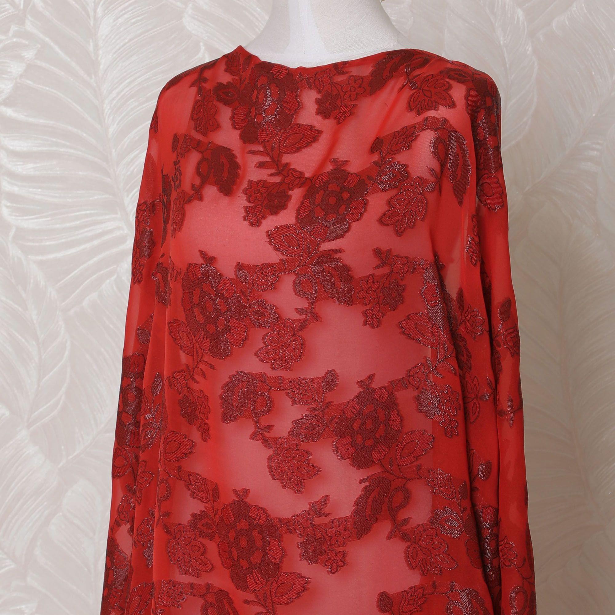 • Sale -25% Dark scarlet red Premium pure French (Fransawi) silk chiffon dirac fabric with black metallic lurex in floral design-D15611