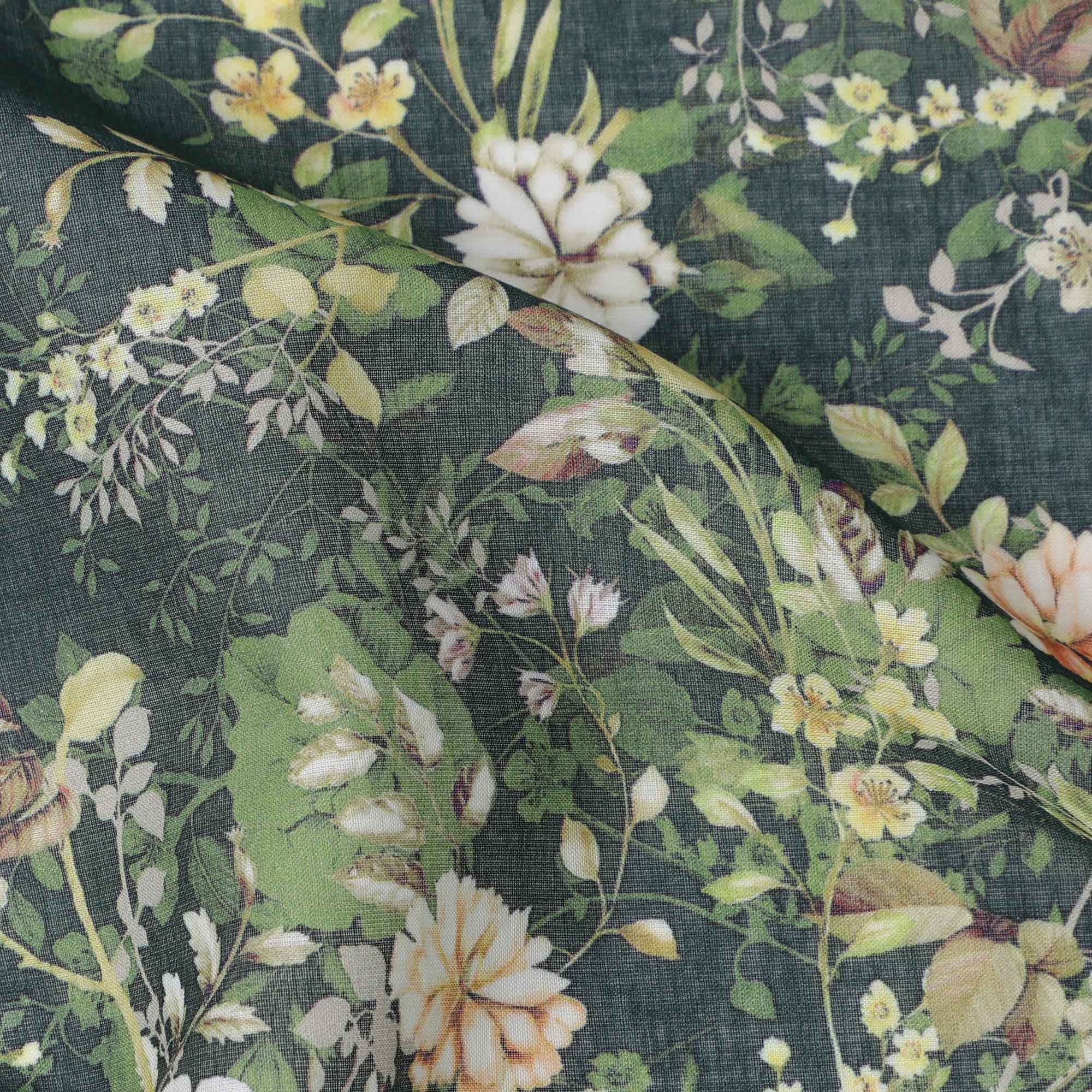 Unveil the magic of nature with this deep forest green base cotton lawn fabric, adorned with a lush botanical garden floral print in shades of ivory, peach, olive, and moss green. Designed to mimic a blooming forest landscape, the pattern brings freshness and subtle vibrancy to your wardrobe. Crafted from soft, breathable cotton lawn, this fabric offers an airy, lightweight texture and a beautiful fall, ideal for flowing kurtis, summery tops, and boho dresses. The detailed digital printing enhances color clarity and depth while preserving the intricate leafy and floral illustrations. Measuring 110 cms in width, it provides ample room for versatile tailoring. Made in India, this premium-quality fabric captures the serenity of nature with the comfort of finely woven cotton. Shop online to add this garden-inspired printed cotton lawn to your summer wardrobe collection.