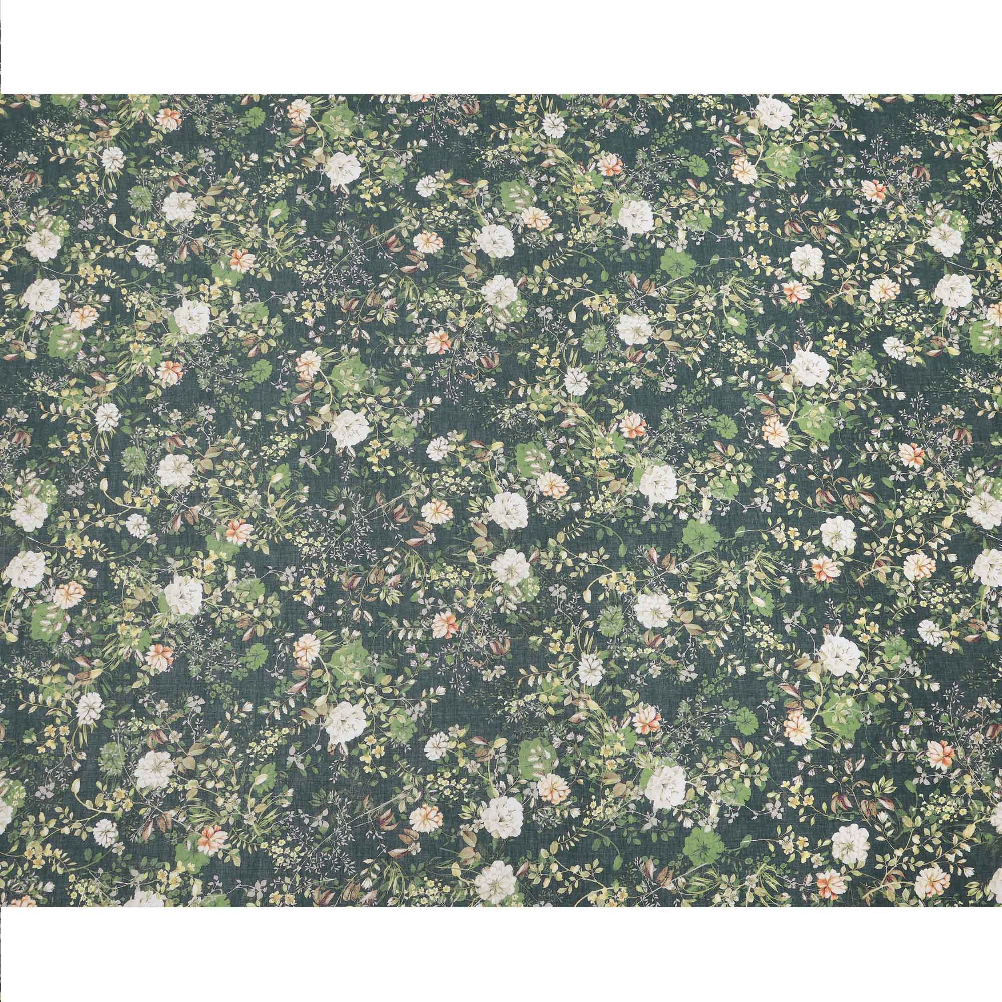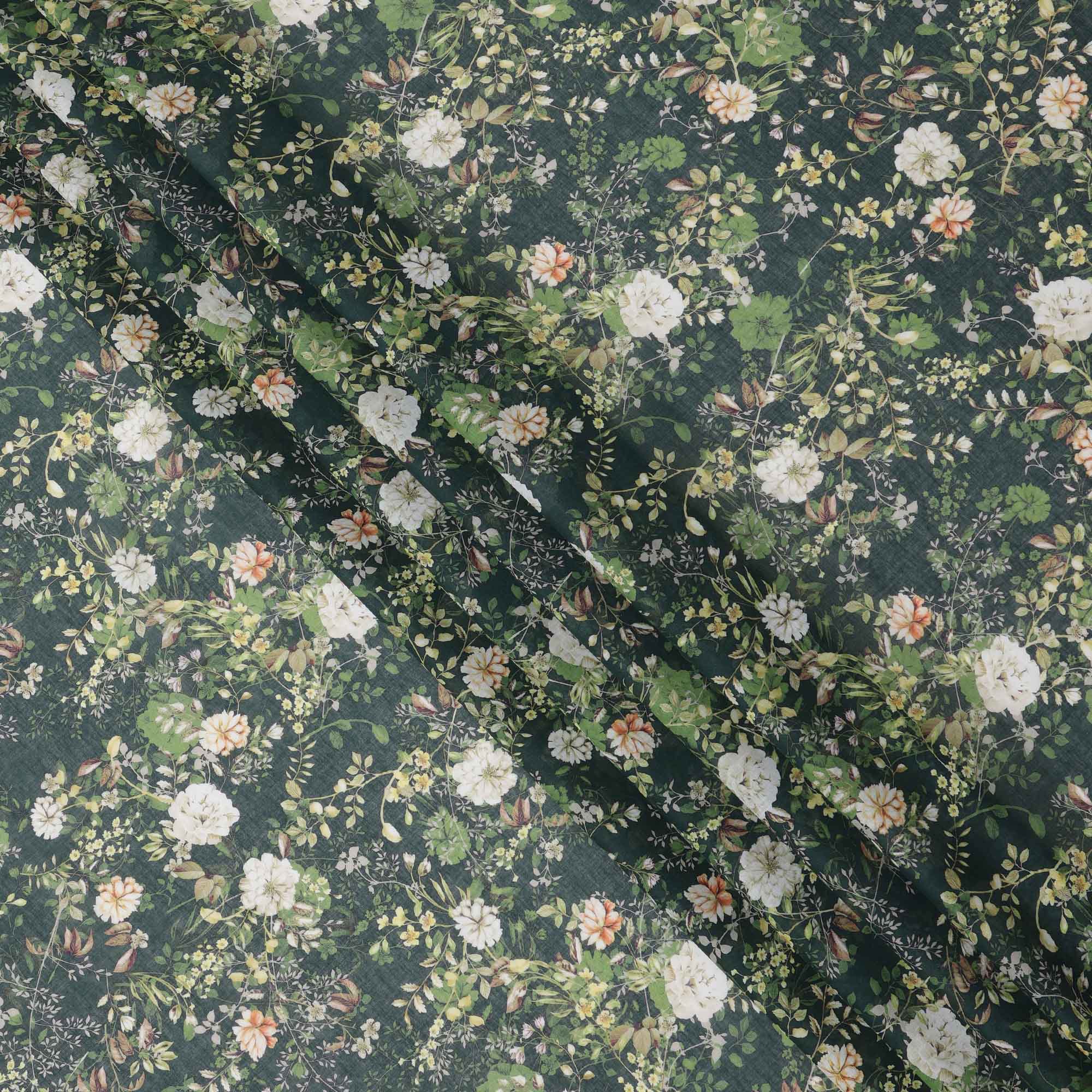 Deep Forest Green Base Ivory & Peach Botanical Garden Floral Printed Cotton Lawn Fabric, 110 Cms Width, Made in India-D23650