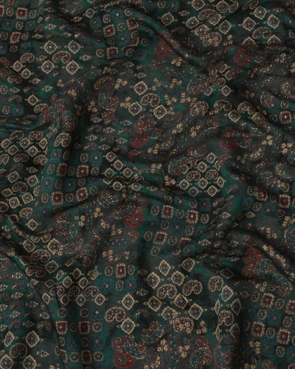 Deep Green Ethnic Printed Blended Viscose Fabric with Paisley & Geometric Motifs, 110 Cms Width, Made in India-D22798