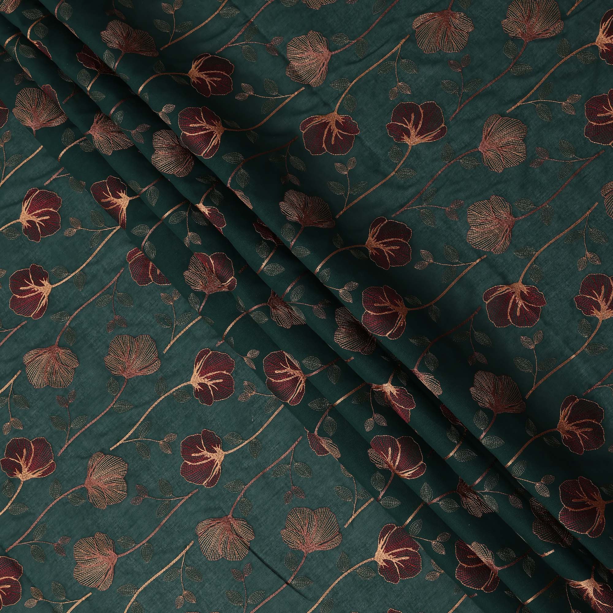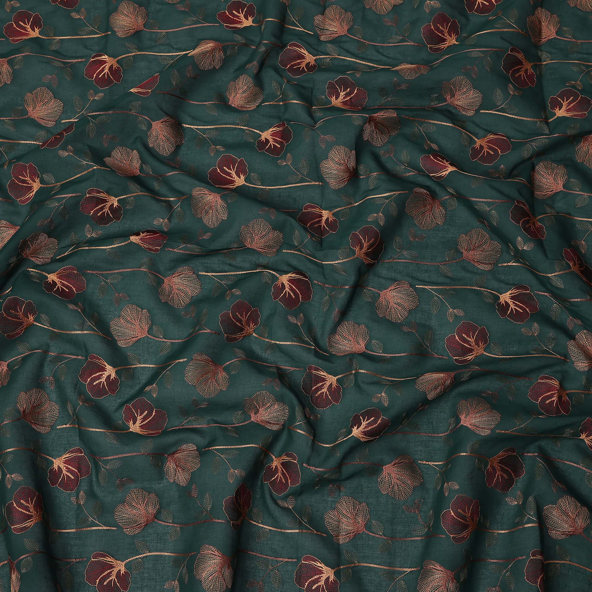 Deep Green Floral Embroidered Cotton Voile Fabric with Multicolor Threadwork, 110 Cms Width, India-D25323