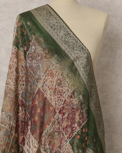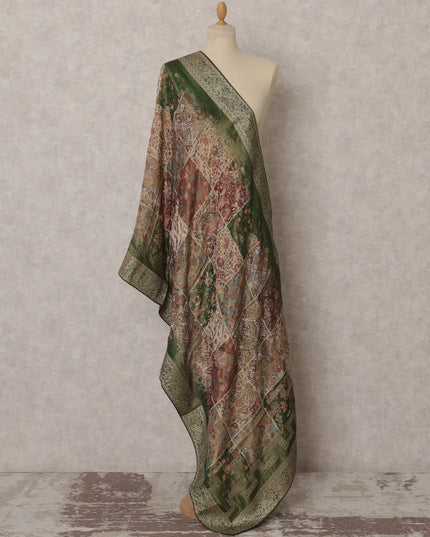 • Sale -10% Deep Green & Multicolor Patchwork Synthetic Brocade Dupatta, Ornate Ethnic Stole, 215X80 CMS, India-D22367