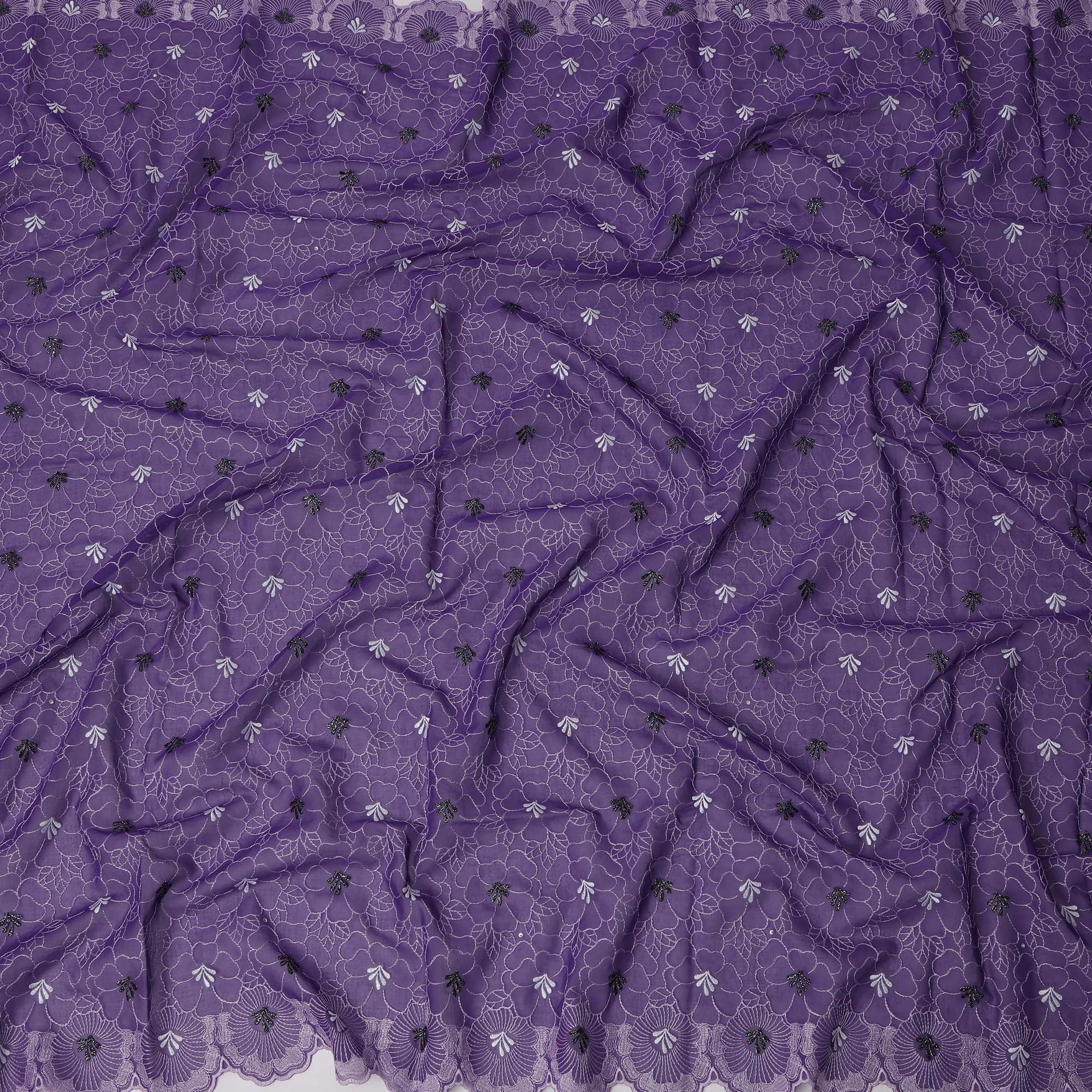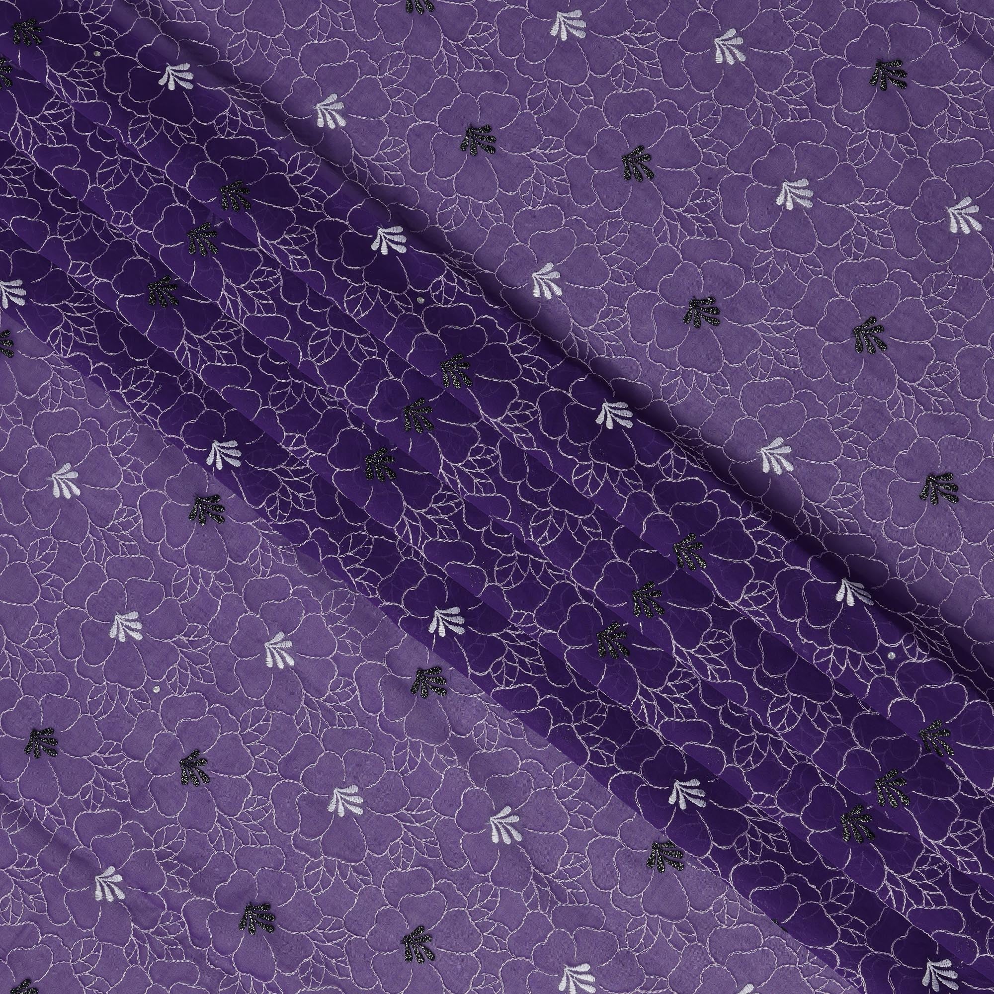 Deep purple cotton voile fabric with white and black floral embroidery and shimmering stone accents.