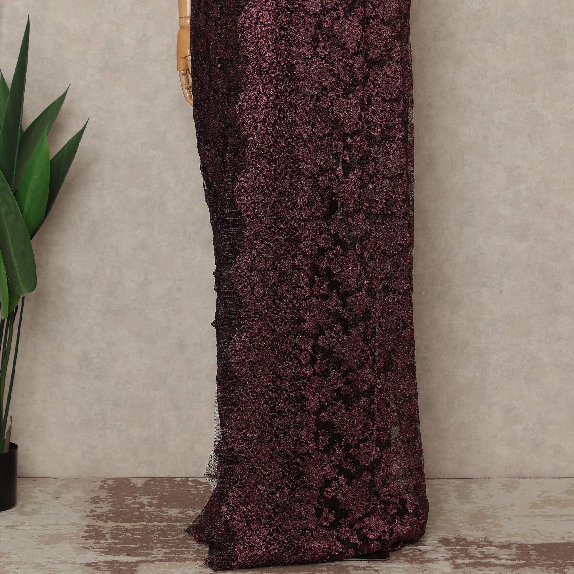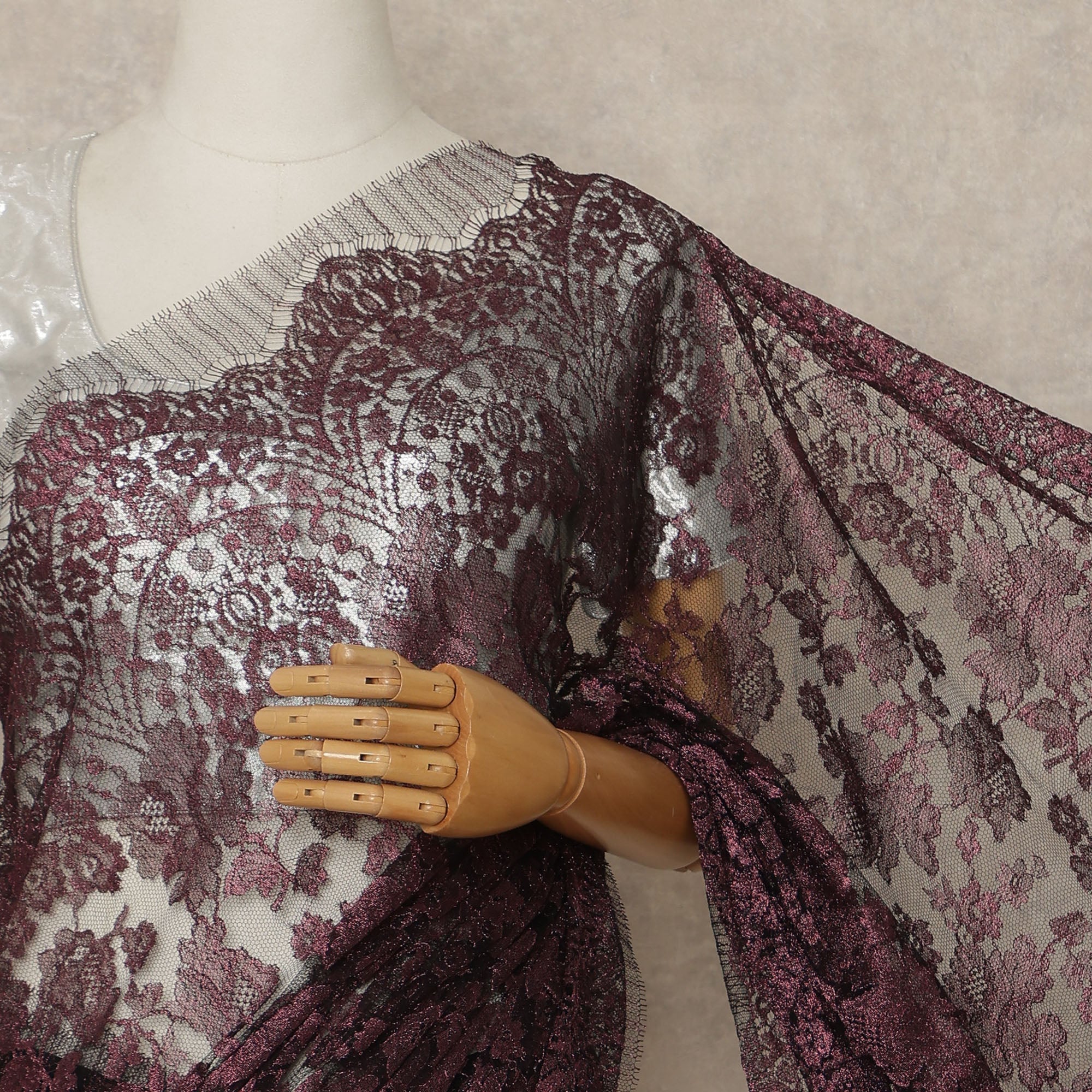 Deep Wine Purple Premium French Metallic Chantilly Saree Lace Fabric 110 Cms Width 5.5 Meters Piece Elegant Floral Net Lace From France For Designer Sarees And Couture Draping-D27680