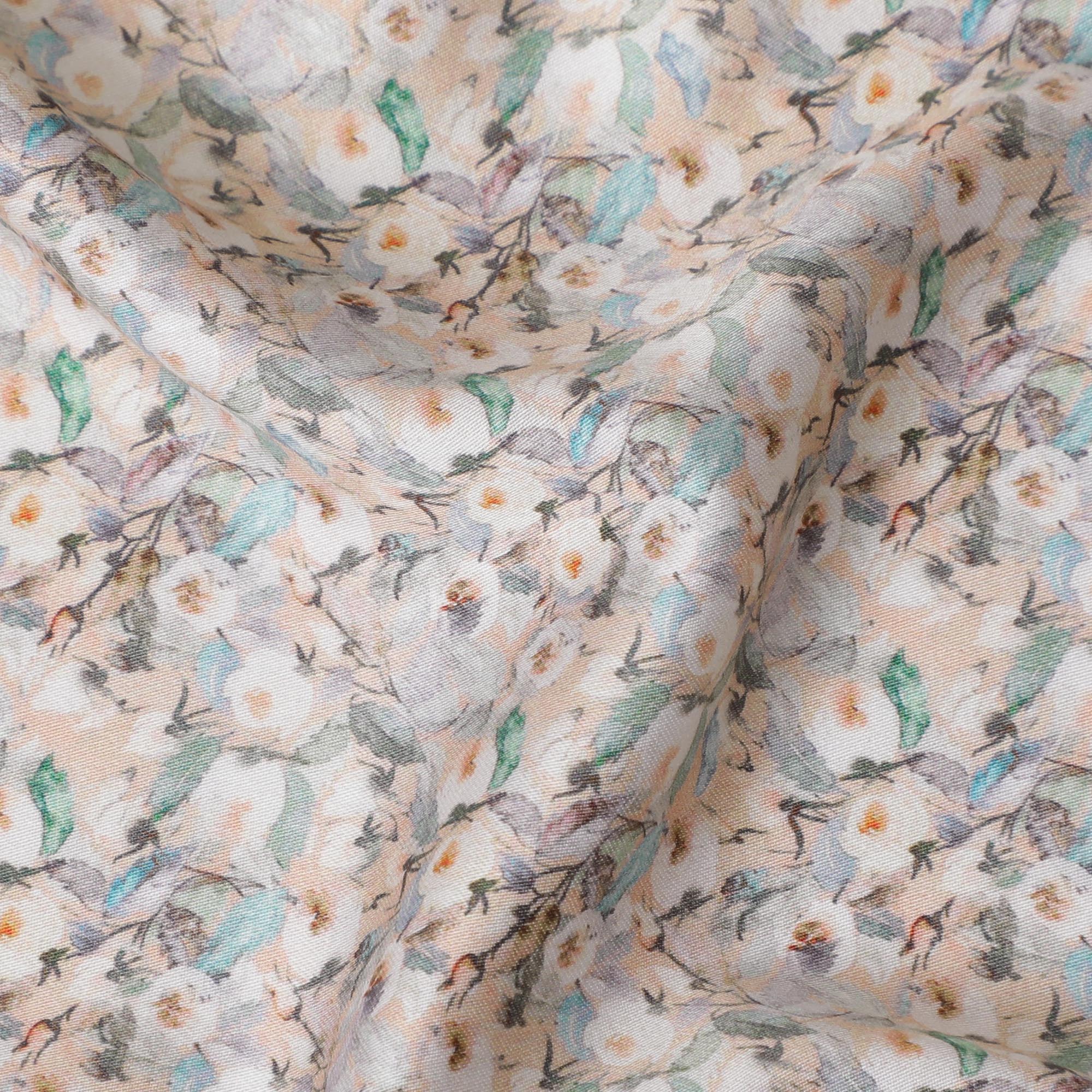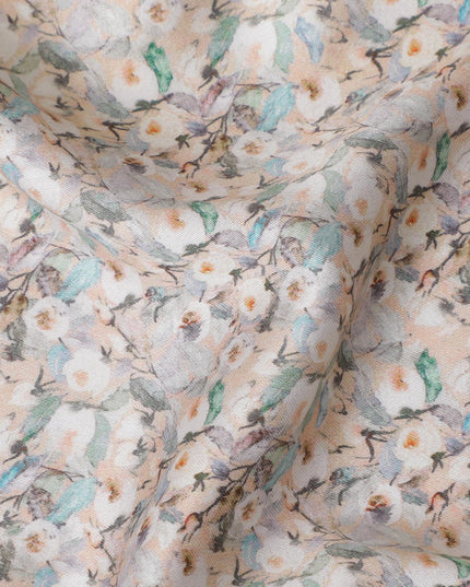 Introducing our Delicate Cream Cotton Satin Fabric, adorned with charming pastel floral patterns. Crafted in India and spanning a width of 110 cms, this fabric blends the breathability of cotton with the elegant finish of satin. The soft cream background is beautifully complemented by subtle hues of peach, blue, and green in the floral design, making it an ideal choice for spring and summer apparel, light draperies, and sophisticated home decor. This cotton satin fabric is not only aesthetically pleasing but also durable and easy to handle, perfect for a wide range of creative projects.