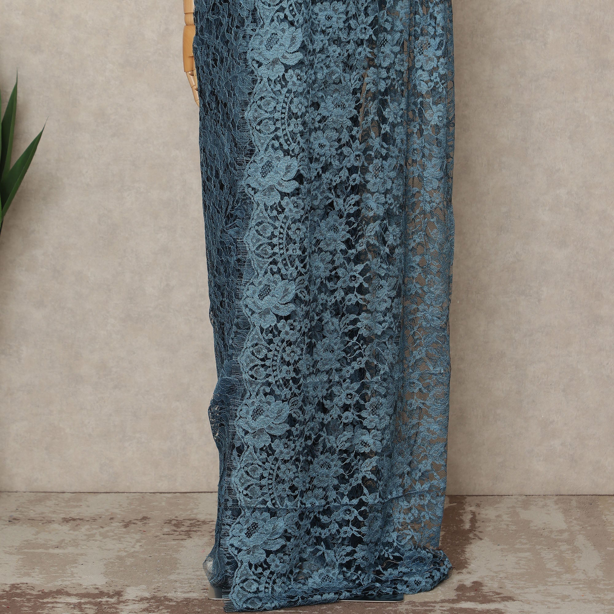 This dusty blue 2tone premium French Chantilly saree lace features a refined blend of soft blue tones layered with subtle depth, creating an elegant and contemporary appeal. Crafted in France, the intricate floral Chantilly motifs are delicately woven over a fine sheer net base, offering a lightweight texture and a graceful flowing drape. The sophisticated 2tone effect enhances dimension and richness, making it an excellent choice for weddings, receptions, evening gatherings, and designer couture creations. With an approximate length of 5.5 meters and a generous width of 110 cms, this lace provides ample fabric to design a complete saree with timeless charm and luxurious finish. Blouse not included.