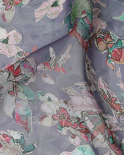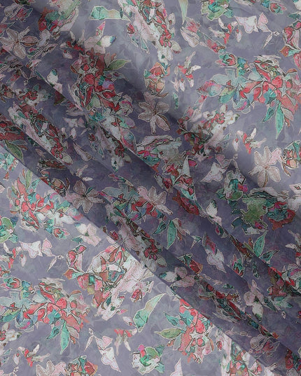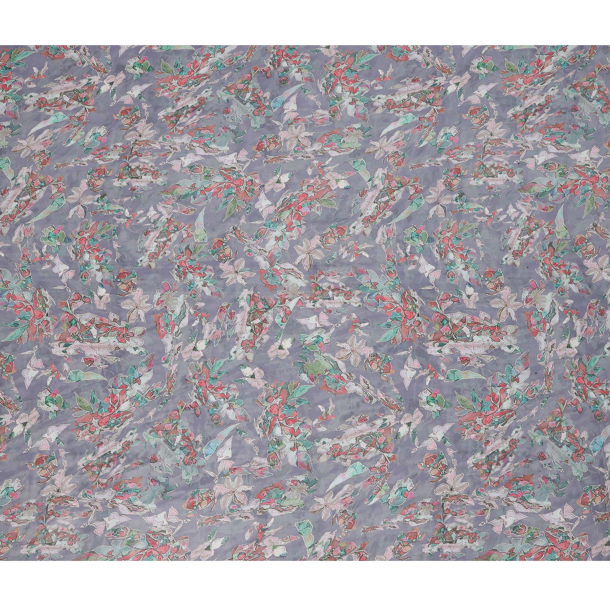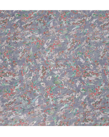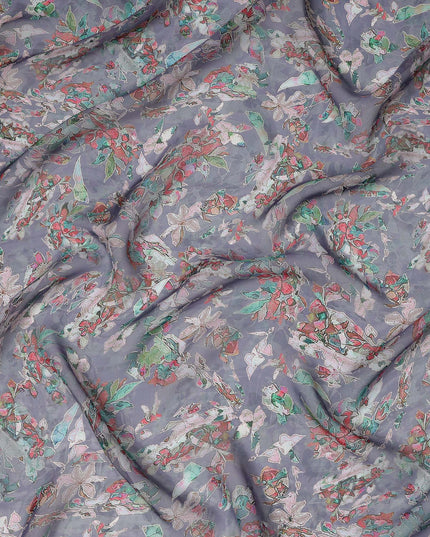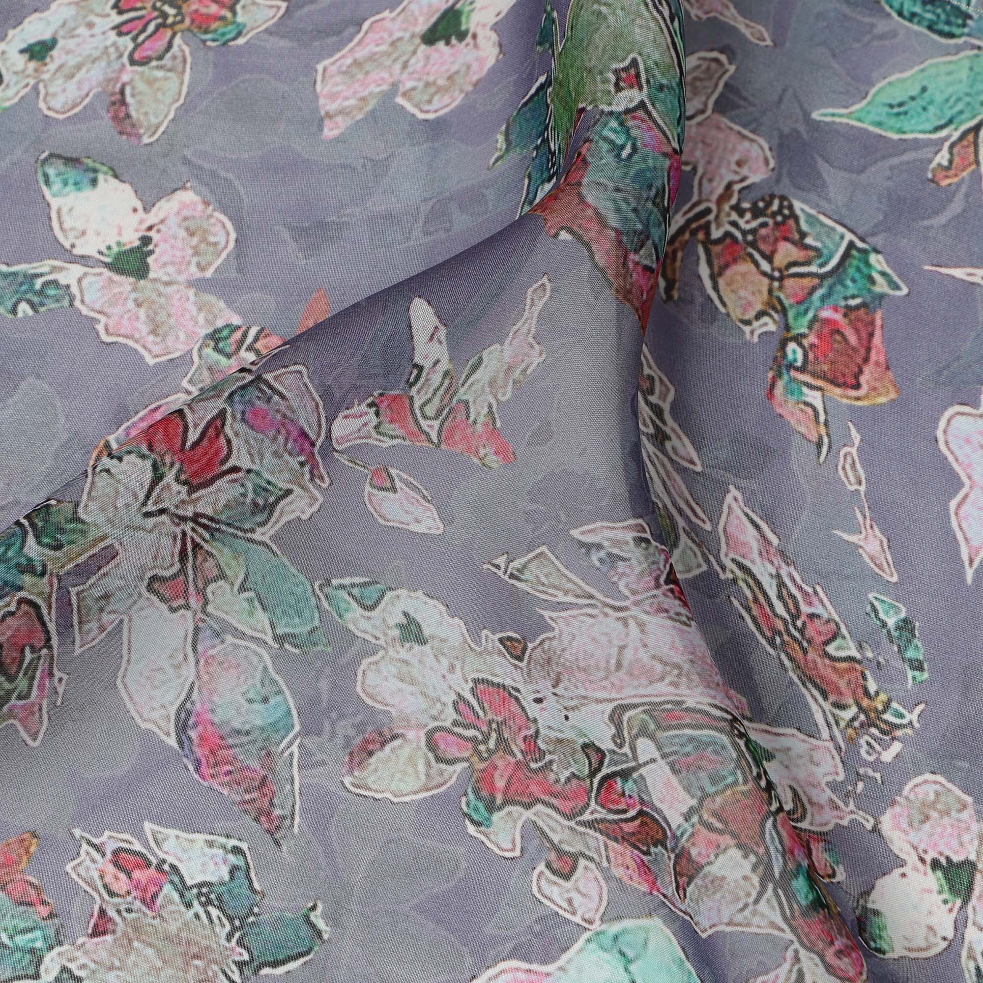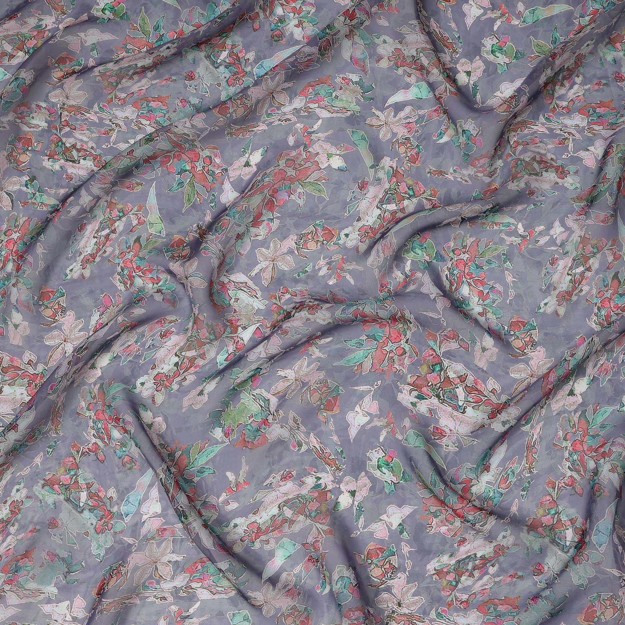 Dusty Lavender Floral Printed Synthetic Organza Fabric with Mint and Coral Leafy Motifs, Width 110 Cms, Made in India-D23333
