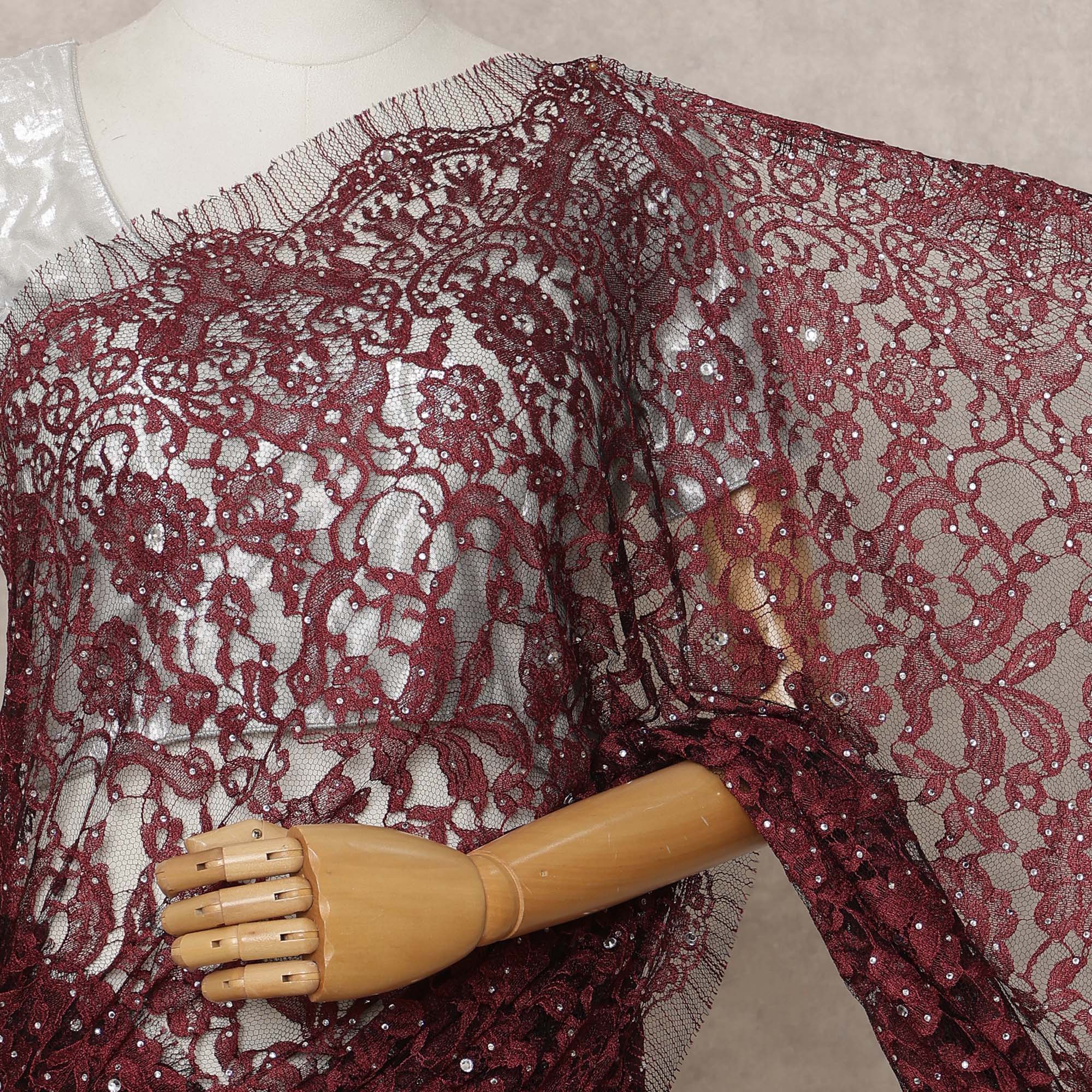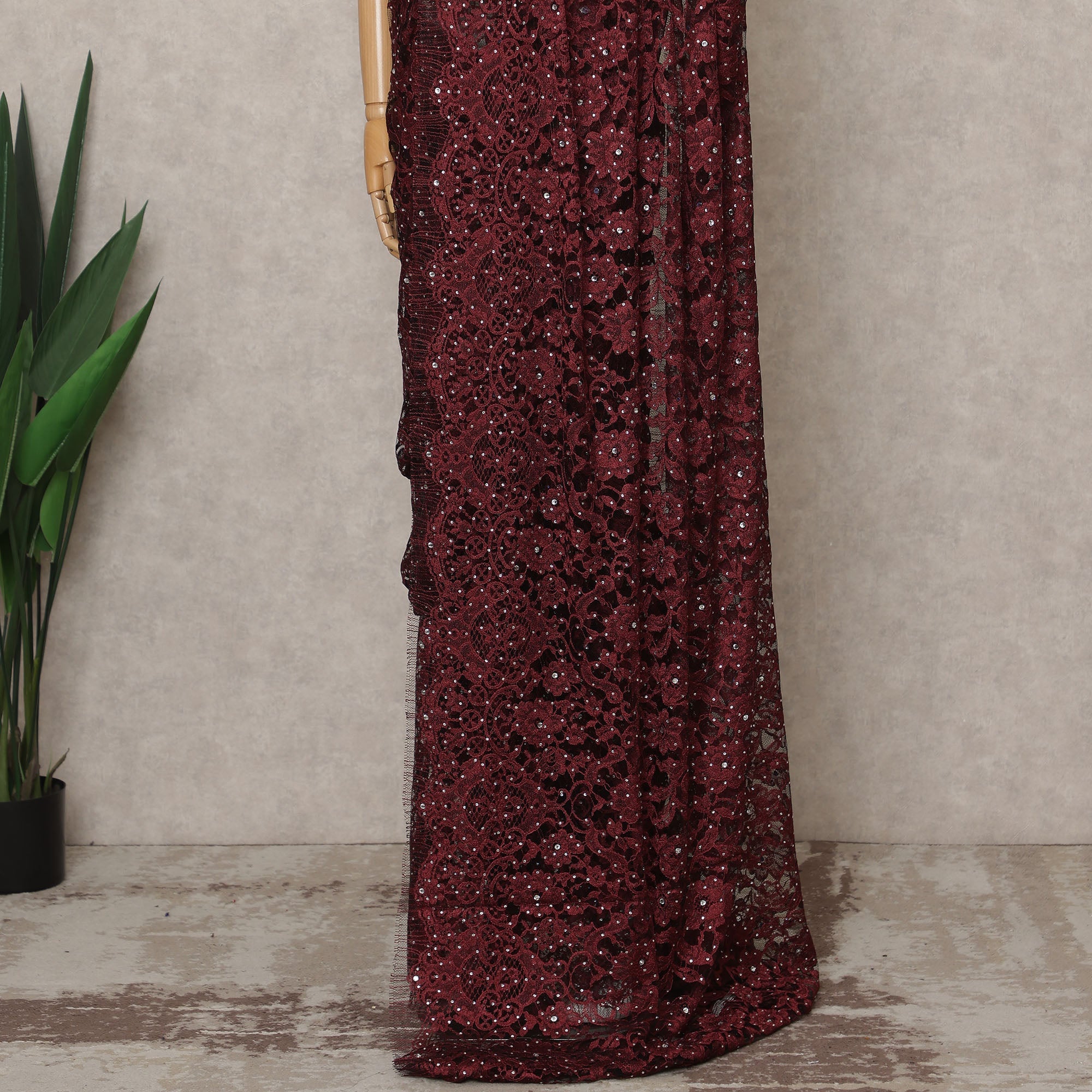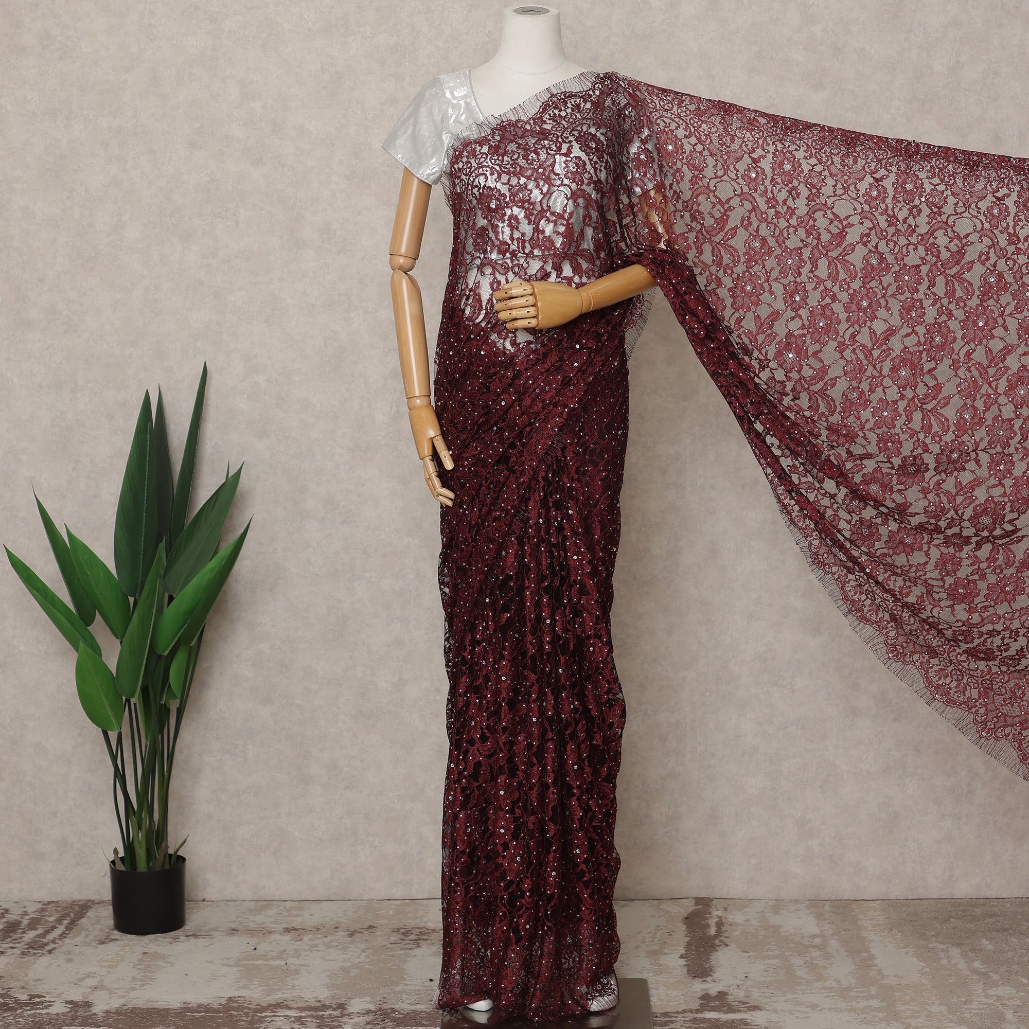 Dusty Maroon Premium French Chantilly Lace Saree with Stone Work – 5.5 Meters Fabric Length, Width 110 cm, Imported from France & Blouse Not Included-D26590