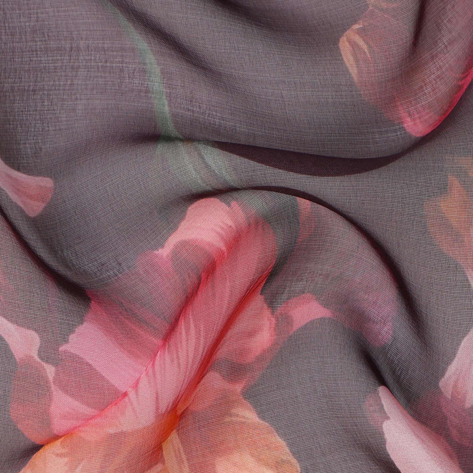 This Dusty Mauve Base Coral and Peach Iris Floral Printed Pure Silk Chiffon Fabric evokes timeless sophistication with its moody... Read more Read more