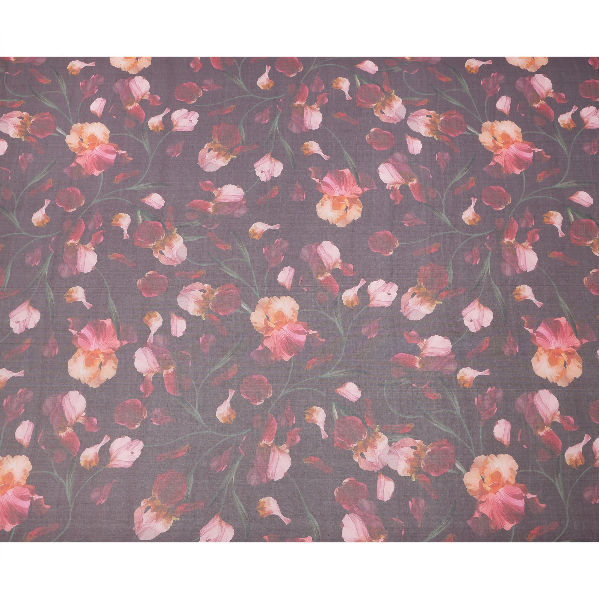 Dusty Mauve Base Coral and Peach Iris Floral Printed Pure Silk Chiffon Fabric, 110 Cms Width, Made in South Korea-D24005
