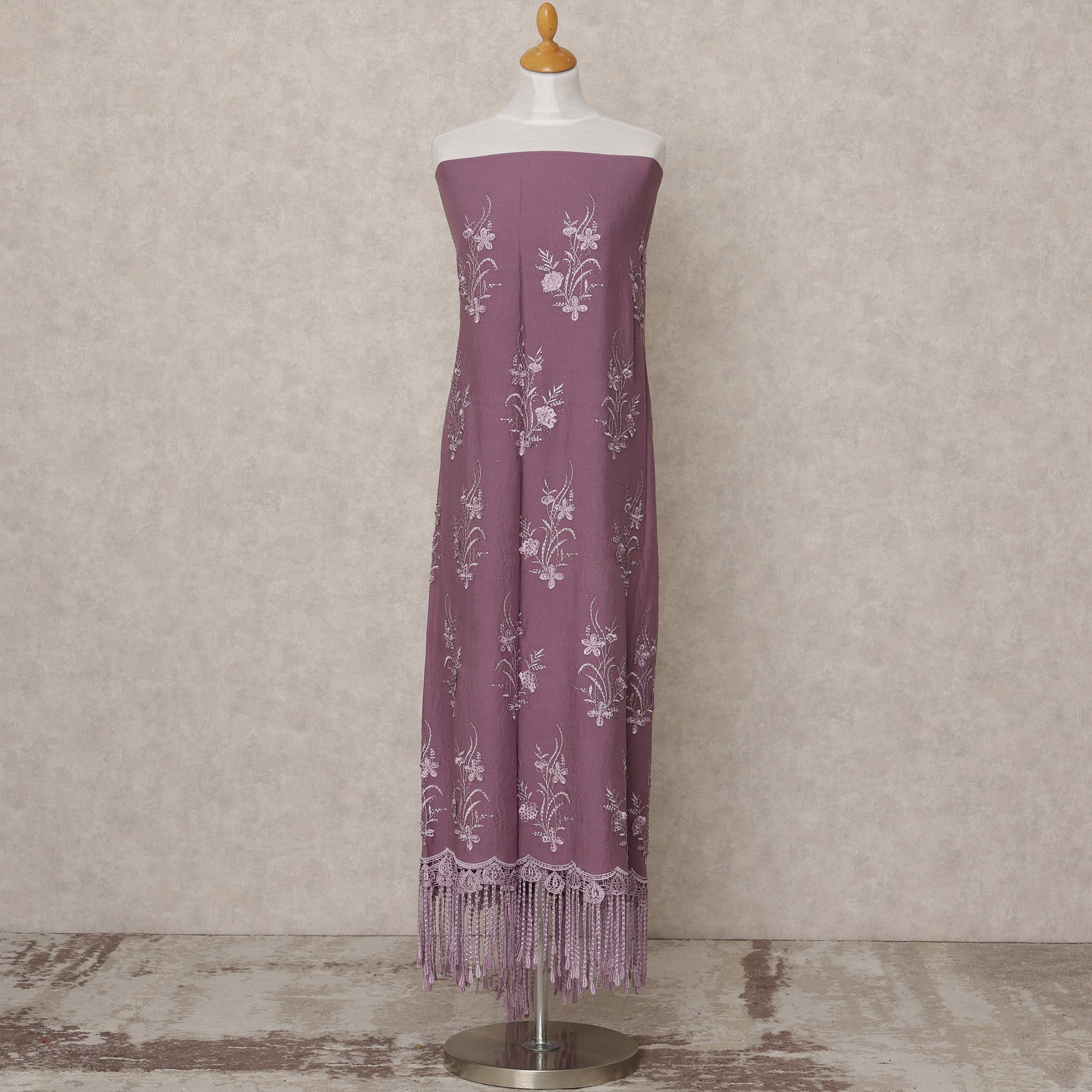 • Sale -75% Dusty Mauve Embroidered Blended Cotton Fabric with Lavender Floral Motifs and Tasselled Lace Border, 130 Cms Width, 3.0 Mtrs Length, Made in India-D24146
