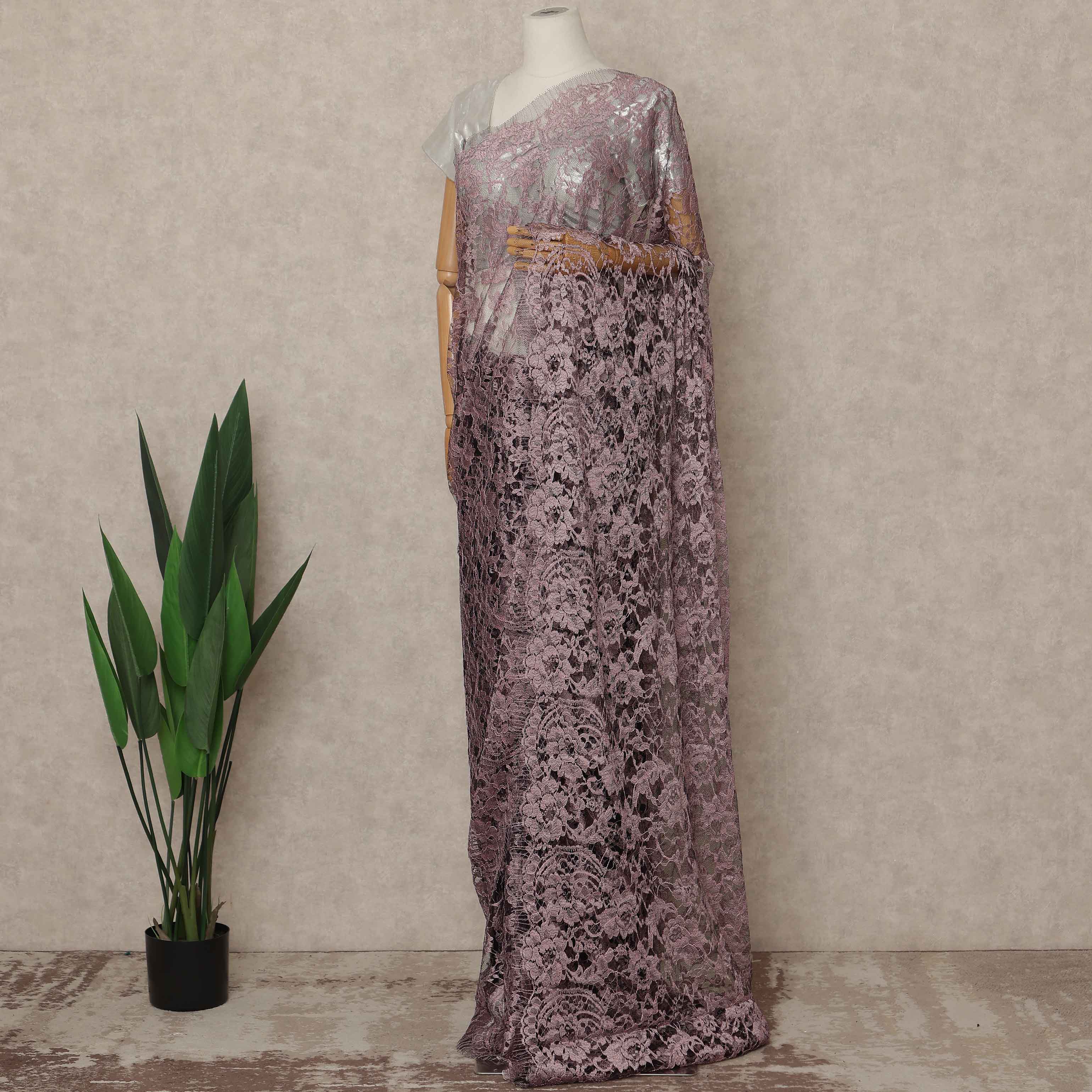 Dusty Mauve Premium French 2 Tone Chantilly Saree Lace 5.5 Mtrs Length 110 Cms Width Designer Net Fabric Made In France, Blouse Not Included-D28116