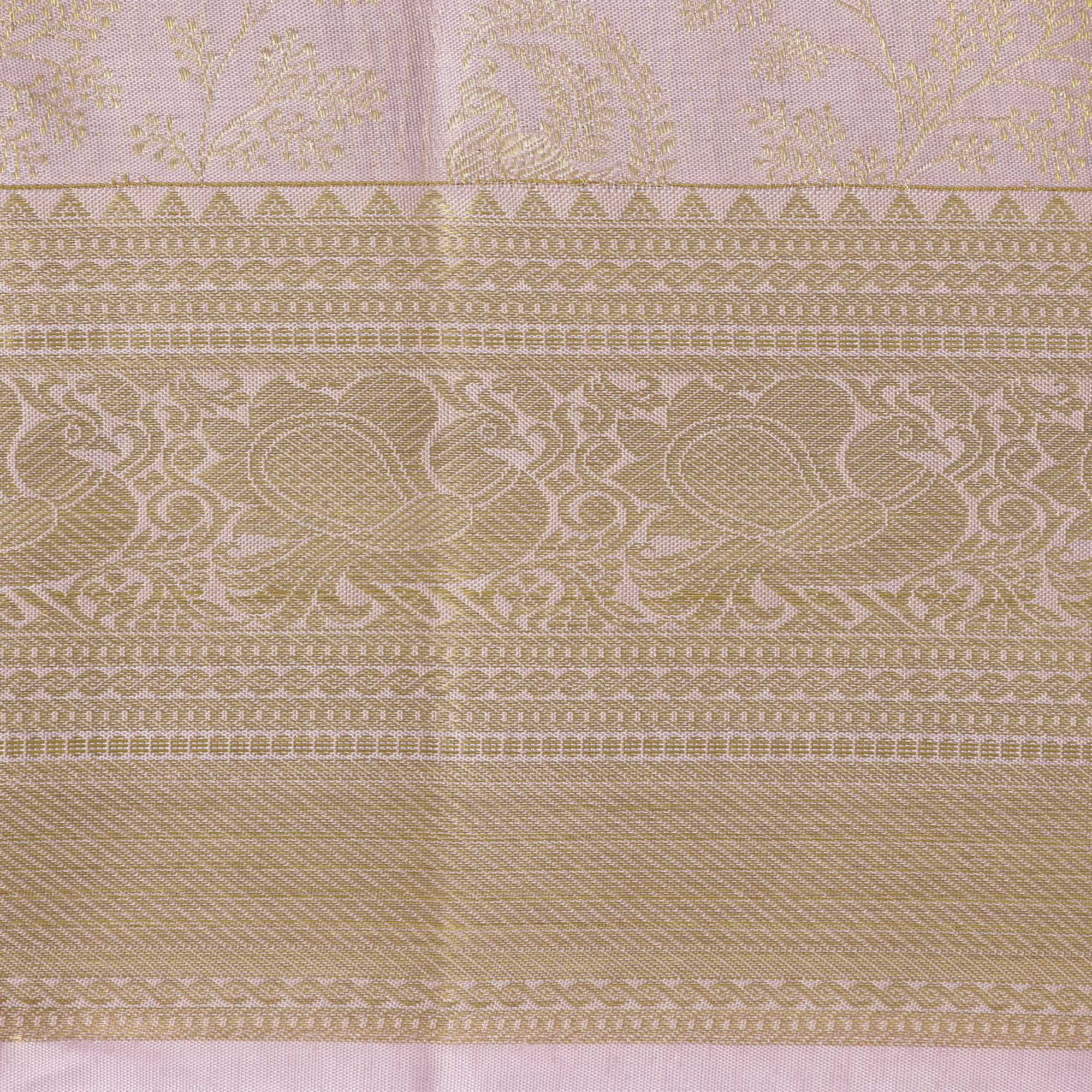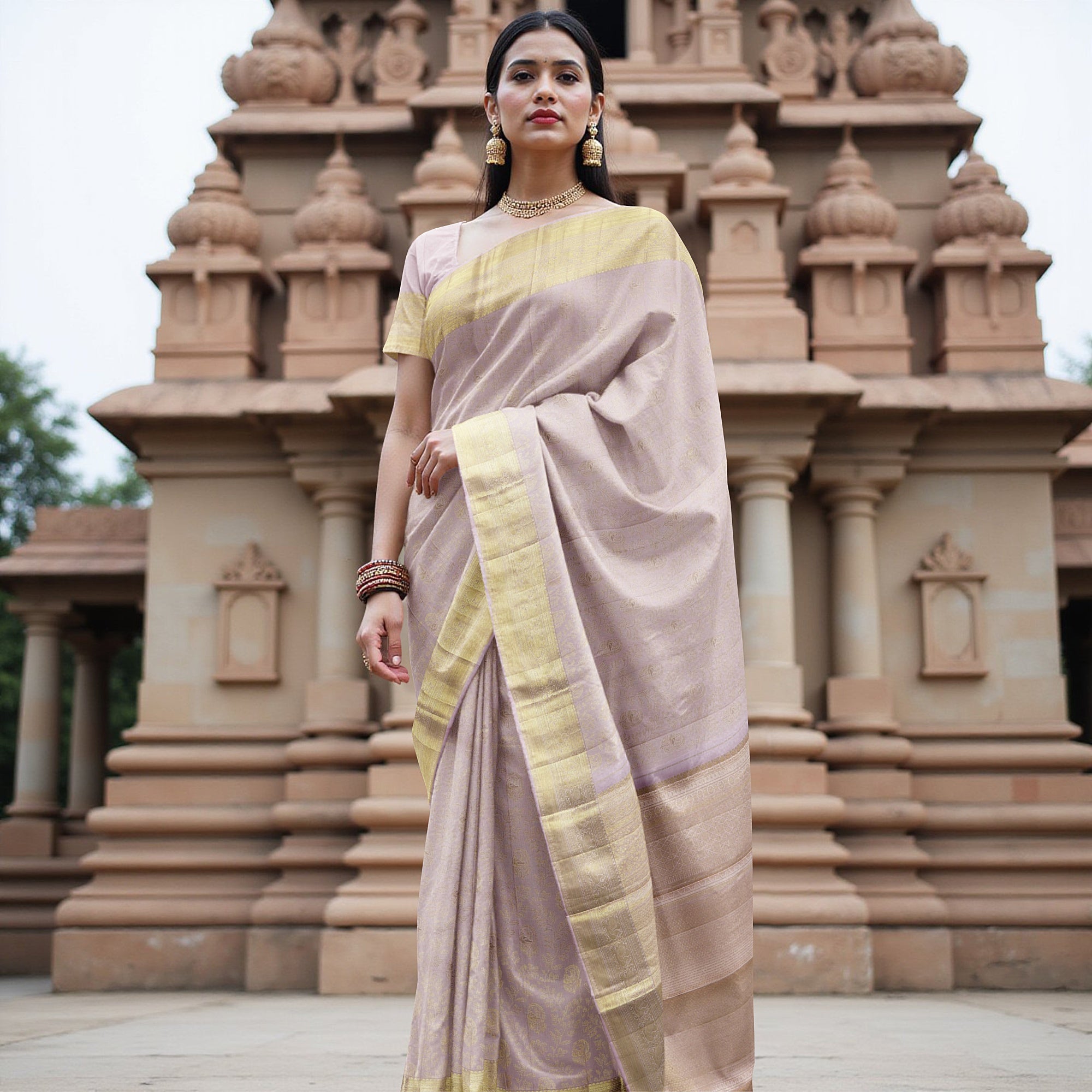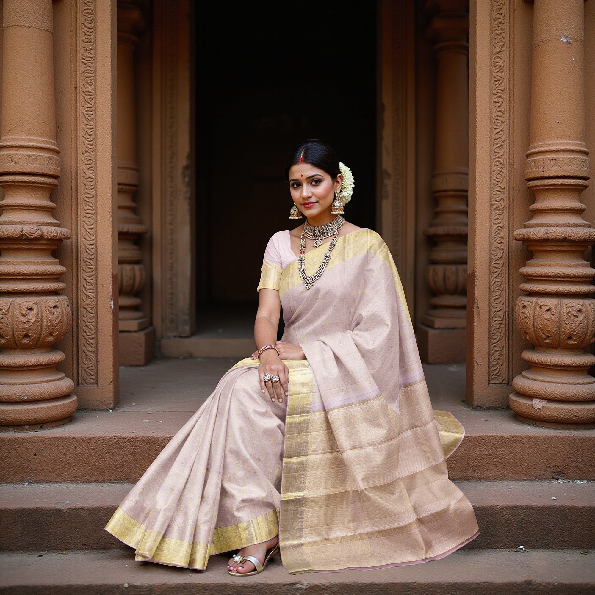 Delicate as dawn’s first light, this dusty pink and gold Kanjeevaram pure silk bridal saree is a whisper of timeless grace, crafted for the bride who seeks quiet elegance. The body shimmers with a fine blend of subtle zari stripes and minimalistic butta patterns, reminiscent of ancient South Indian paintings that capture the soft hues of celestial beings and sacred textiles. The golden border adds a touch of radiance, framing the saree like a canvas of divine serenity. Handwoven from Regal Fabrics, each saree takes 48 hours of skilled craftsmanship to achieve its refined texture and intricate finish. Its airy drape and refined sheen make it a sophisticated choice for weddings and traditional occasions. Paired with a matching blouse piece, this saree is available to shop online—an heirloom of understated beauty.