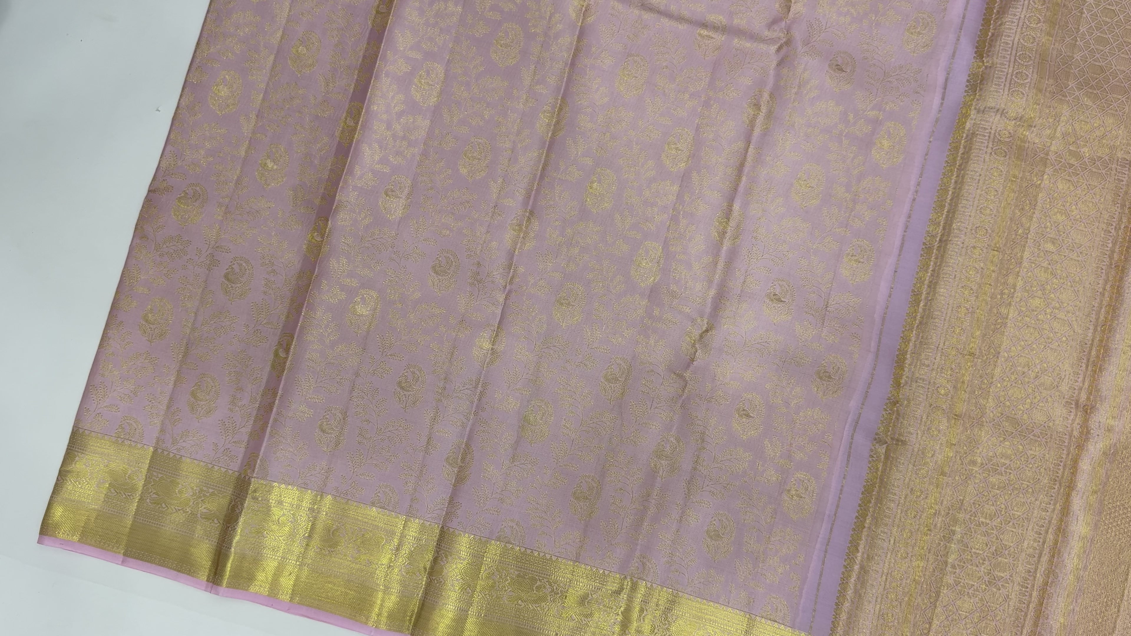 Delicate as dawn’s first light, this dusty pink and gold Kanjeevaram pure silk bridal saree is a whisper of timeless... Read more Read more