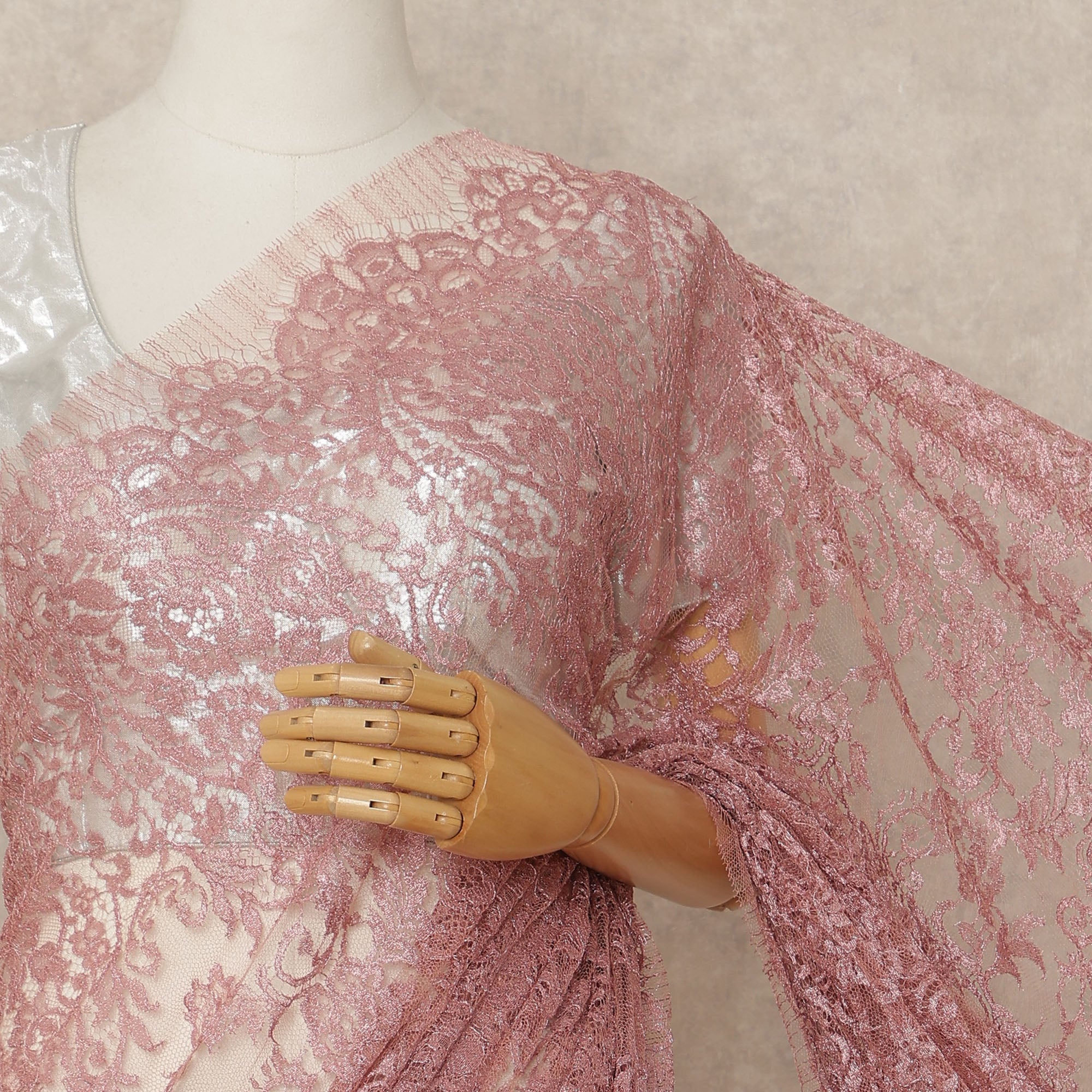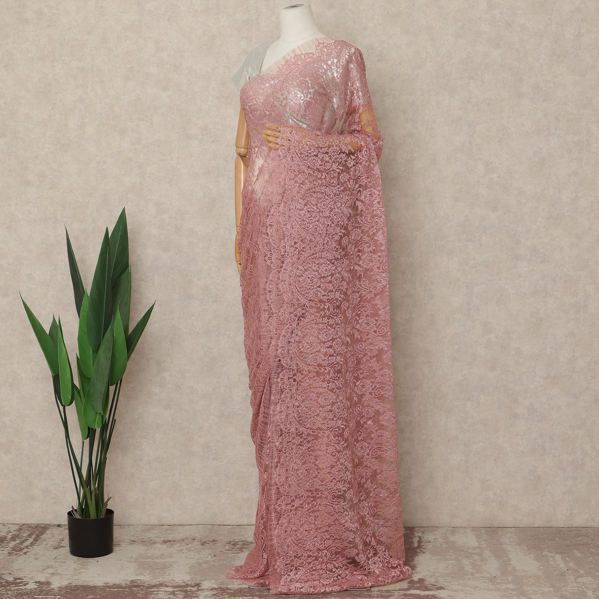 Dusty Pink Premium French Metallic Chantilly Saree Lace Fabric 5.5 Mtrs Length 110 Cms Width Floral Designer Net Drape Material Made In France, Blouse Not Included-D28093
