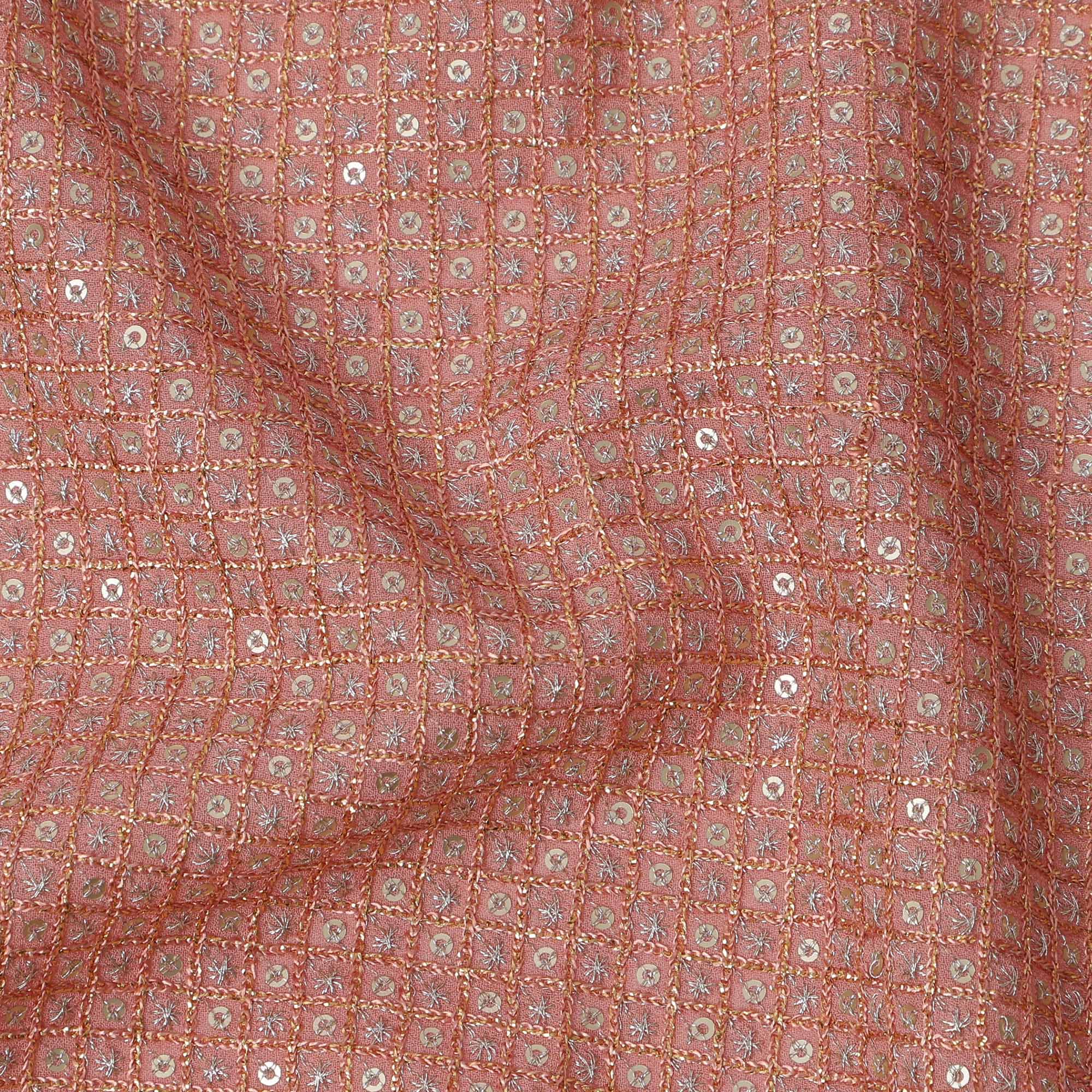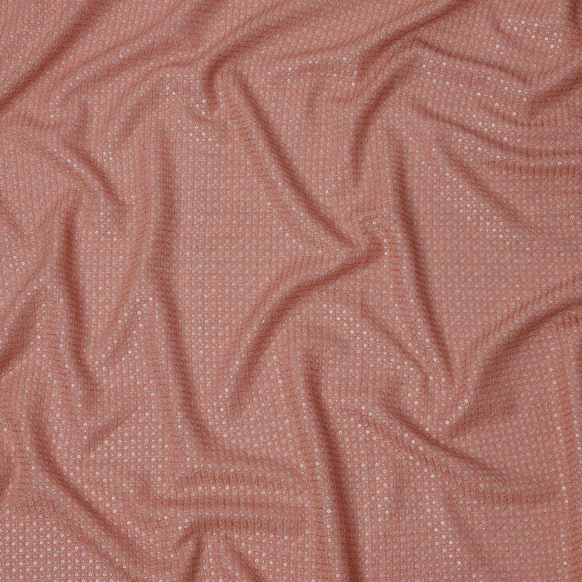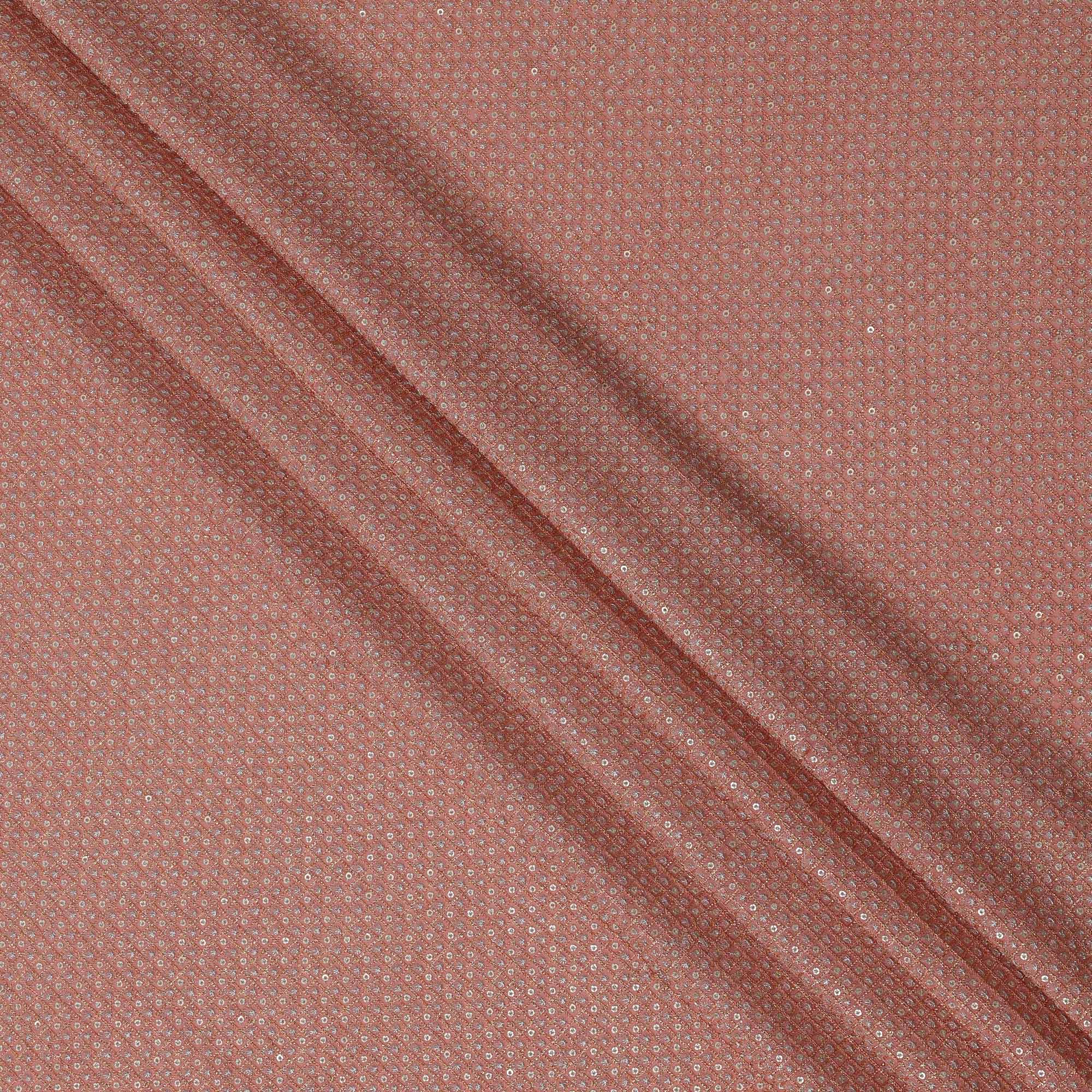This dusty rose pink synthetic blended viscose fabric brings out subtle elegance through its intricate square embroidery featuring delicate floral patterns and reflective mirror embellishments. The warm undertones of pink beautifully complement the golden threadwork and sequins, offering a rich yet soft visual appeal ideal for festive and ethnic ensembles. With a practical width of 110 cms, it is perfect for crafting stylish kurtas, lehengas, and dupattas that require breathable fabric with a hint of sheen. Made in India, this fabric blends traditional embroidery techniques with a sophisticated pastel palette. Shop online to redefine ethnic elegance.