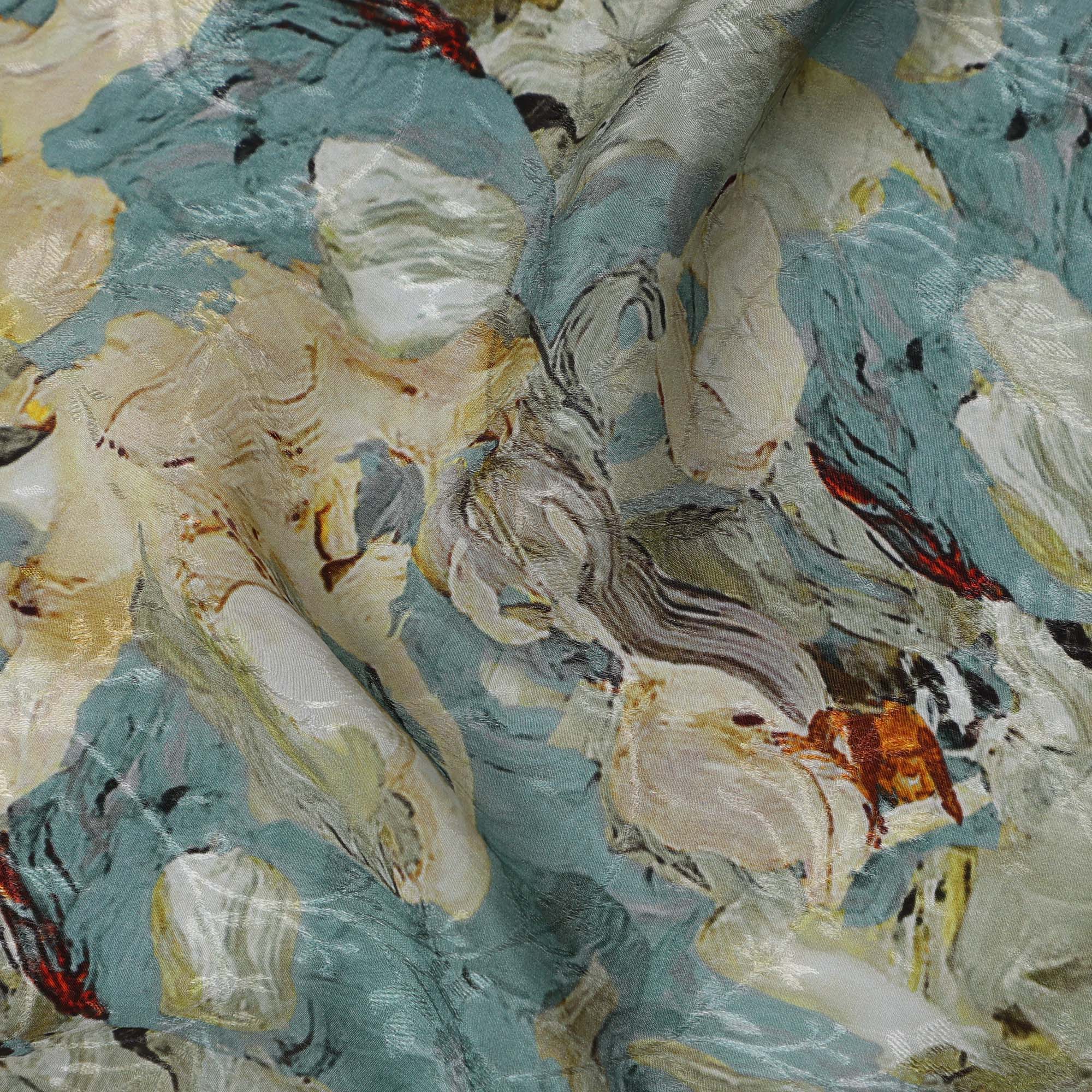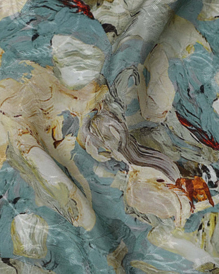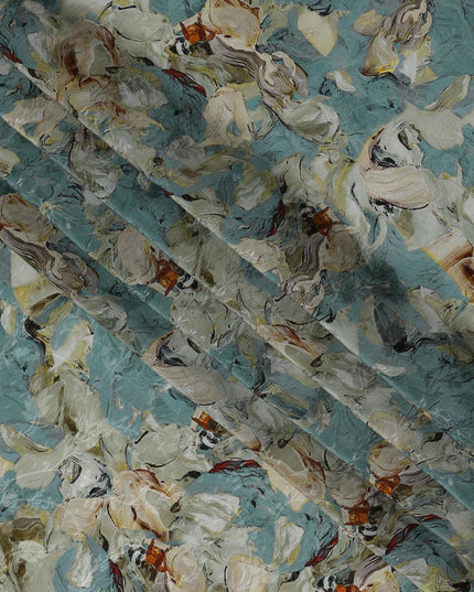Bring a touch of artistic depth to your wardrobe with this dusty teal abstract brushstroke digital print viscose fabric, where strokes of ivory, beige, ochre, and subtle maroon unfold like a canvas painted by hand. The serene teal base anchors the expressive brushwork, making this fabric a perfect pick for statement dresses, elegant tunics, or contemporary Indo-western pieces. Crafted from breathable viscose, it drapes with fluid grace while remaining soft and skin-friendly, ideal for day-long wear. Digitally printed in India with high-definition clarity, the abstract design creates a dynamic texture with modern visual interest. Measuring 110 cm in width, this fabric offers versatility for both structured and free-flowing silhouettes. Gentle hand wash or dry cleaning is recommended to preserve the vibrancy and luxurious feel of the fabric, making it an artistic yet practical addition to your collection.
