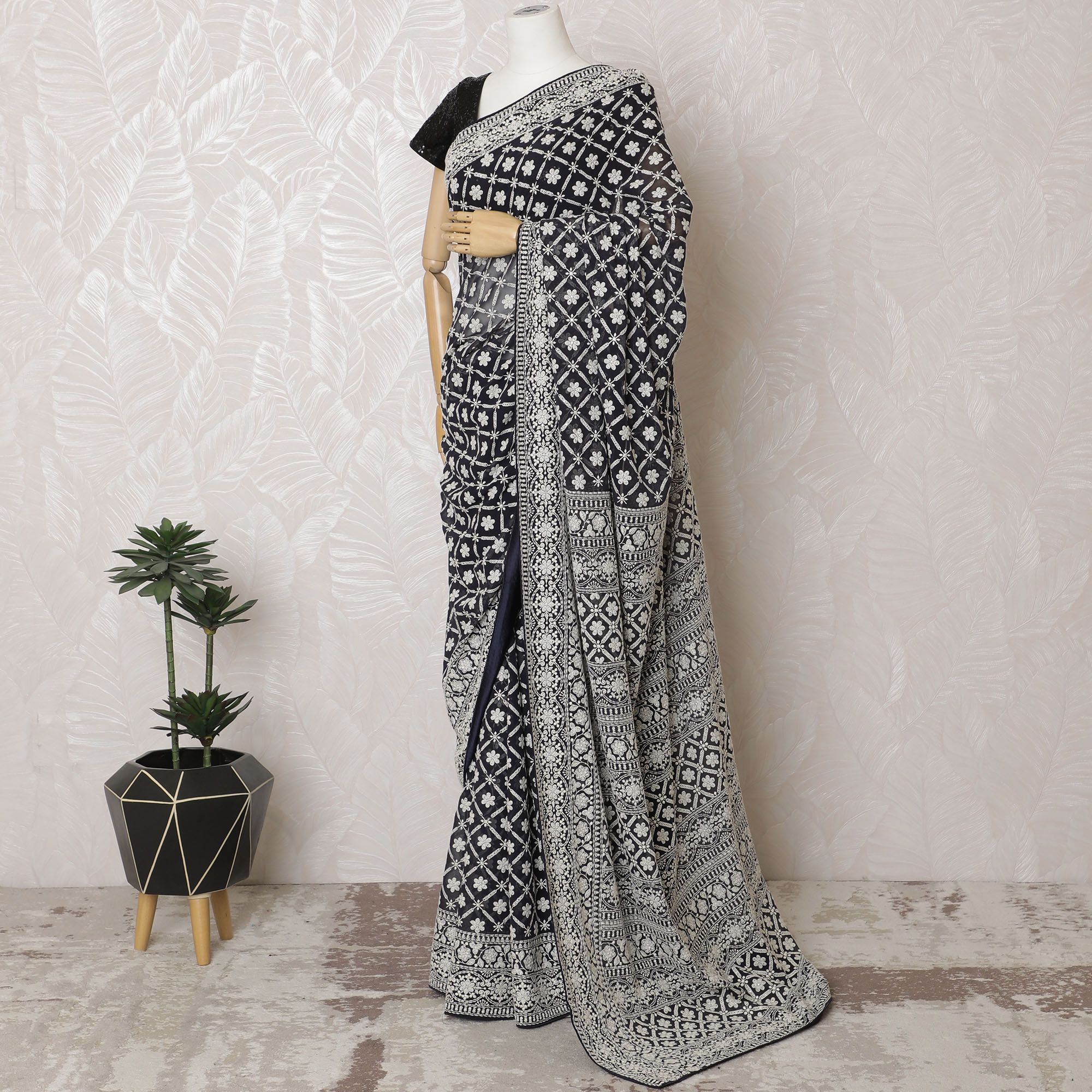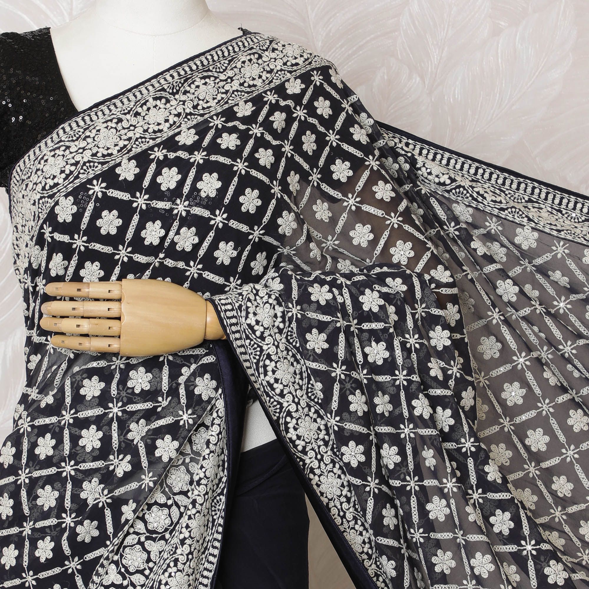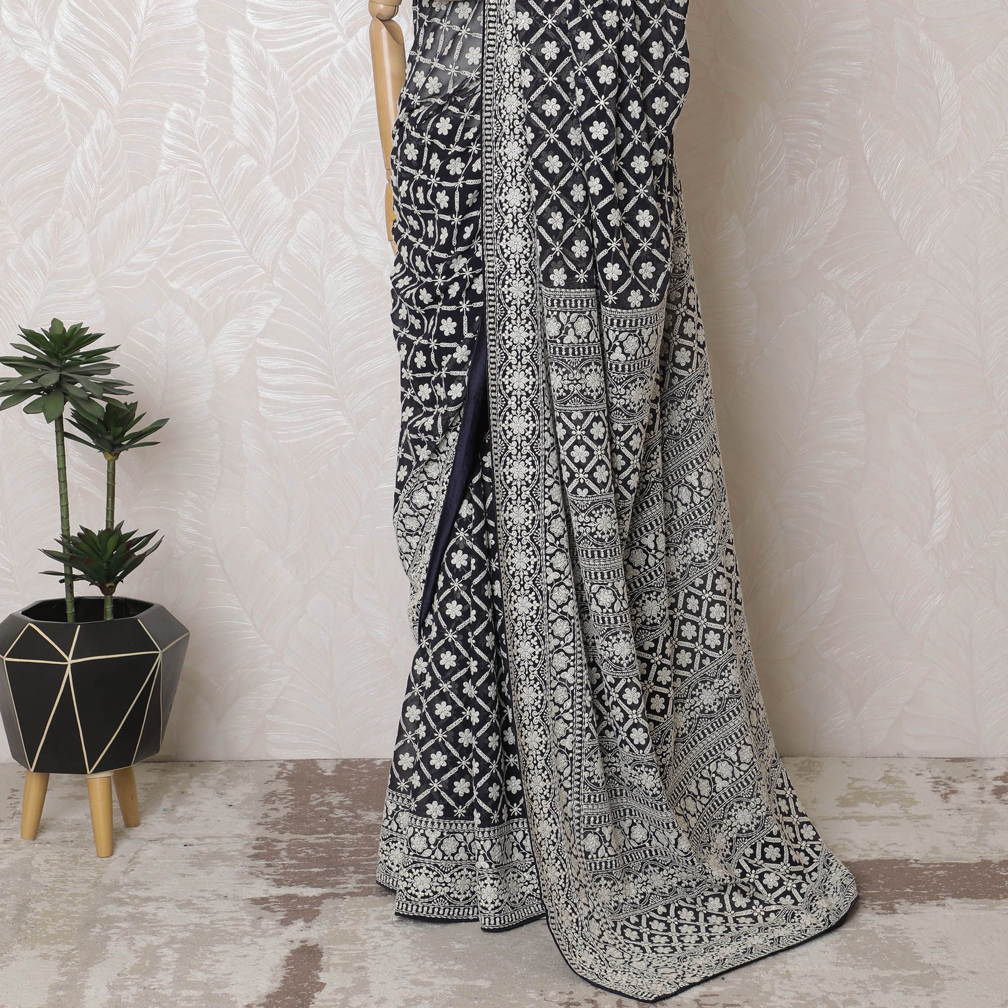 ,Unveil the classic beauty of our Ebony and Ivory Silk Georgette Saree, crafted with impeccable attention to detail in India. The saree spans a width of 110 cm and a generous length of 5.5 meters, presenting a fluid drape that embodies grace and sophistication. This saree features a timeless pattern that contrasts starkly against the ebony background, offering a look that is both bold and traditional. The lightweight silk georgette material ensures a comfortable wear, making it an ideal choice for both special occasions and everyday elegance. Please note that this saree is sold without a blouse piece, inviting the opportunity to personalize your ensemble with a separate blouse that complements this exquisite piece.,