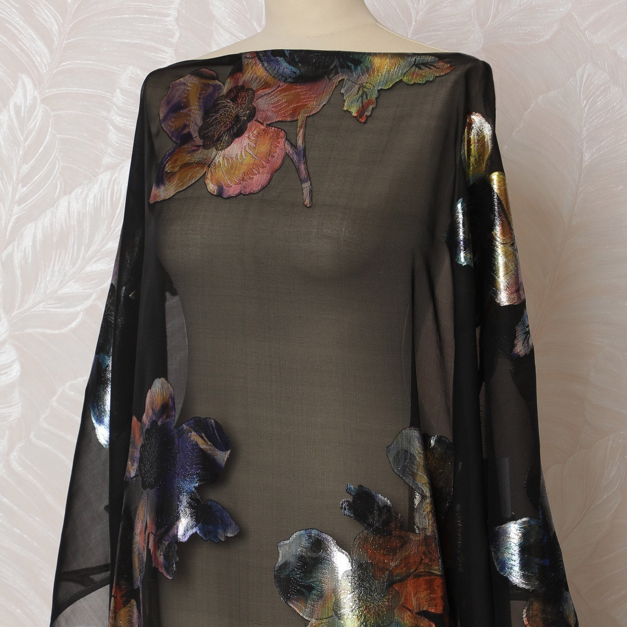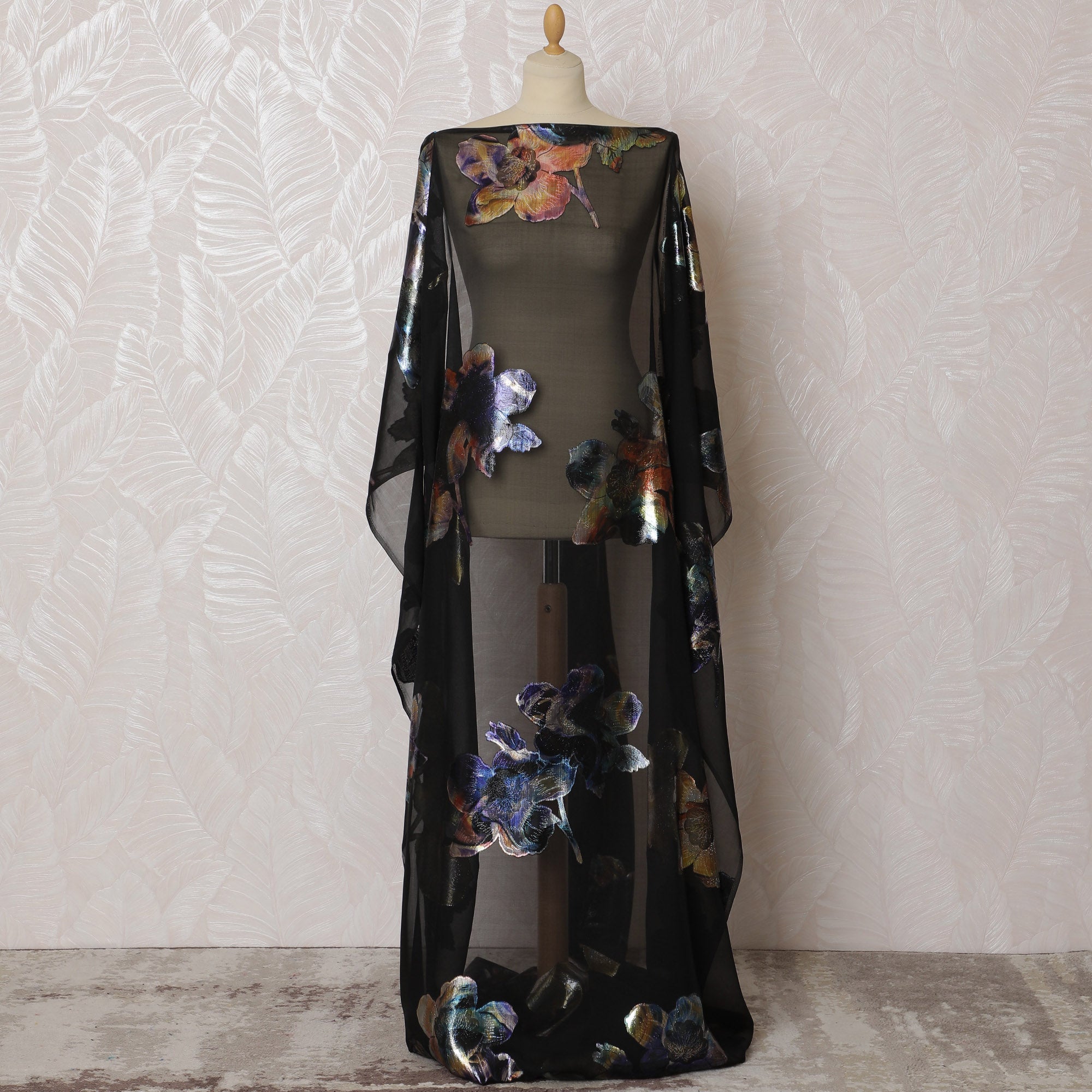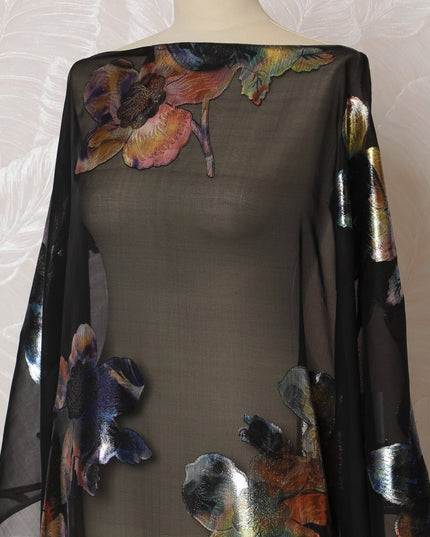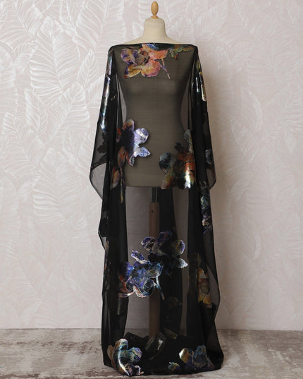 • Elegant Black and Multicolor Floral Pattern Pure French Silk (Fransawi Dirac) Chiffon Fabric – 140 cm Wide X 3.5 Mtrs-D19831
