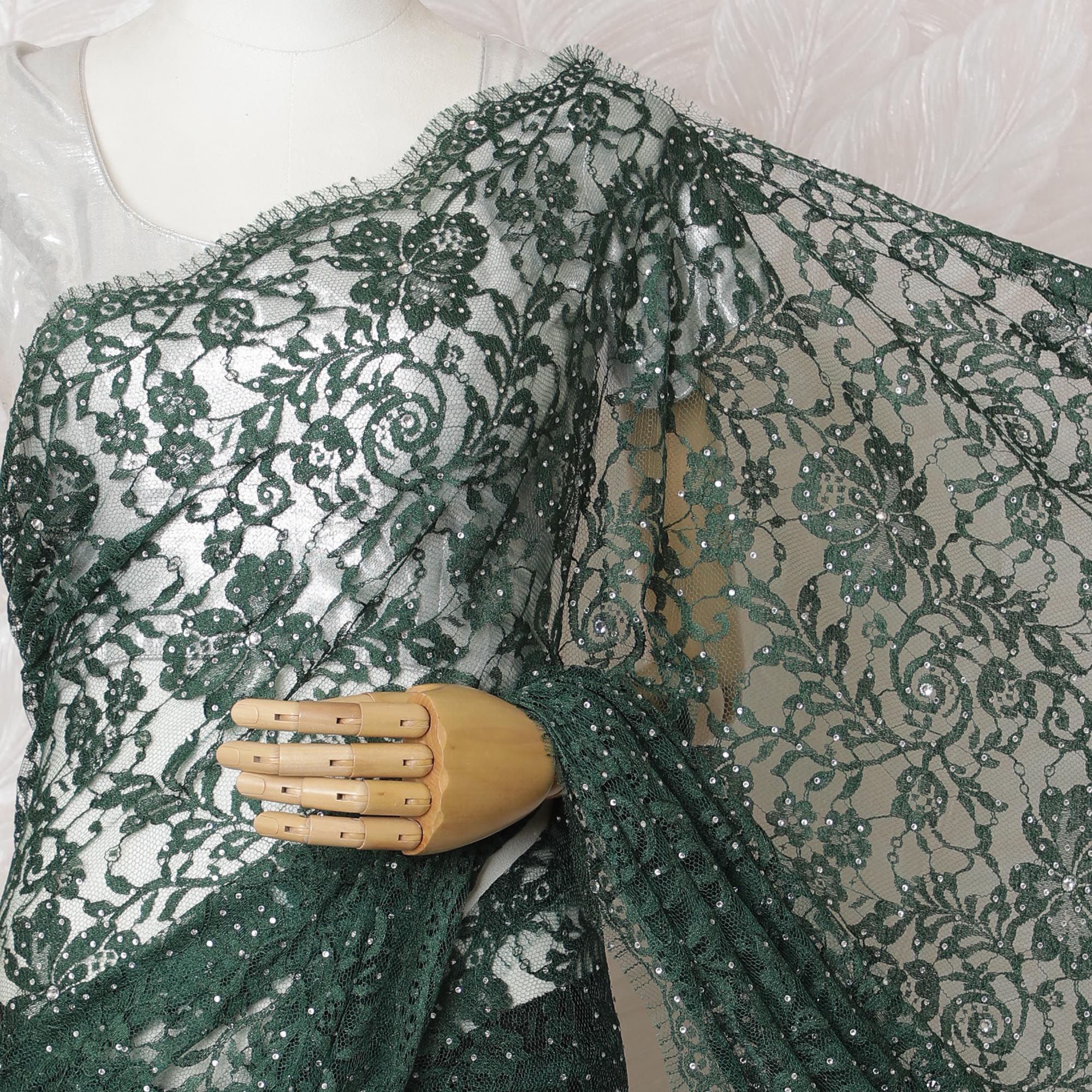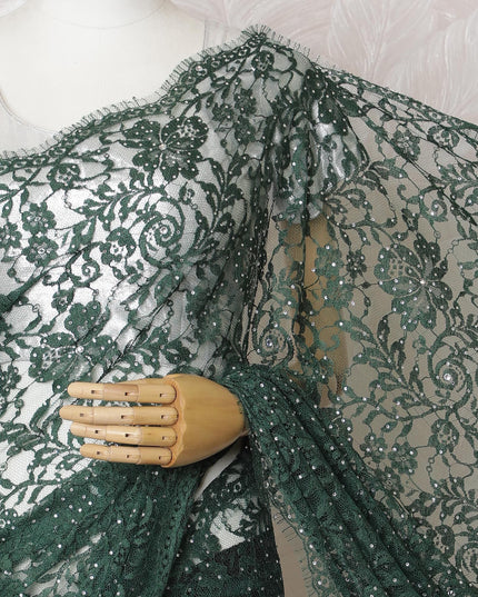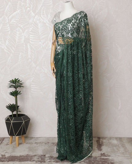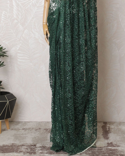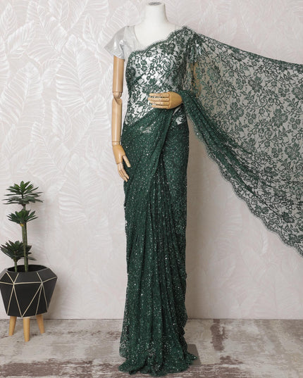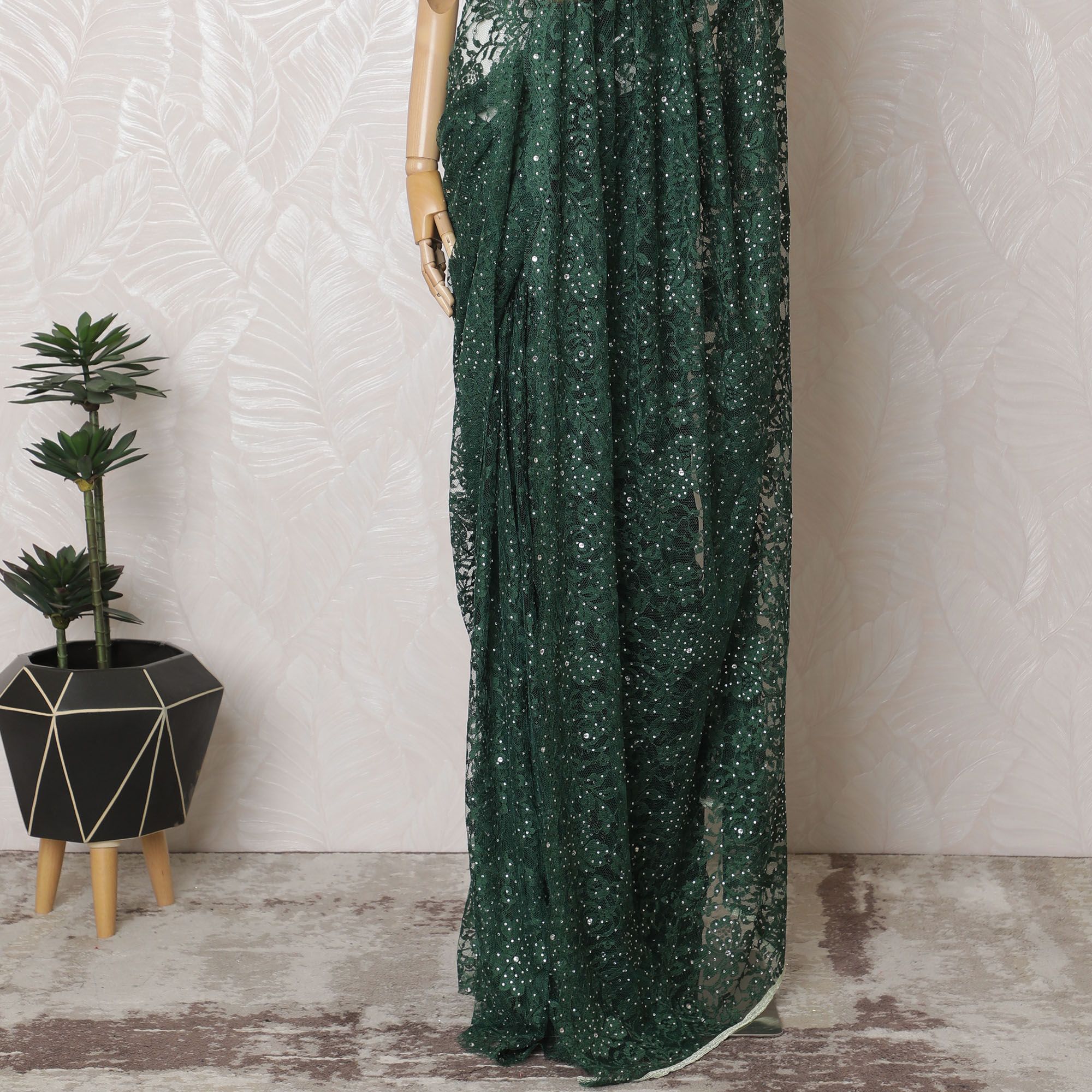 Wrap yourself in the splendor of our Emerald Enchantment French Chantilly Lace Saree, a dazzling creation spanning 5.5 meters in length and 110 cm in width. Inspired by the lush vibrancy of an emerald, this saree is interwoven with threads that catch the light with every movement, enhanced by delicate stone work for an elegant sparkle. The time-honored art of Chantilly lace-making is evident in the exquisite detailing and luxurious texture. Crafted in the heart of France, this piece speaks volumes of both tradition and chic modernity. Please note, the saree does not come with a blouse piece, offering you the freedom to style it in your unique way.