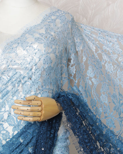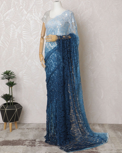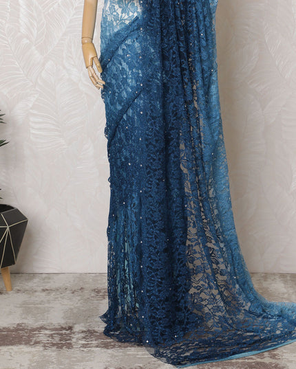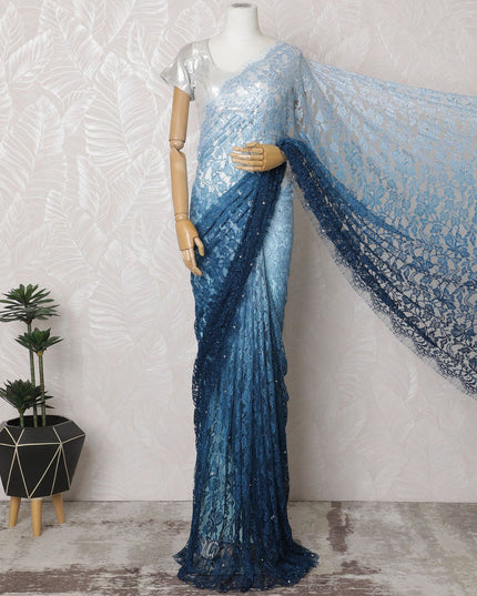 Step into a world of elegance with our Ombre Blue French Chantilly Lace Saree, a garment that beautifully fuses the charm of classic lace with the mystique of modern design. Crafted in France, this exquisite saree spans a length of 5.5 meters and a width of 110 cm, making it an embodiment of both luxury and grace. The ombre effect transitions from a light ethereal blue to a deep, oceanic hue, reflecting the saree's versatility and depth. Intricate stone work is scattered across the fabric, catching the light and enhancing the elaborate lace patterns. This saree is sold without a blouse, allowing you the creative freedom to pair it with a personalized blouse design that reflects your individual style.