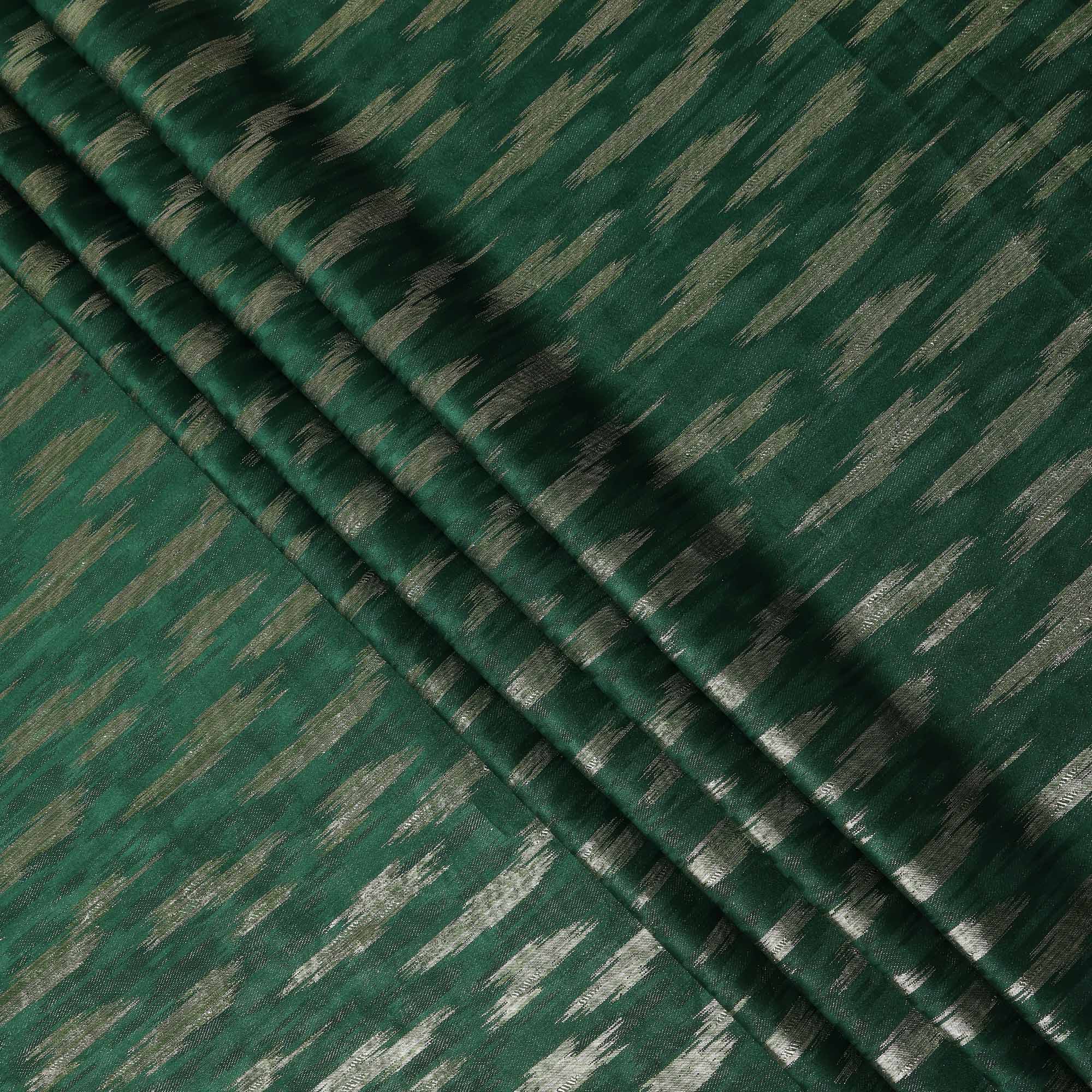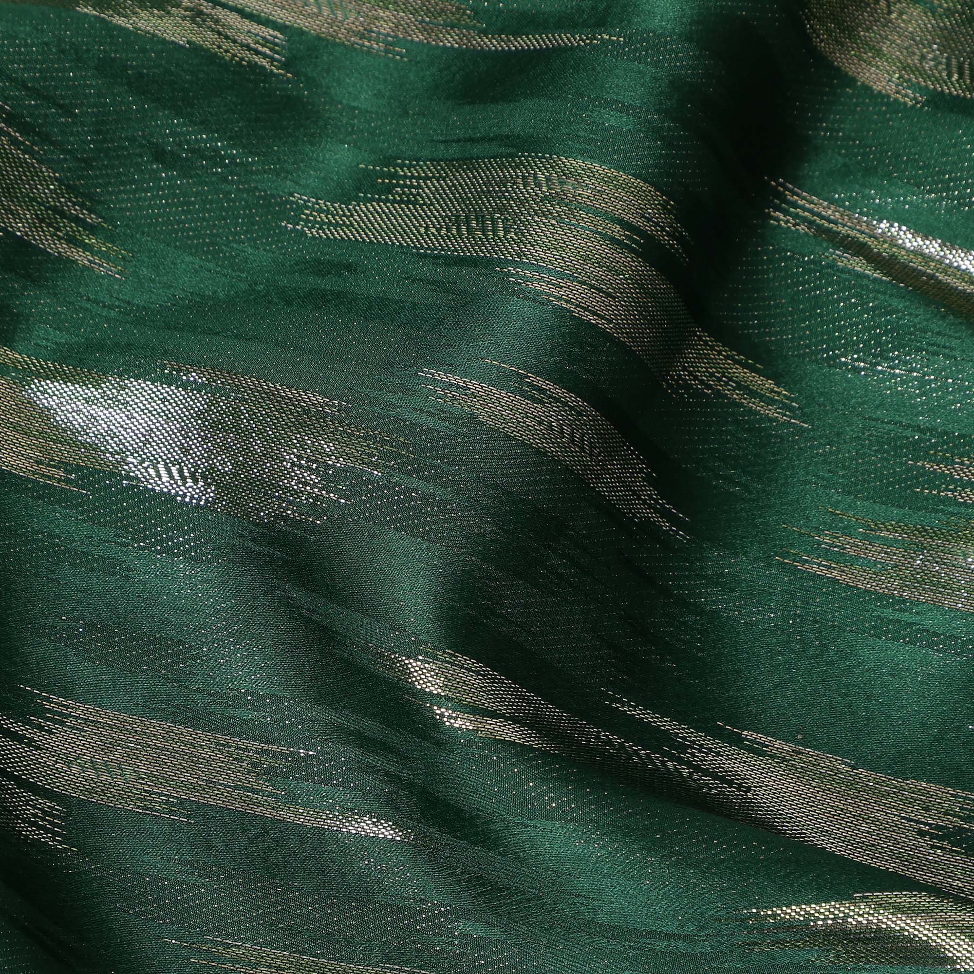 This emerald green abstract textured synthetic chiffon fabric showcases a deep, rich green base enhanced with subtle metallic streaks that create a refined shimmer and contemporary appeal. Crafted from high quality synthetic chiffon, the fabric is lightweight, airy, and soft to the touch, offering an elegant fluid drape that moves gracefully with every fold. Its semi sheer texture makes it ideal for layered silhouettes while maintaining a luxurious look and feel. With a generous width of 140 cms, this fabric is perfectly suited for designing sarees, gowns, dresses, dupattas, overlays, and statement festive or evening wear. Easy to handle and stitch, it holds pleats beautifully and retains its sheen and texture even after repeated use. Ideal for weddings, parties, and special occasions, this fabric blends comfort, durability, and modern style. Made in India, it reflects fine craftsmanship and versatile fashion appeal.