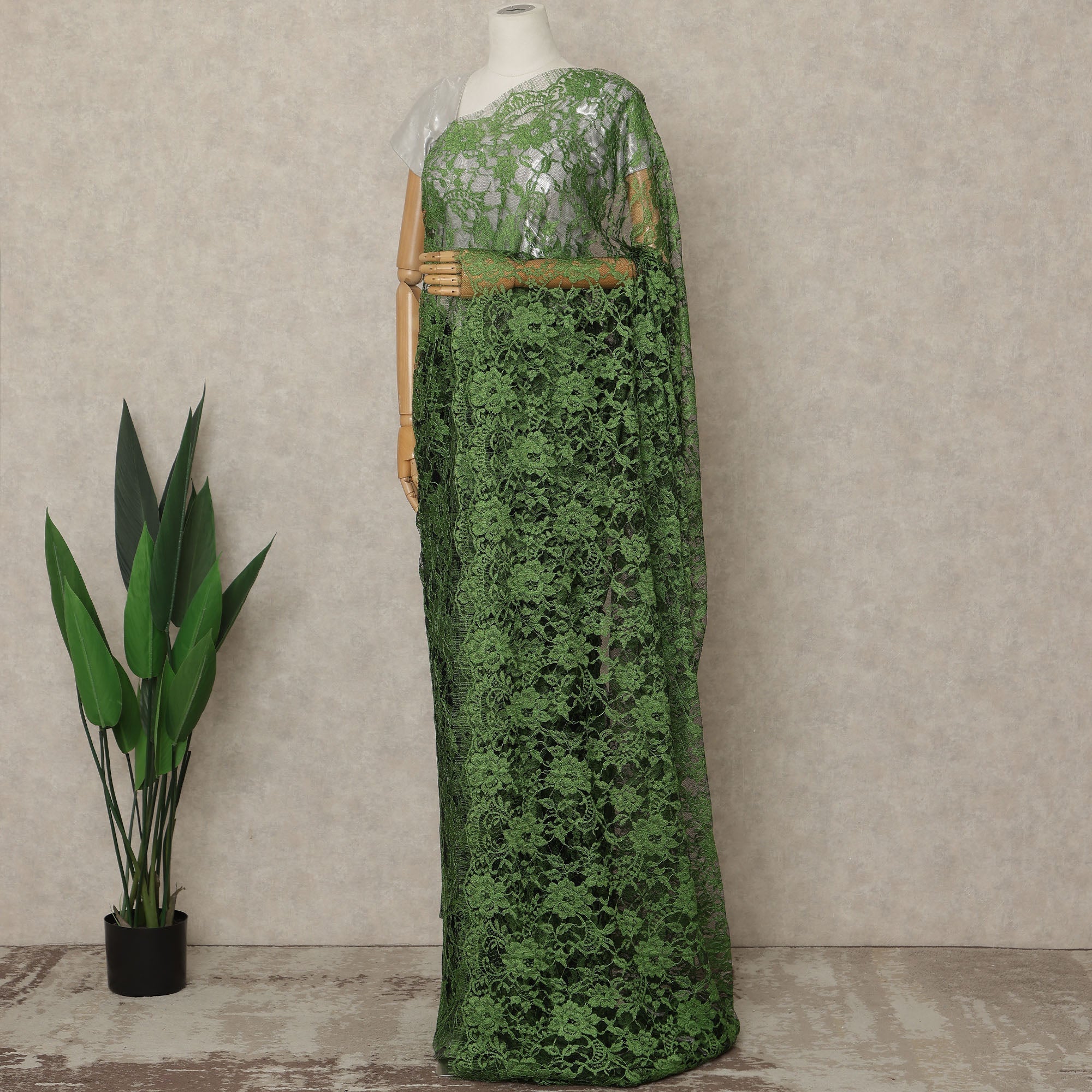 Immerse yourself in the luxurious depth of this Emerald Green Premium French 2-Tone Chantilly Lace Saree, exquisitely crafted in France to showcase the ethereal beauty of Chantilly lace elevated with a rich two-tone effect that adds dimension, texture, and radiant elegance; the vibrant emerald green shade beautifully enhances the intricate floral lace patterns, creating a bold yet sophisticated look perfect for weddings, receptions, festive gatherings, cultural celebrations, and glamorous evening events; crafted with superior Regal Fabrics craftsmanship, the saree features a feather-light, fluid drape that ensures comfort and graceful movement all day or night, creating a sculpted silhouette that embodies refined luxury; measuring approximately 5.5 meters in length and 110 cms in width, it offers versatile draping options to suit traditional and contemporary styling, while the absence of an included blouse grants full freedom to personalize your ensemble with complementing or contrasting fabrics; ideal for discerning shoppers who love to buy exclusive designer sarees online, this French 2-tone Chantilly creation blends European artistry with modern sophistication; to maintain its brilliance and intricate lace detailing, dry clean only and store with care.