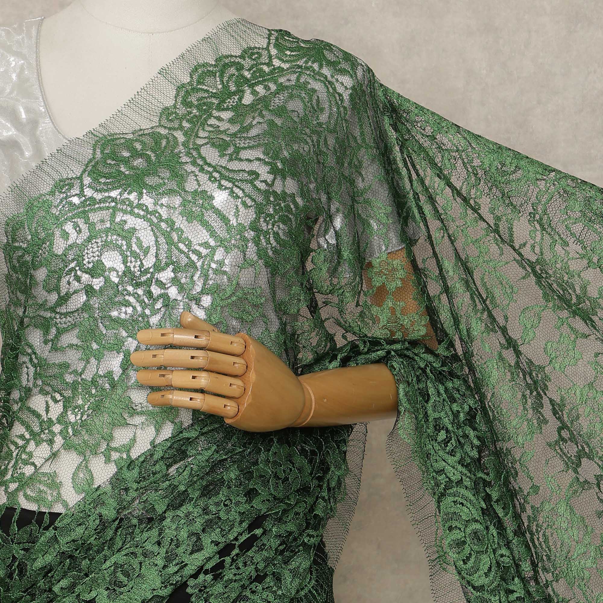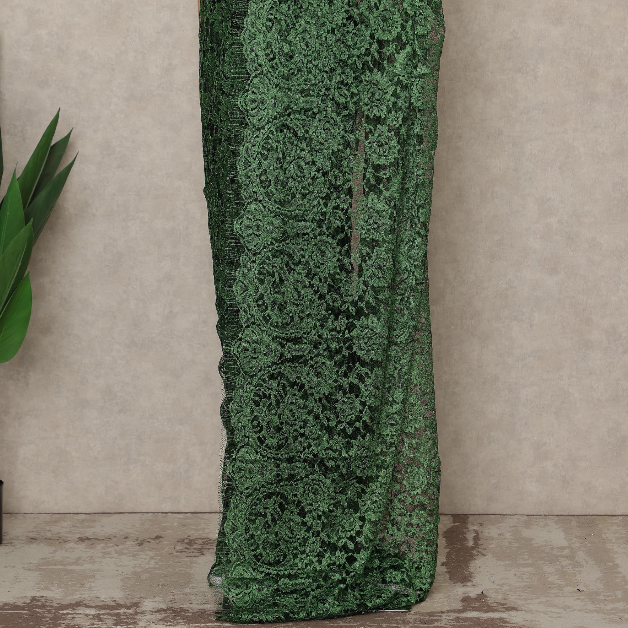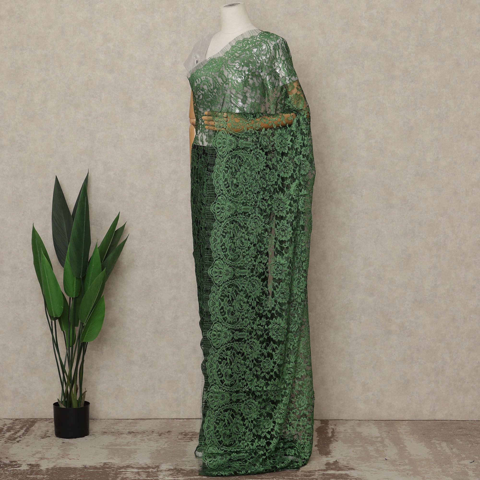 Premium emerald green 2-tone Chantilly lace saree fabric with intricate floral motifs.