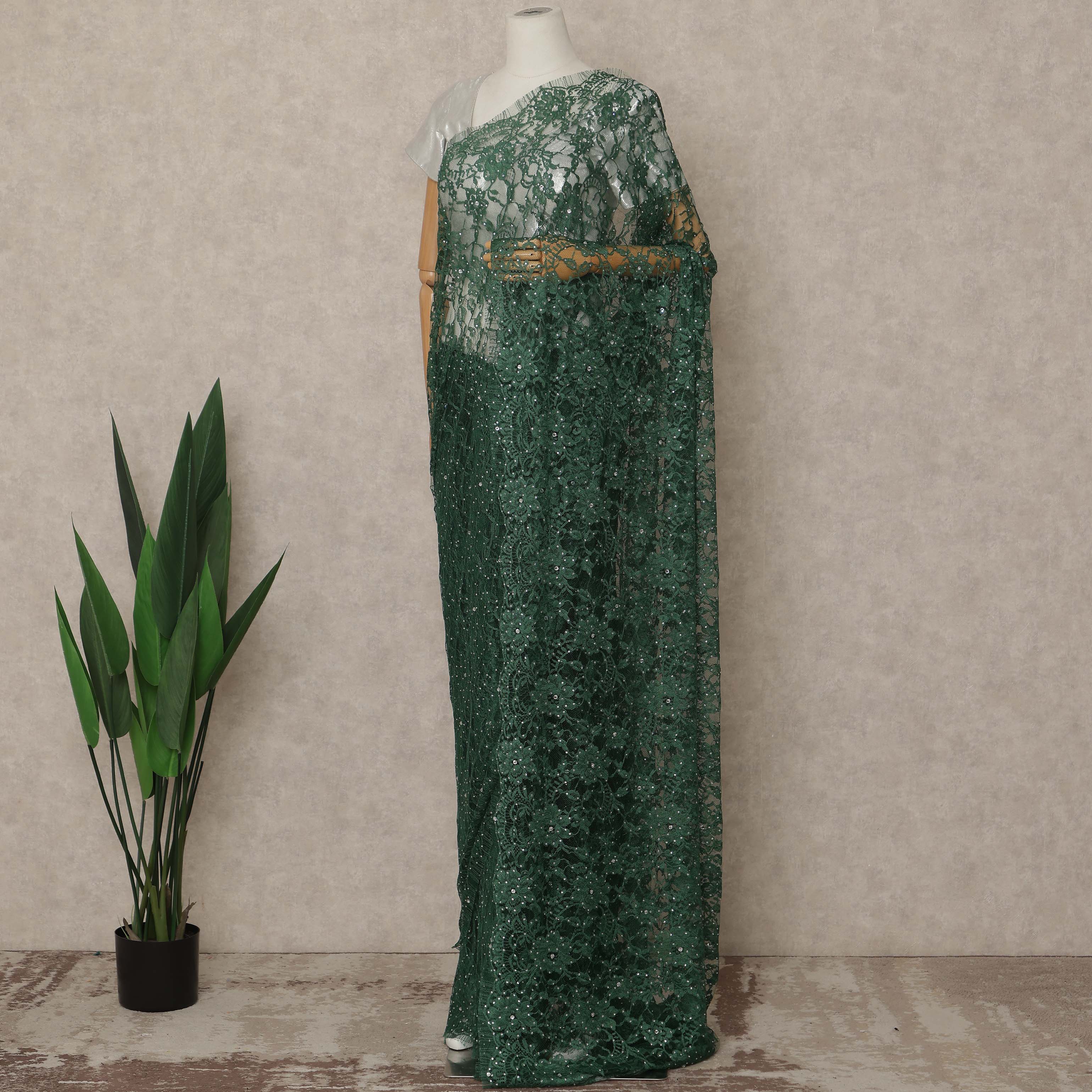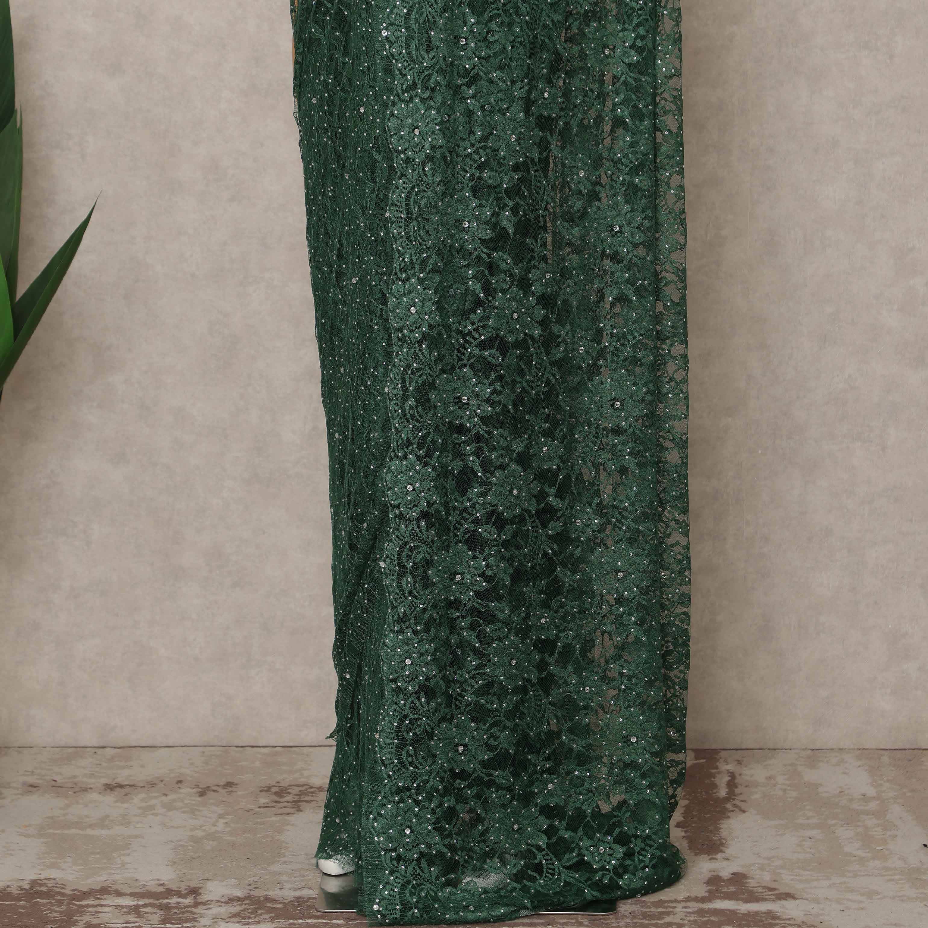 Emerald Green Premium French Chantilly Saree Lace With Stone Work 5.5 Mtrs Length 110 Cms Width Designer Net Fabric Made In France, Blouse Not Included-D28131