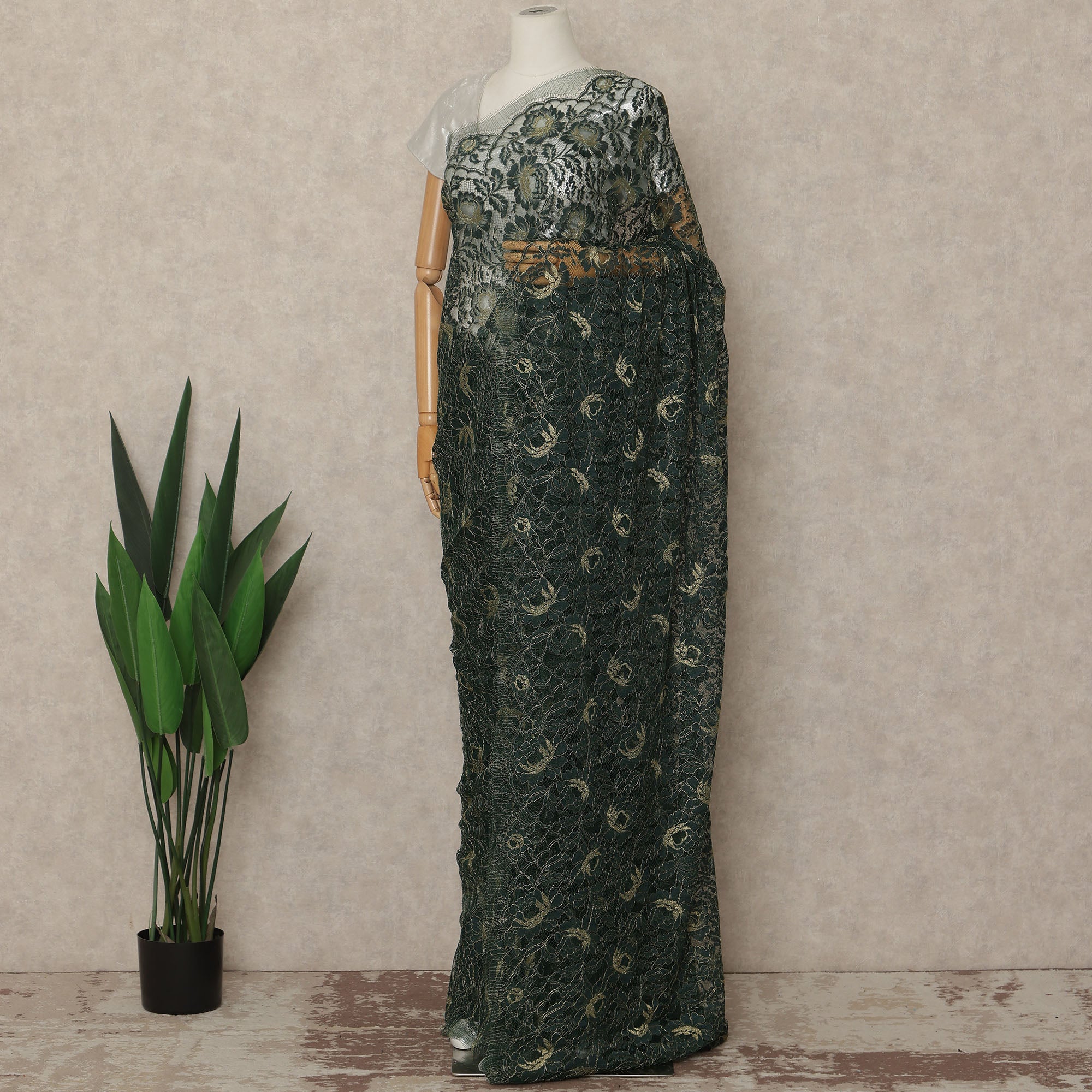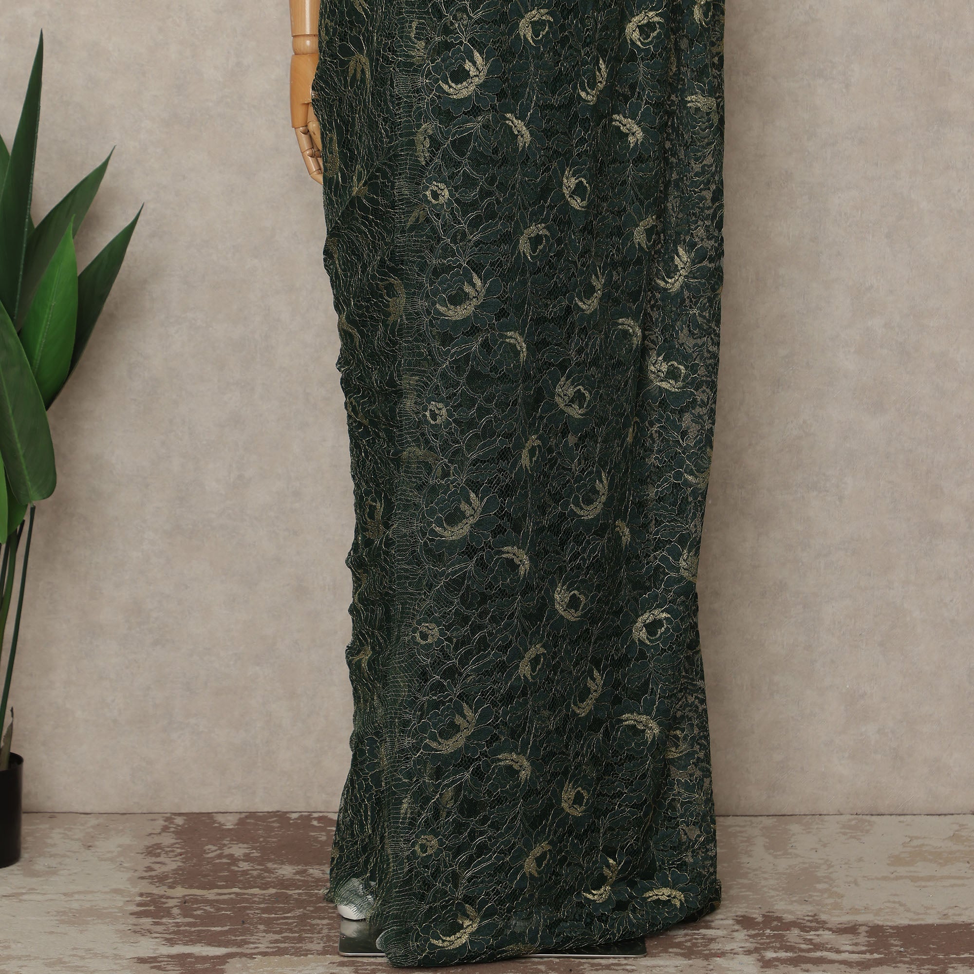 Emerald Green Premium French Metallic Chantilly Saree Lace Fabric 110 Cms Width 5.5 Meters Piece Elegant Floral Net Lace From France For Designer Sarees And Couture Draping-D27675