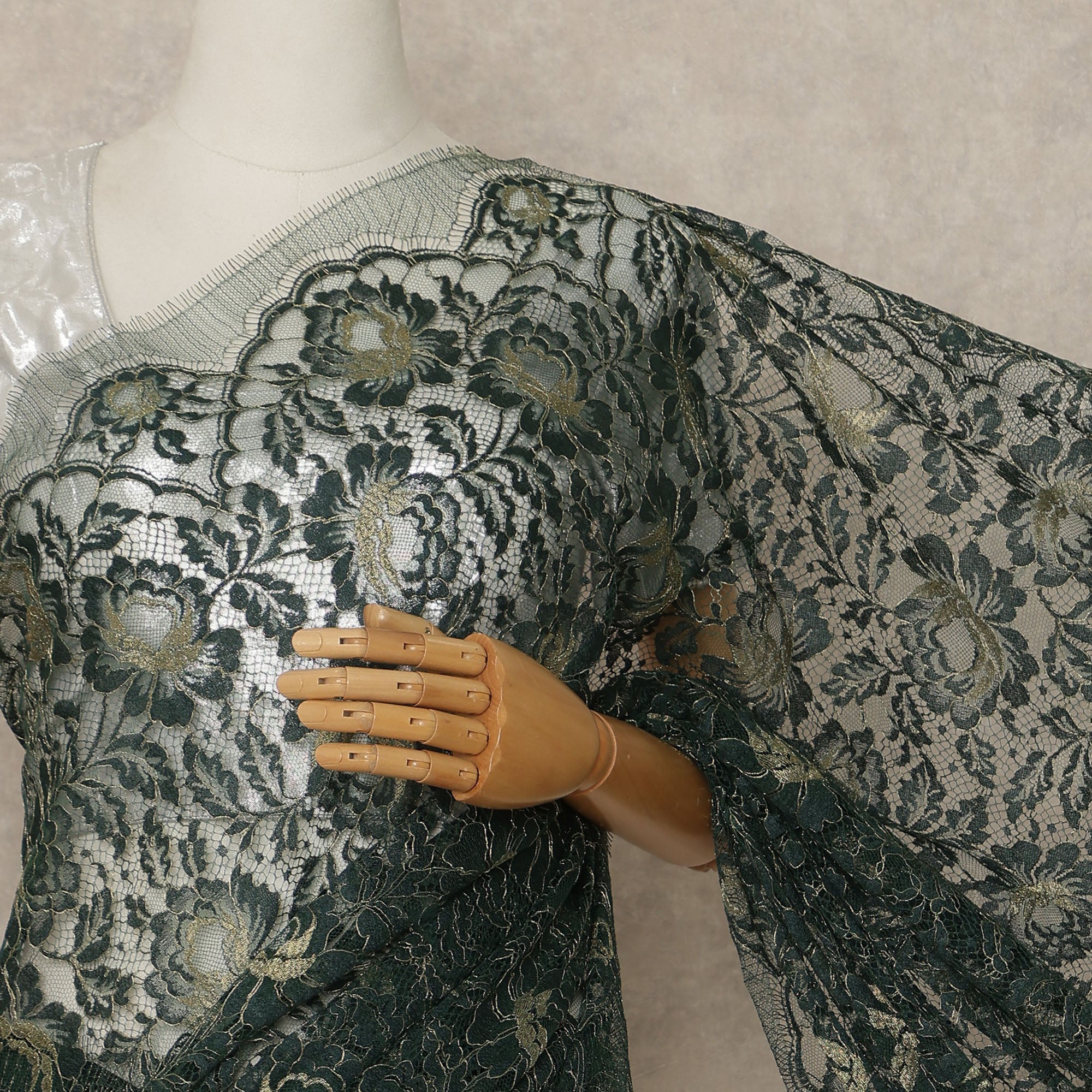 Premium French Chantilly lace with emerald green metallic finish for a rich and elegant appearance