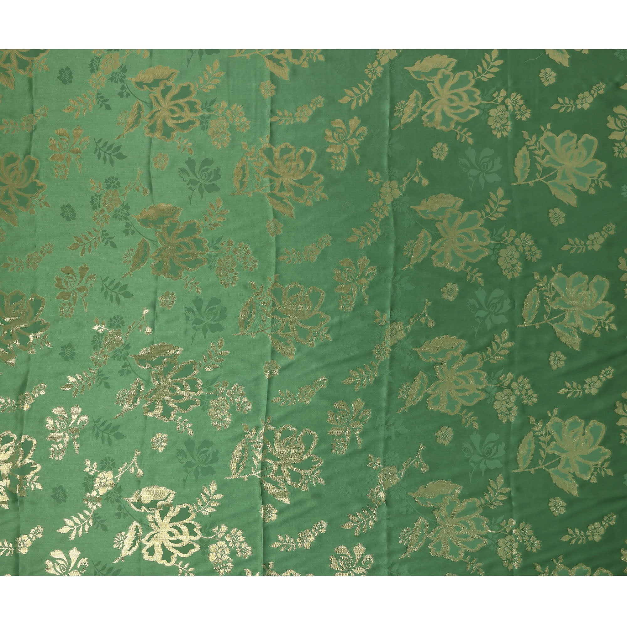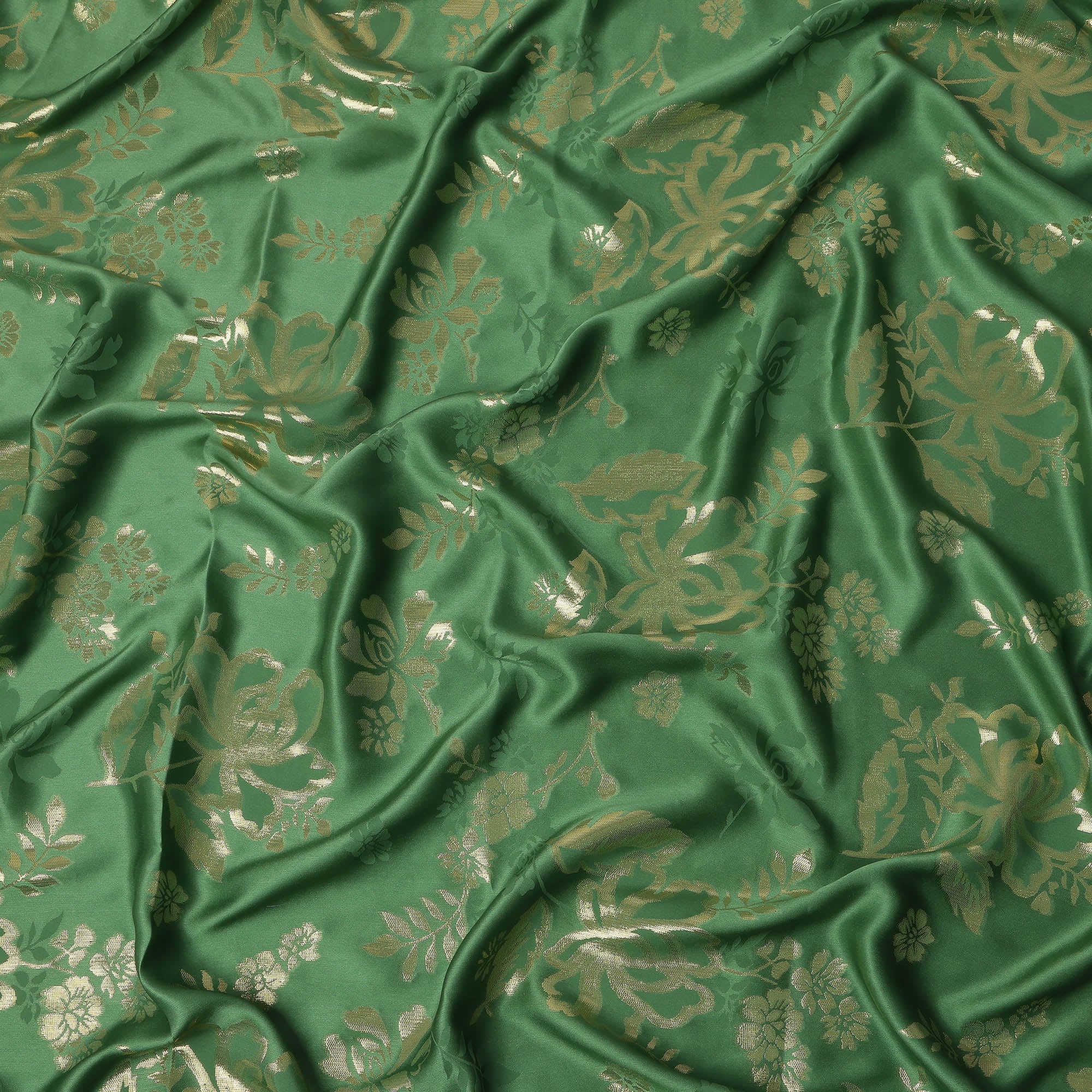 Premium emerald green silk satin fabric with rich metallic floral jacquard weaving.
