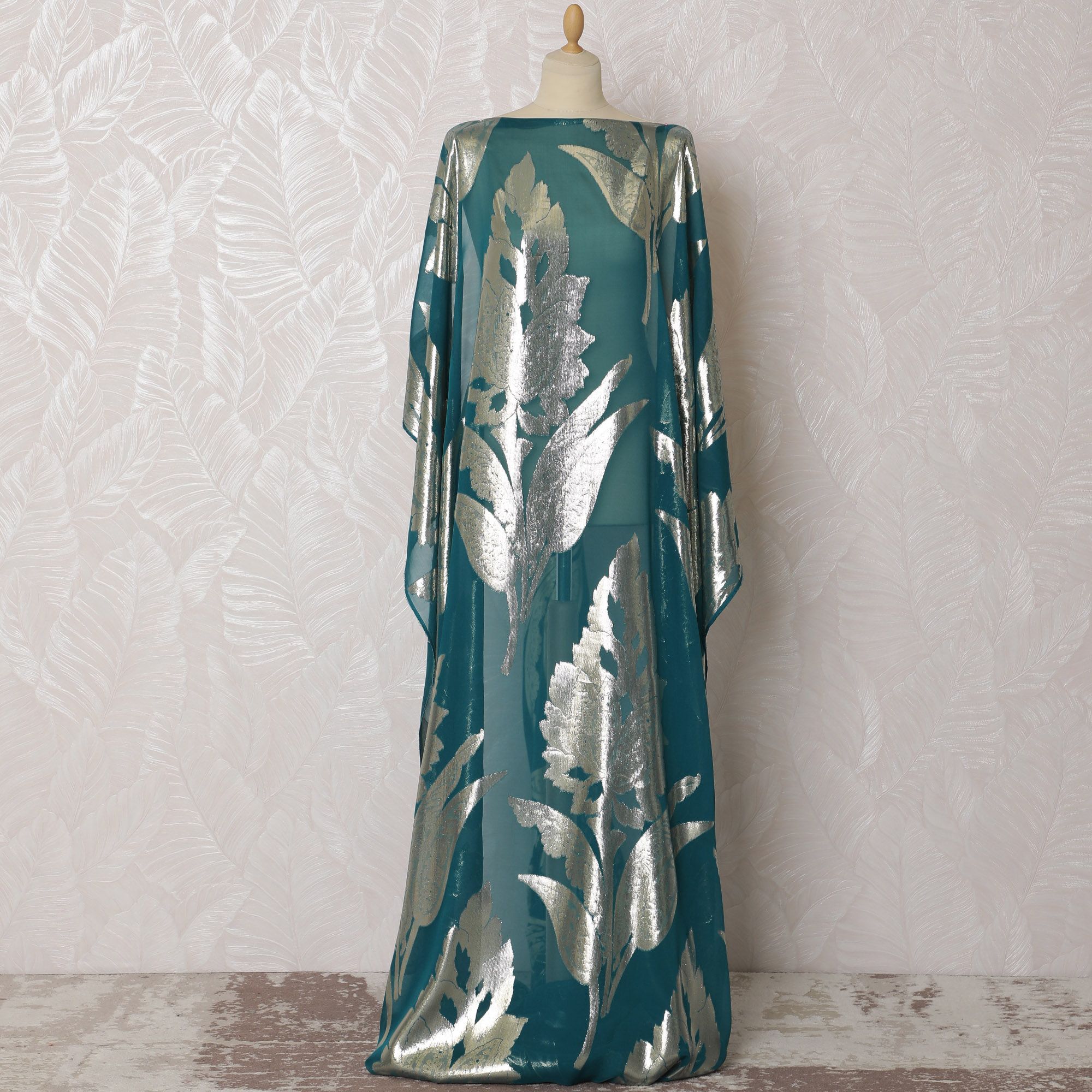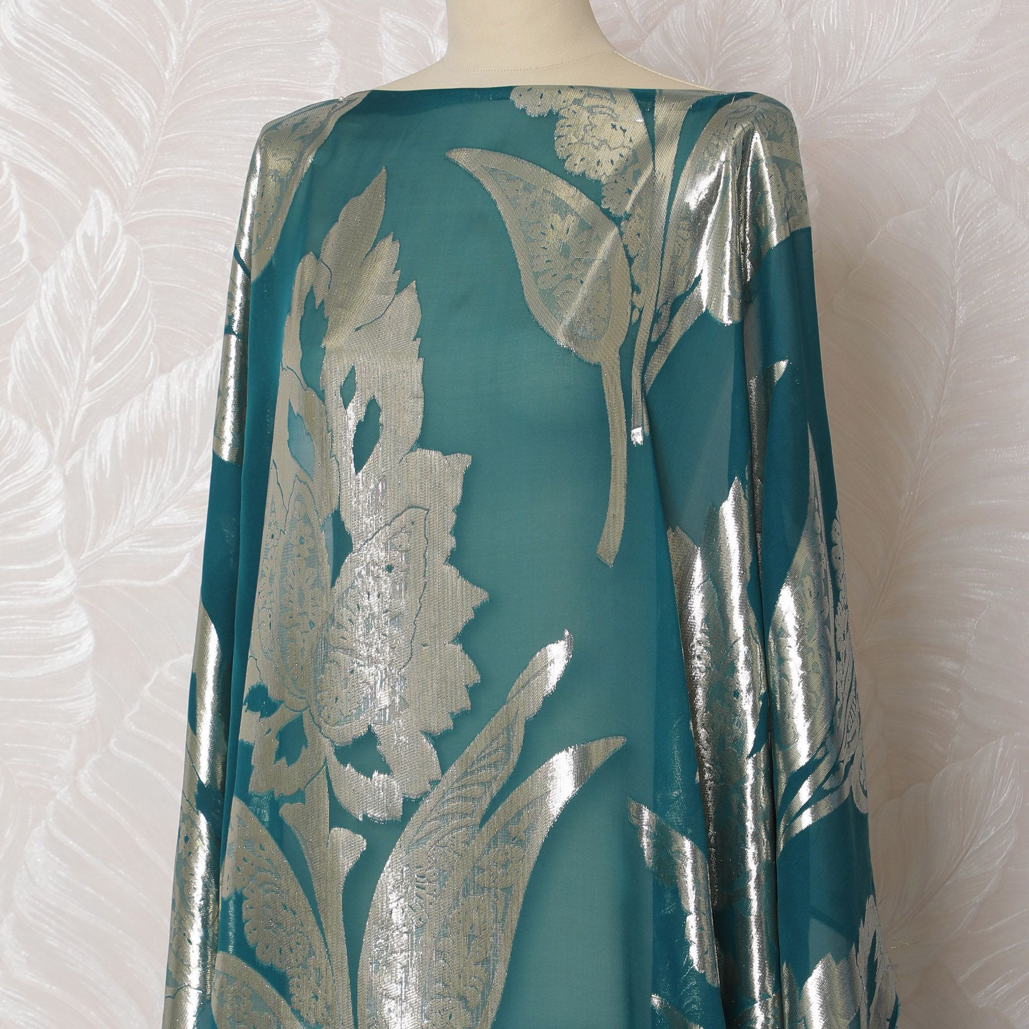 Enchanting emerald green silk chiffon with lustrous silver lurex leaf detailing.