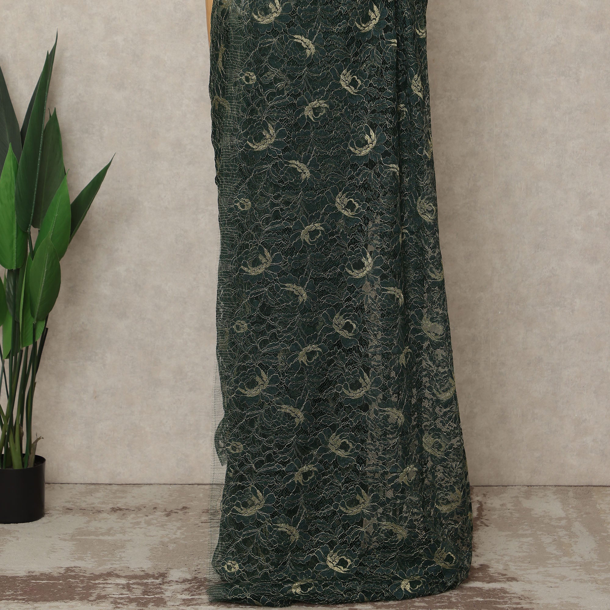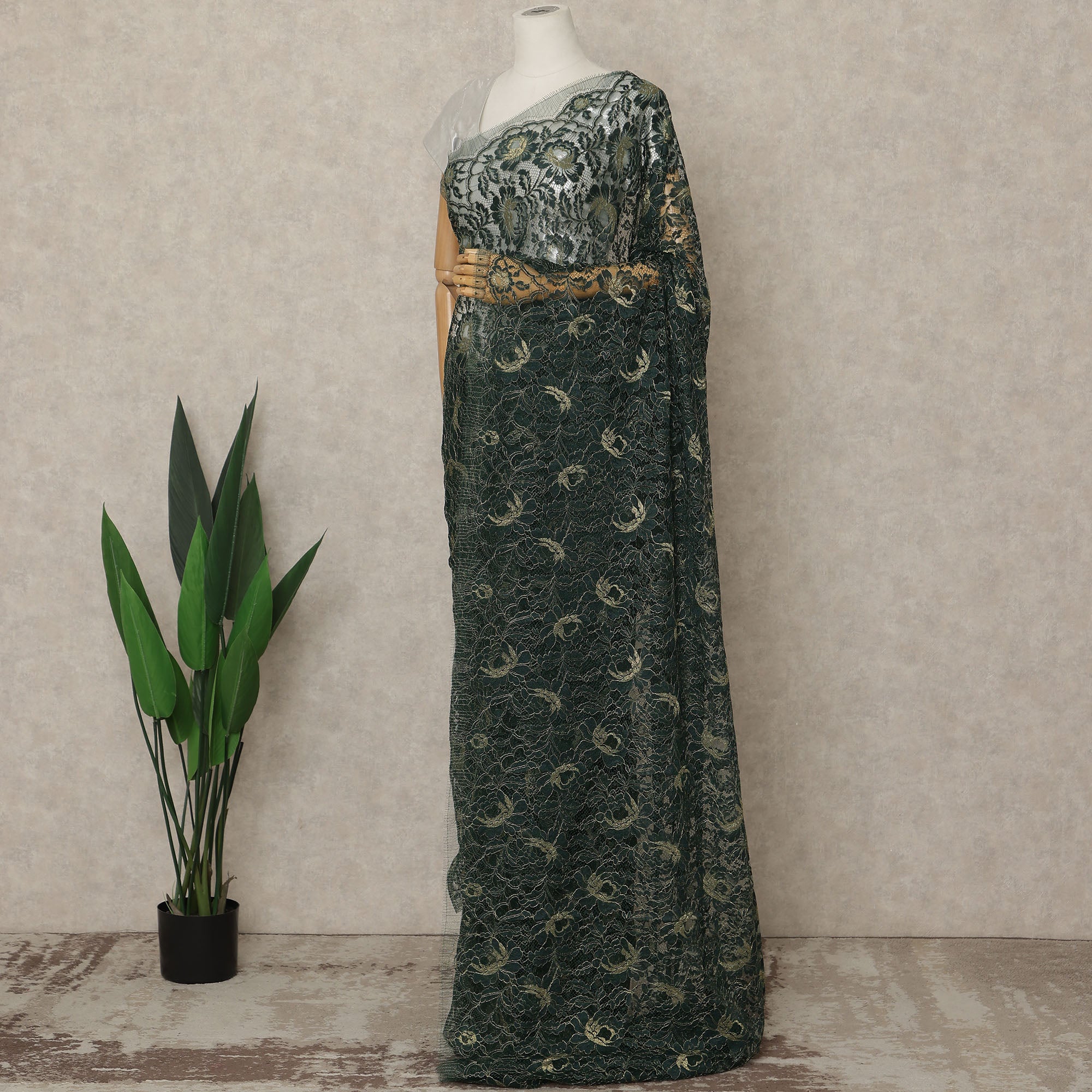 Immerse yourself in the enchanting elegance of this Forest Green Premium French Metallic Chantilly Lace Saree, exquisitely crafted in France to highlight the rich artistry of traditional lace fused with a luxurious metallic sheen; the deep forest-green shade beautifully enhances the intricate floral motifs, while shimmering metallic threads add depth and radiance, making this saree an exquisite choice for weddings, receptions, festive celebrations, and sophisticated evening events; woven with premium Regal Fabrics craftsmanship, the saree drapes gracefully with a feather-light fluidity, offering both comfort and refined charm for day-to-night wear; measuring approximately 5.5 meters in length and 110 cms in width, it provides versatile styling options, and since the blouse is not included, you can customize your look with contrasting or complementing fabrics to suit any occasion; perfect for those who love to shop online for exclusive designer sarees, this French Chantilly creation showcases the elegance of heritage craftsmanship paired with modern luxury; ensure longevity by dry cleaning only and storing carefully to preserve its intricate lace detailing and metallic brilliance.