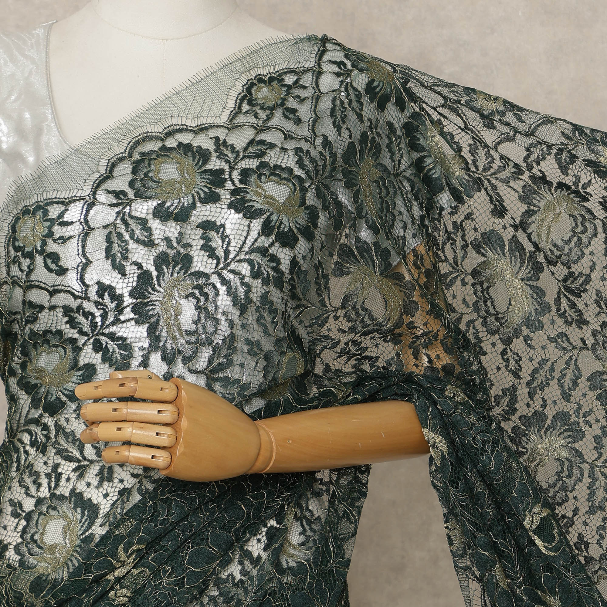 Premium French Metallic Chantilly lace in an elegant forest green tone.