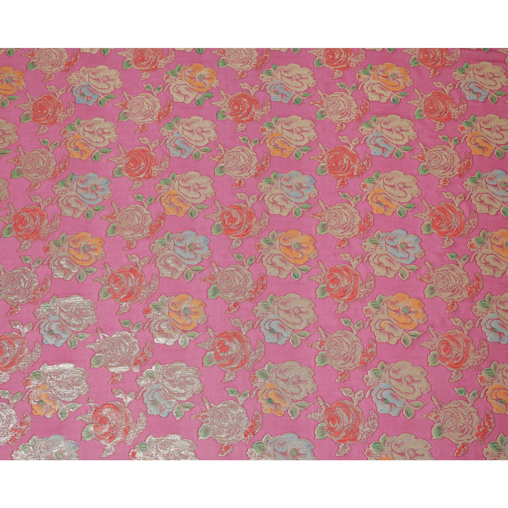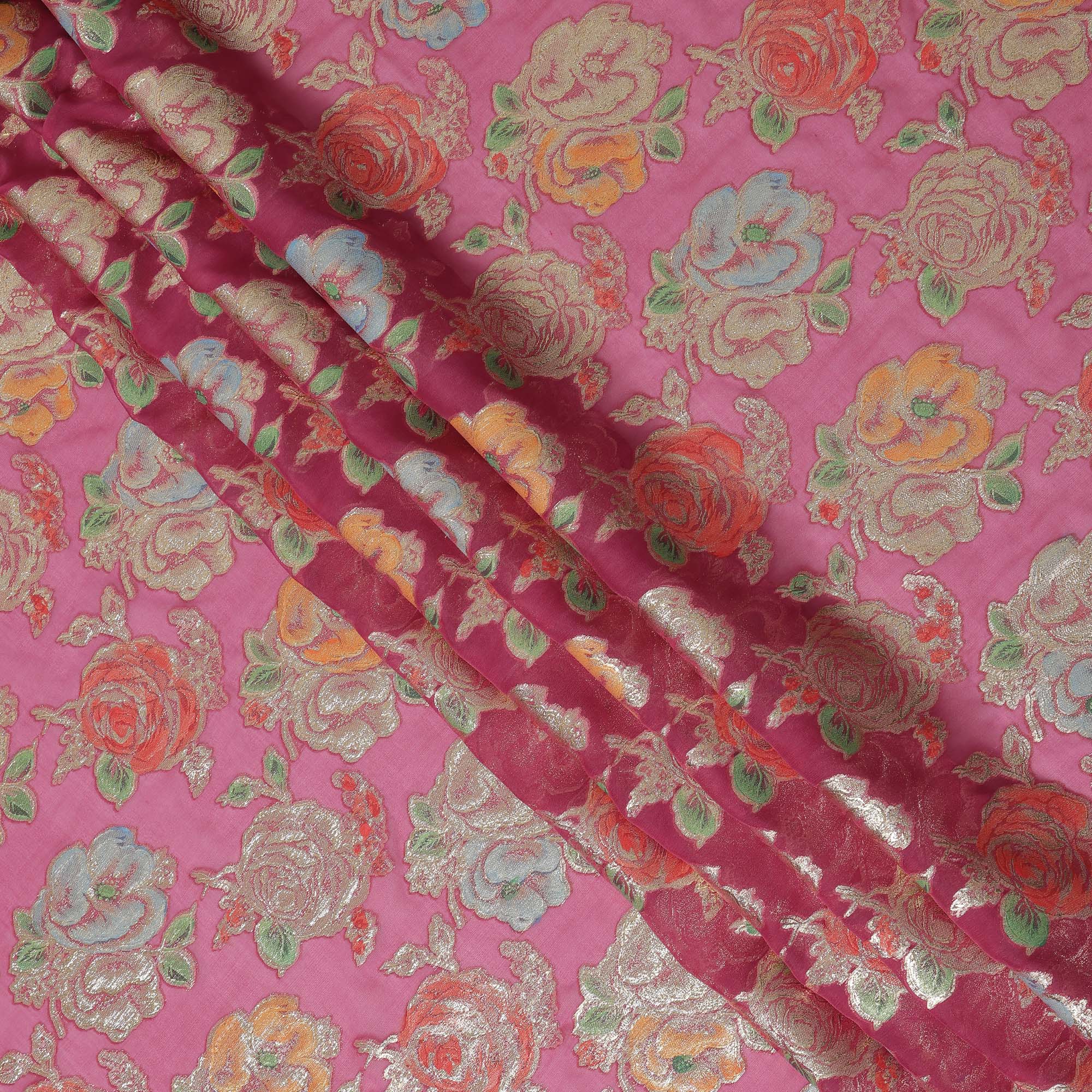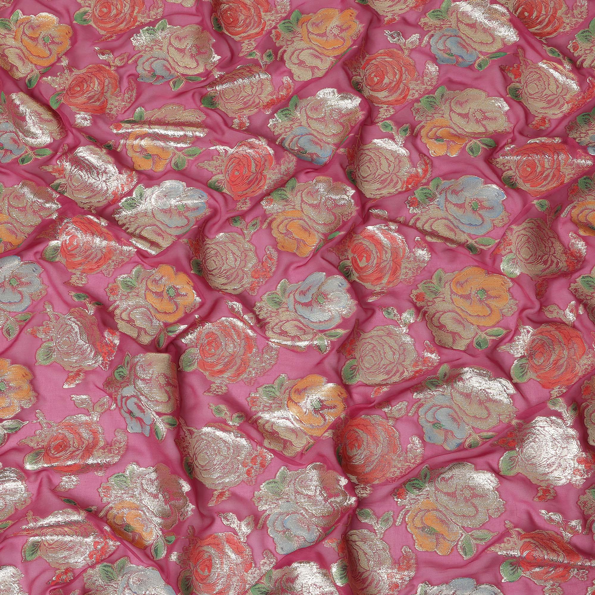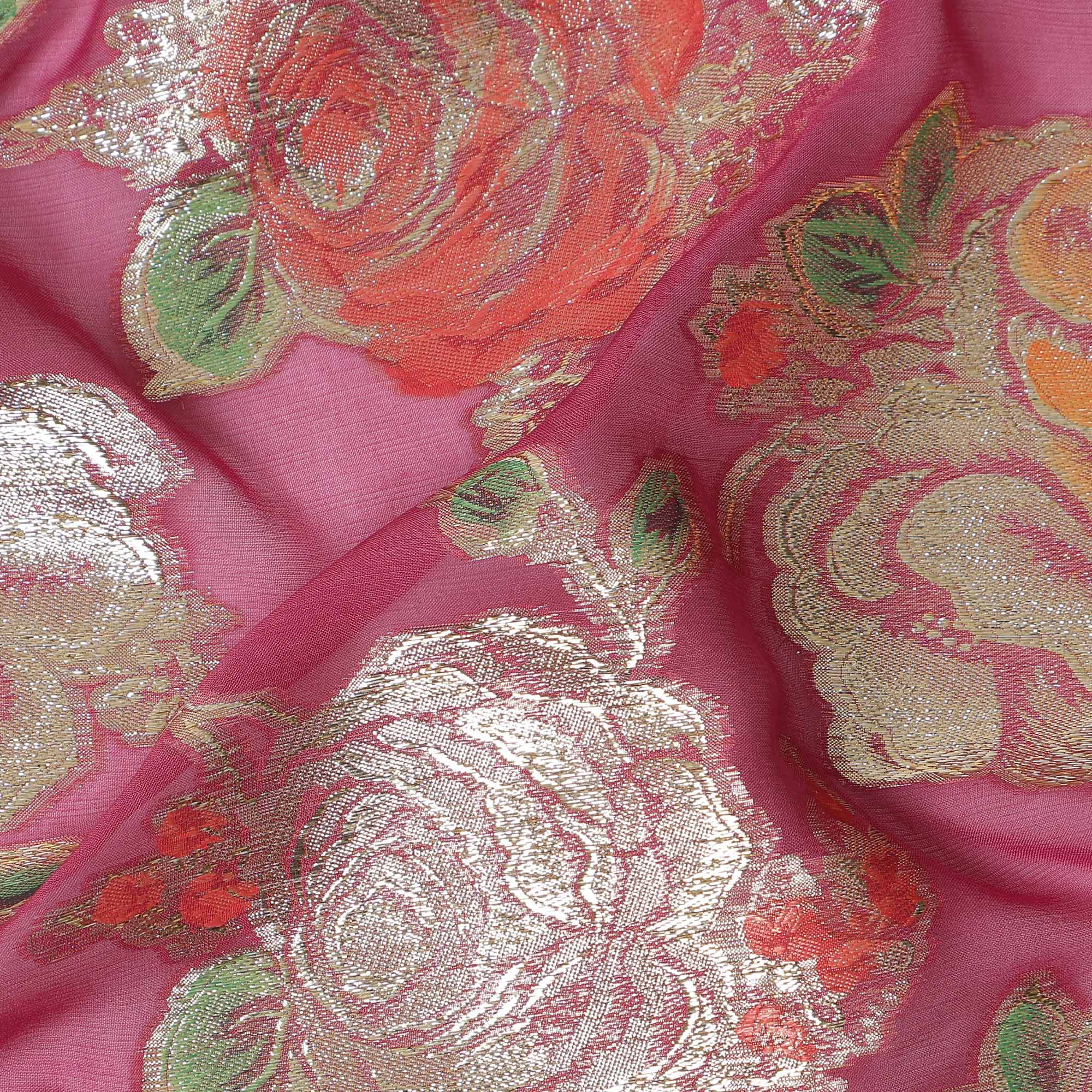 Fuchsia Pink Multicolor Floral Metallic Lurex Design Premium Silk Chiffon Fabric, 110 Cms Width, Made in South Korea-D25749