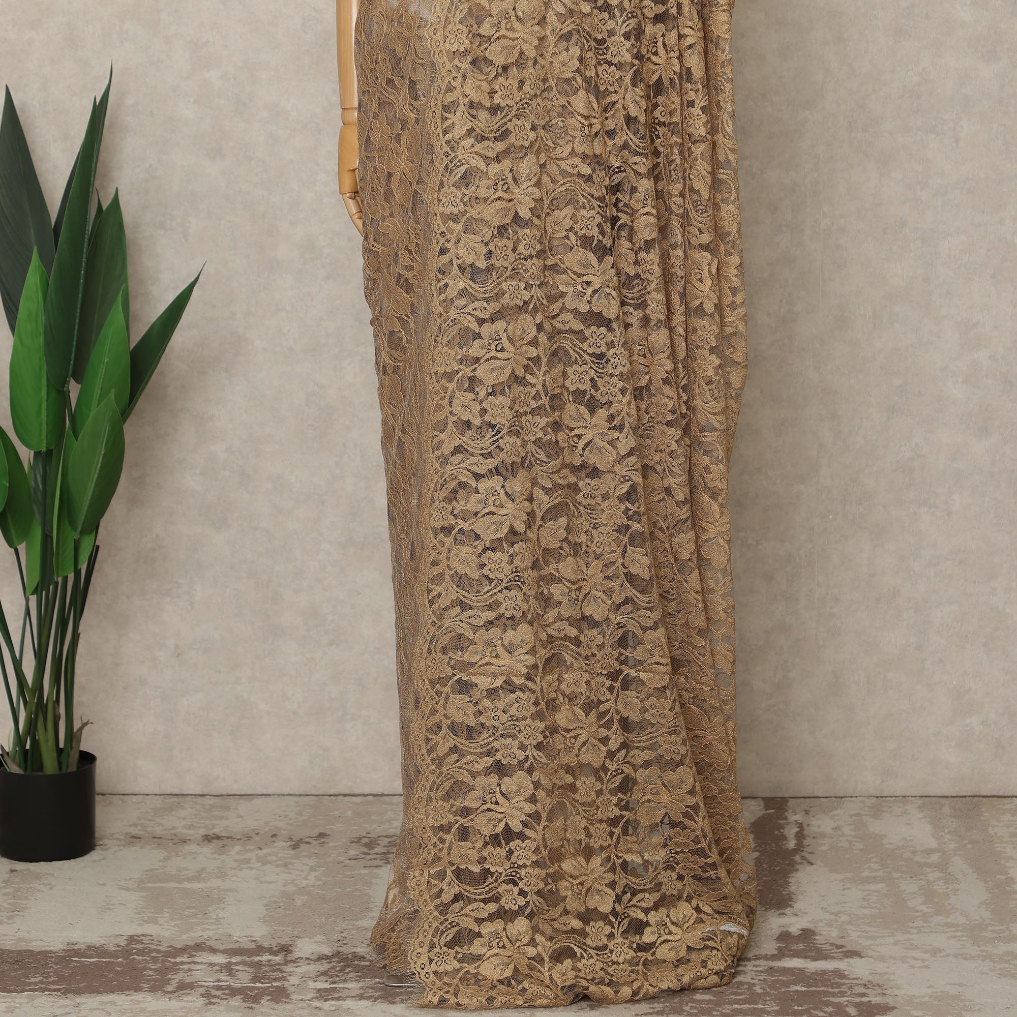 Elegant gold two-tone Chantilly lace crafted with intricate floral motifs.